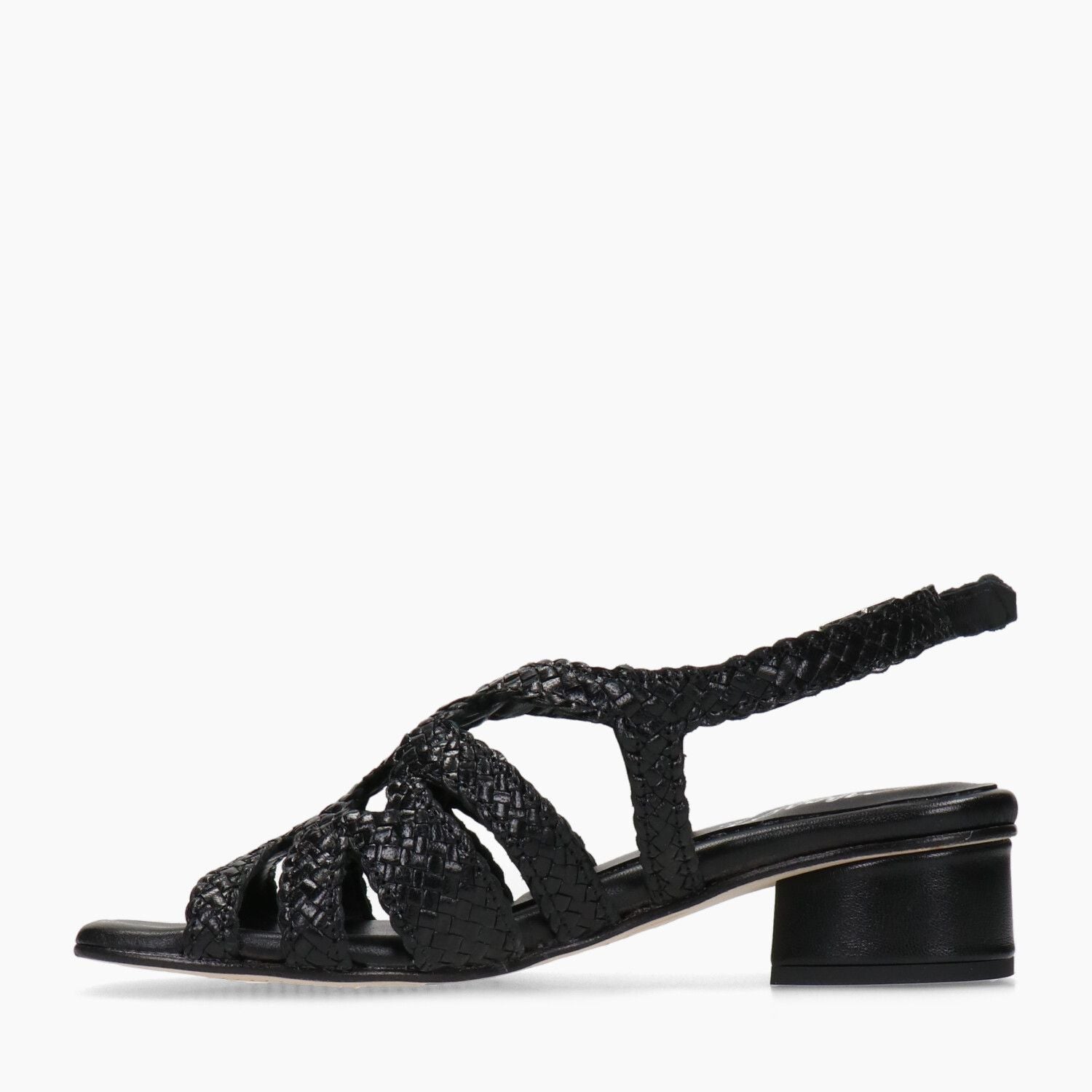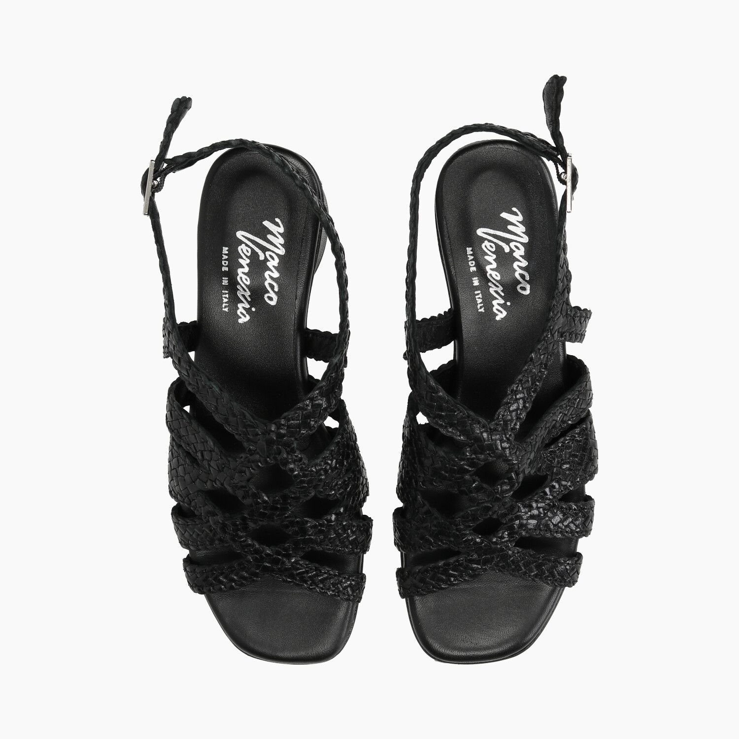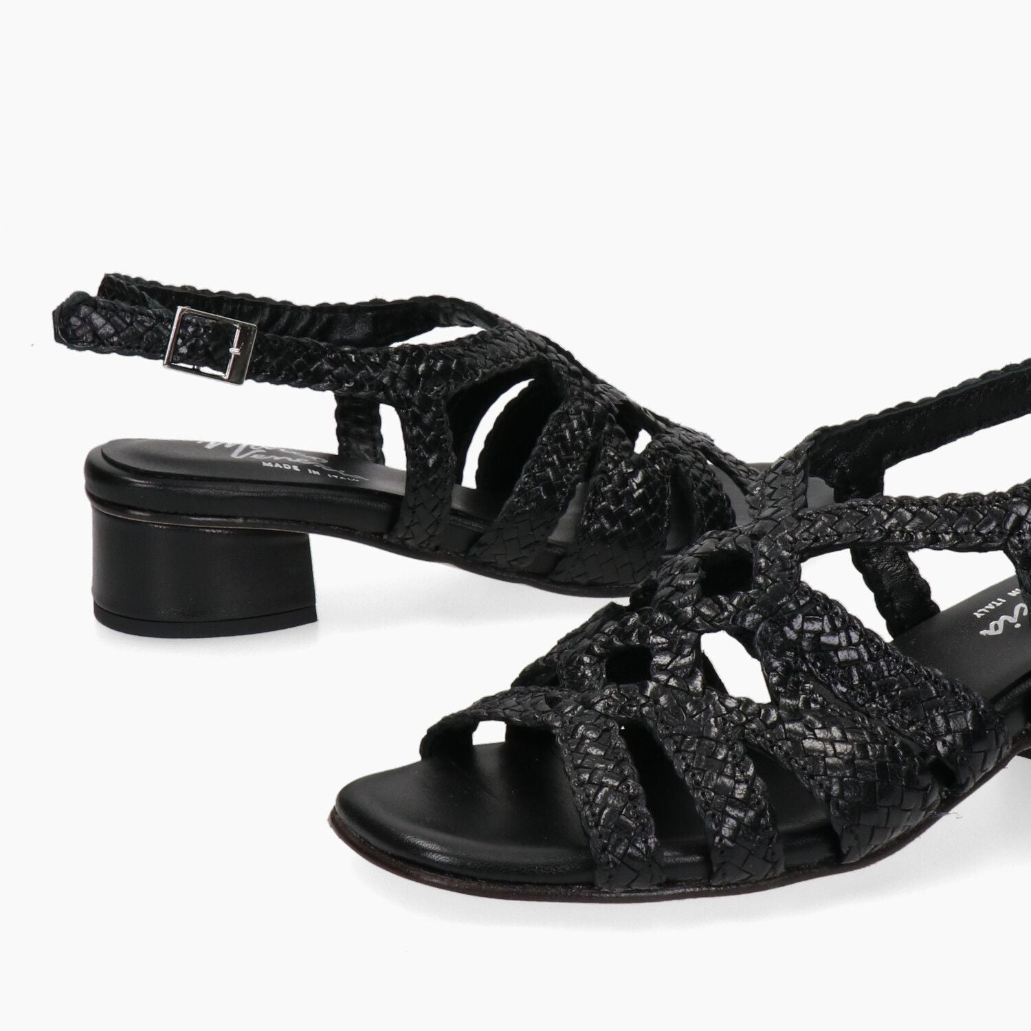 Sandali in pelle intrecciata nero, fondo gomma.