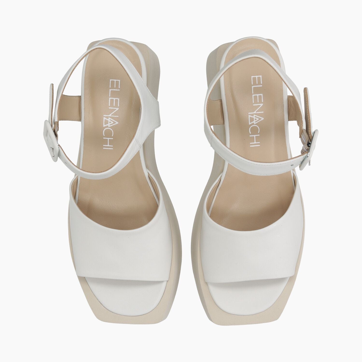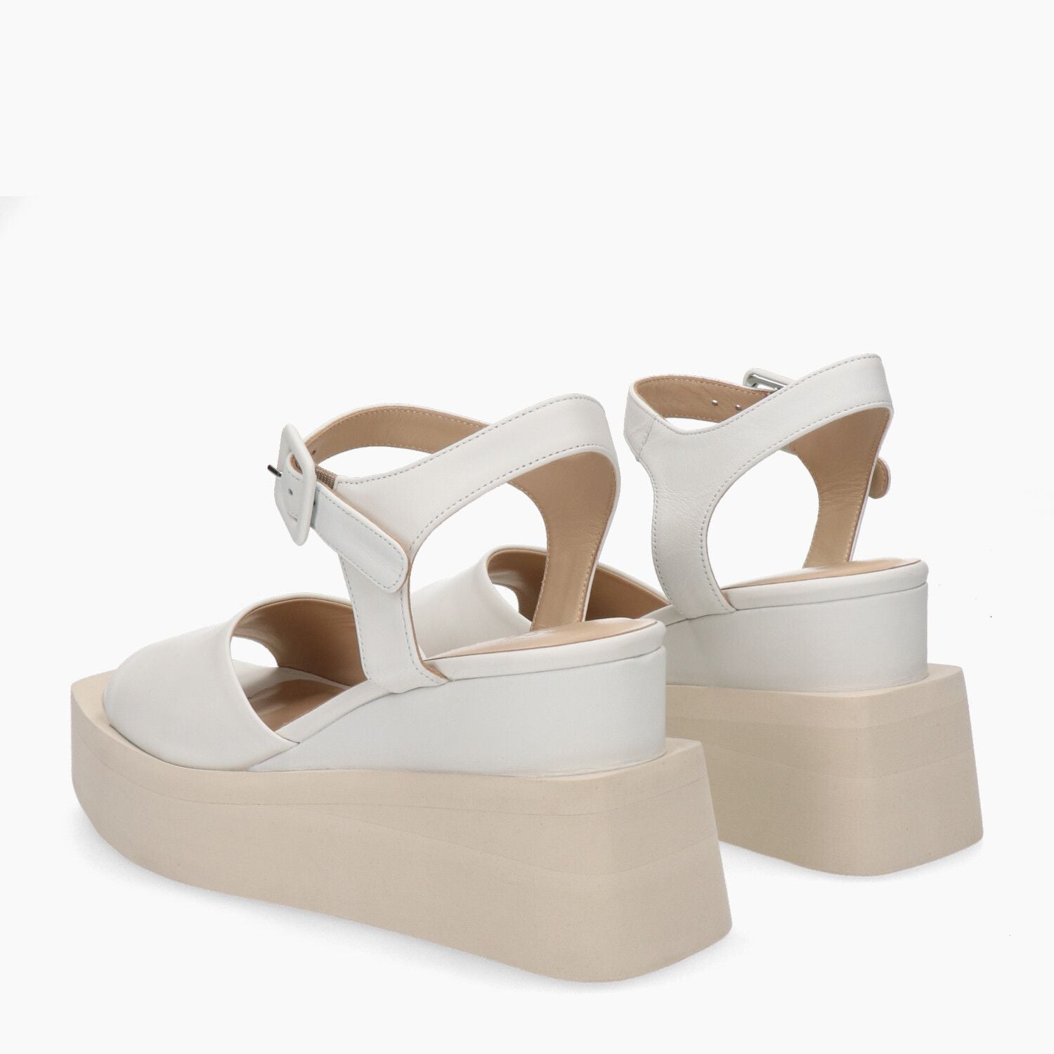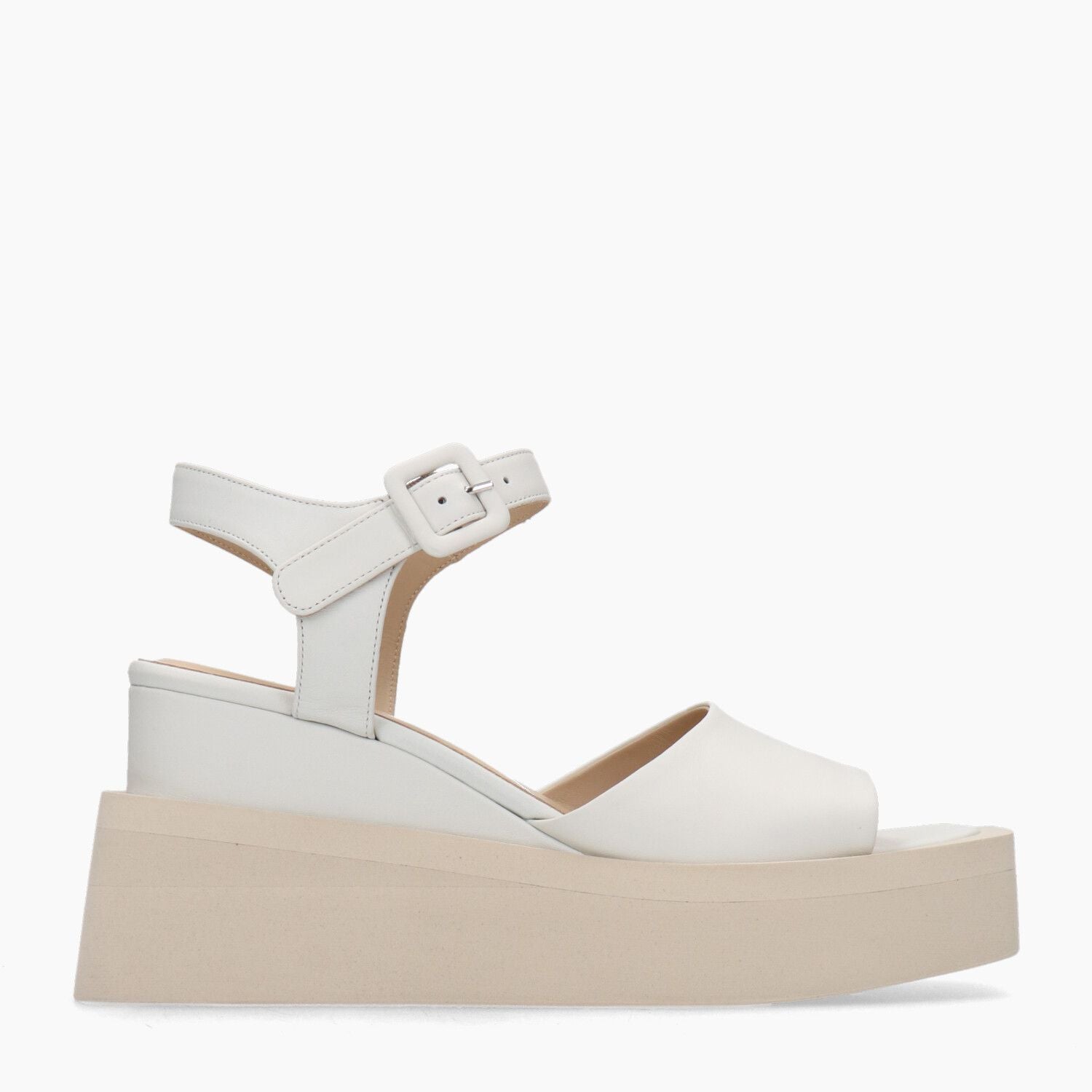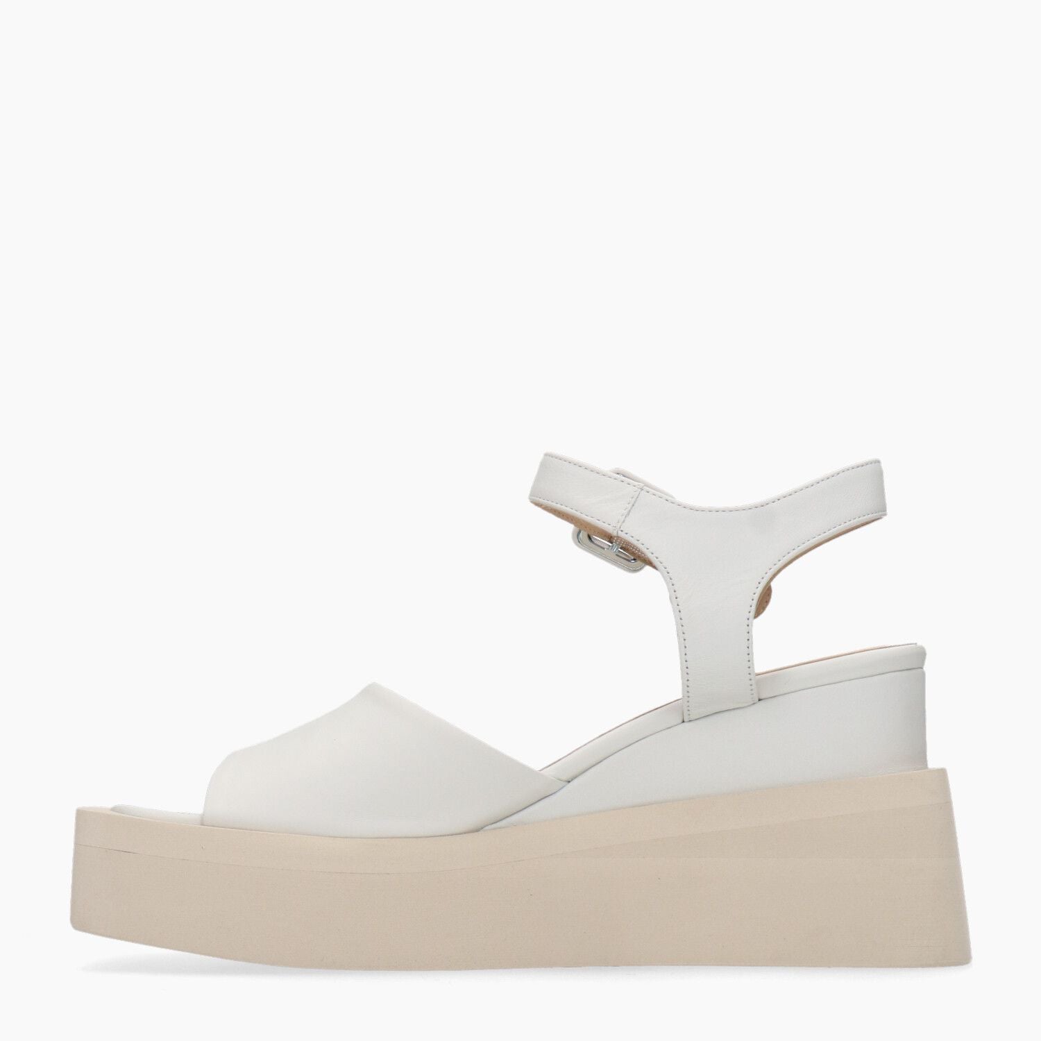 Sandali in pelle gesso con cinturino alla caviglia, fondo zeppa in gomma.