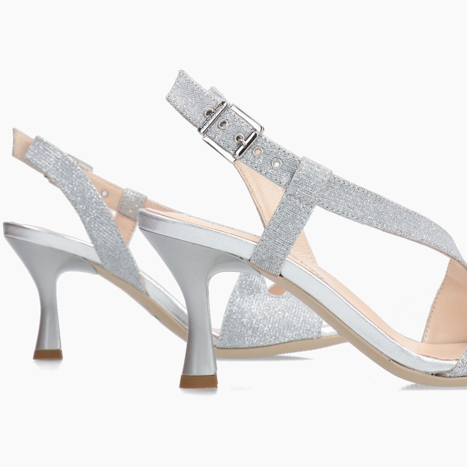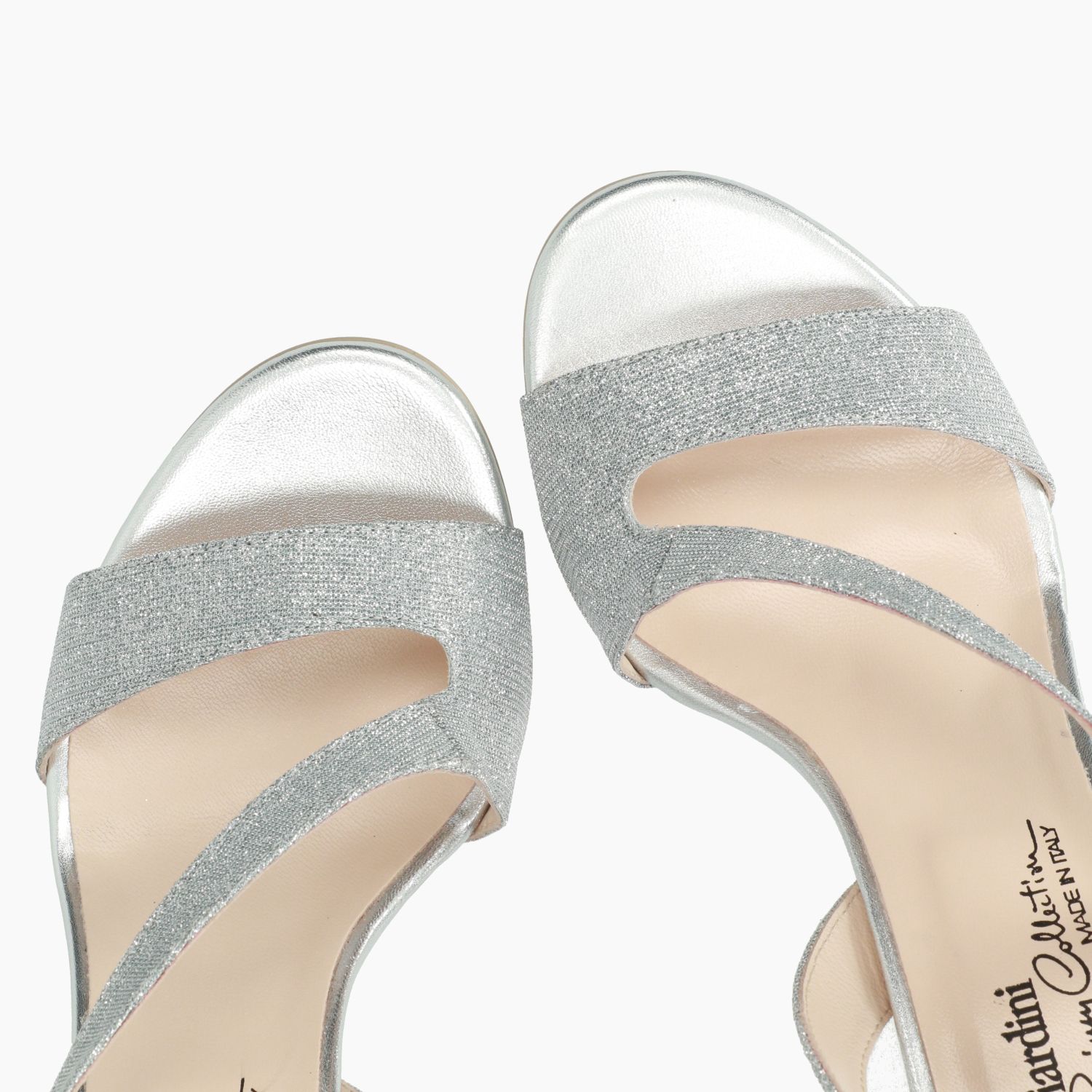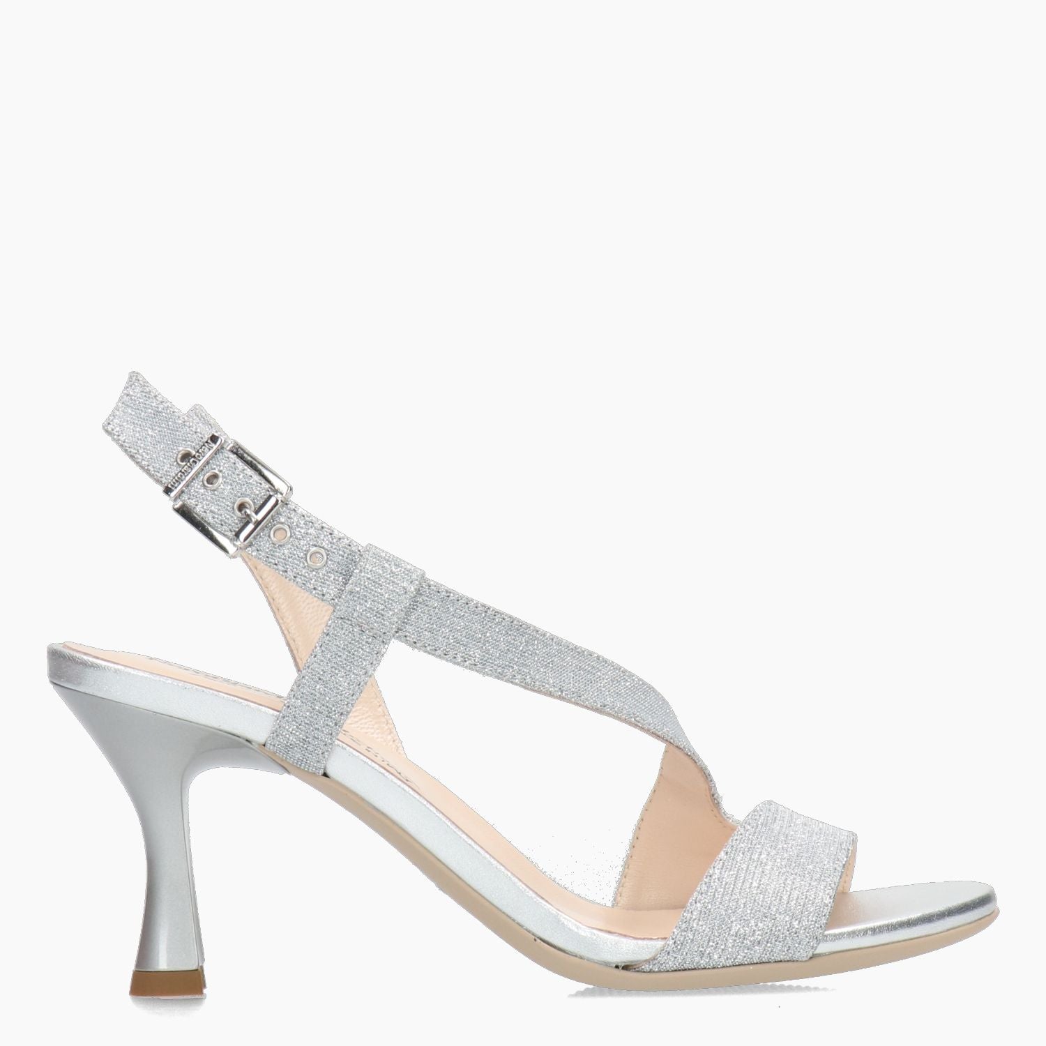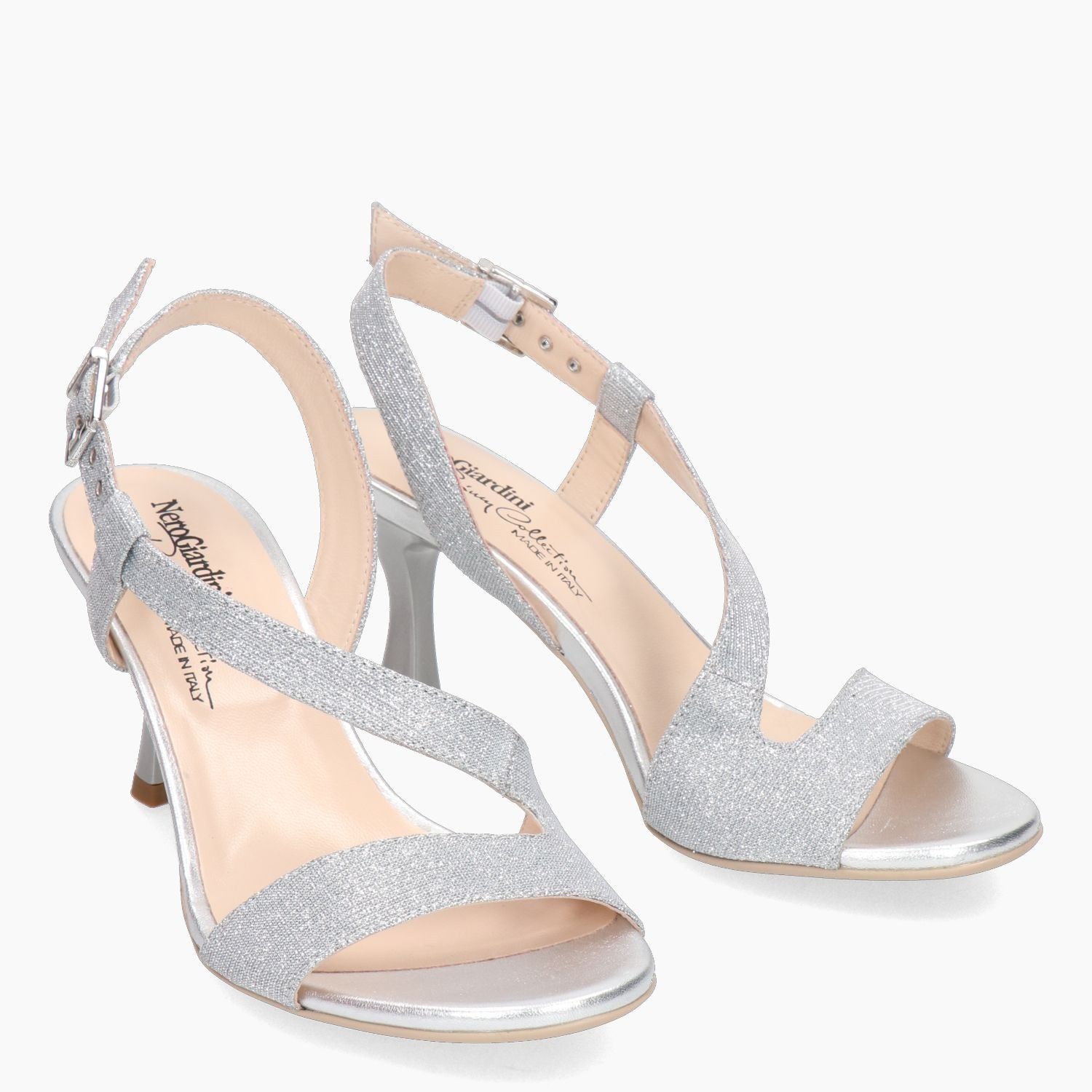 Sandalo in tessuto laminato argento. Cinturino asimmetrico regolabile con fibbia logata. Interno in pelle. Suola in gomma con tacco di 7 cm. Collezione donna Nero Giardini primavera/estate.