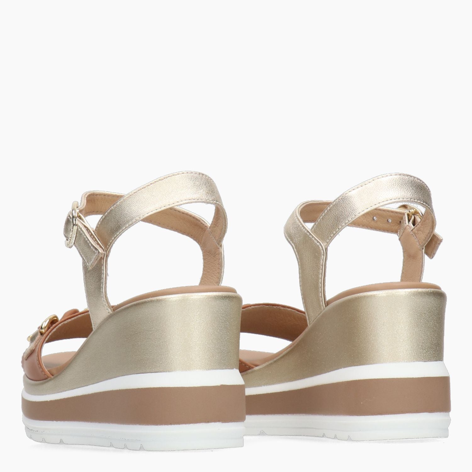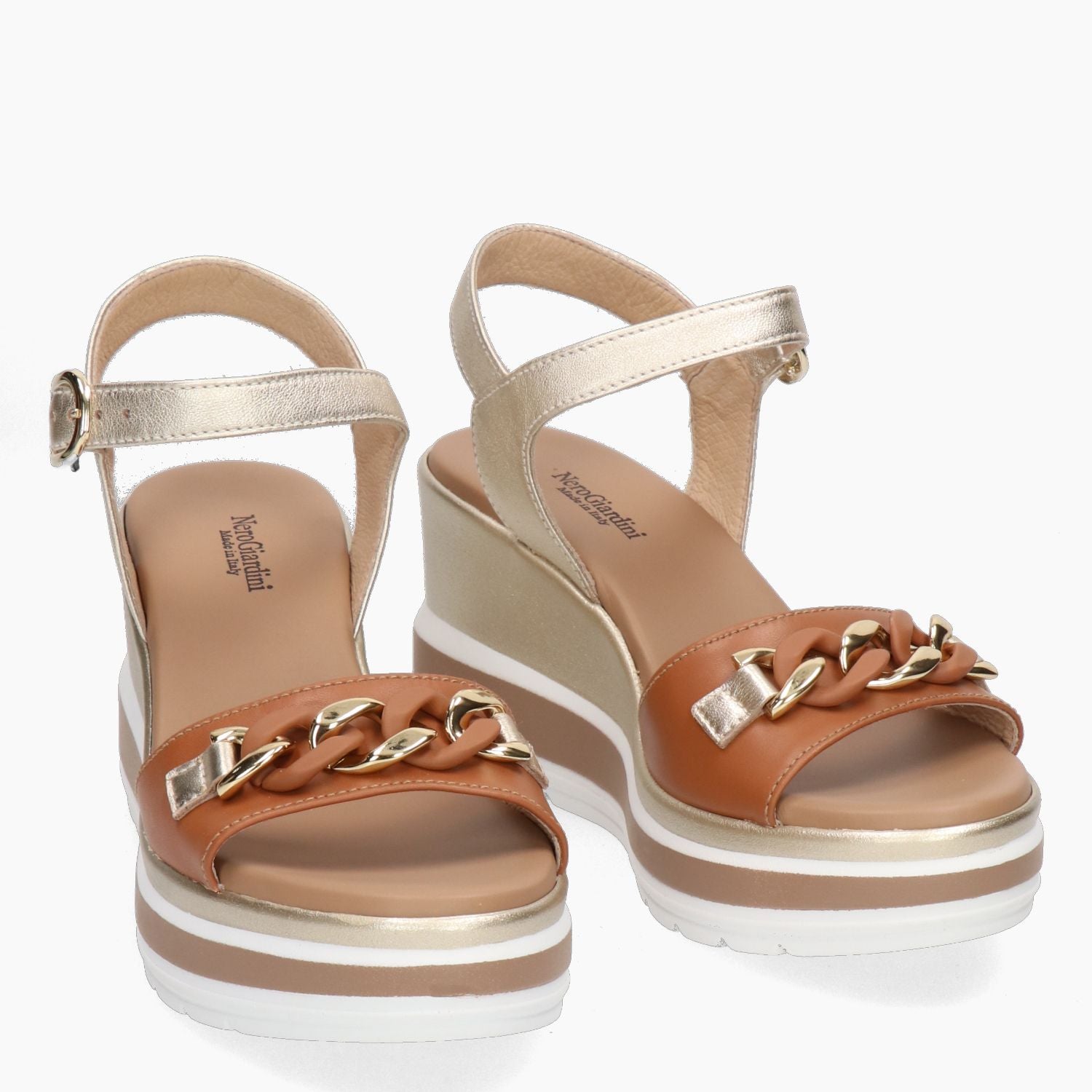 Sandalo in pelle cuoio e laminata oro. Catena dorata e cuoio. Cinturino con regolazione tramite fibbia logata. Interno in pelle con sottopiede imbottito. Suola in gomma con zeppa multicolor di 8 cm. Collezione donna Nero Giardini primavera/estate.