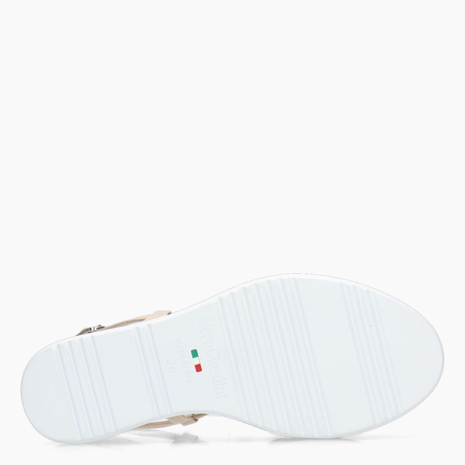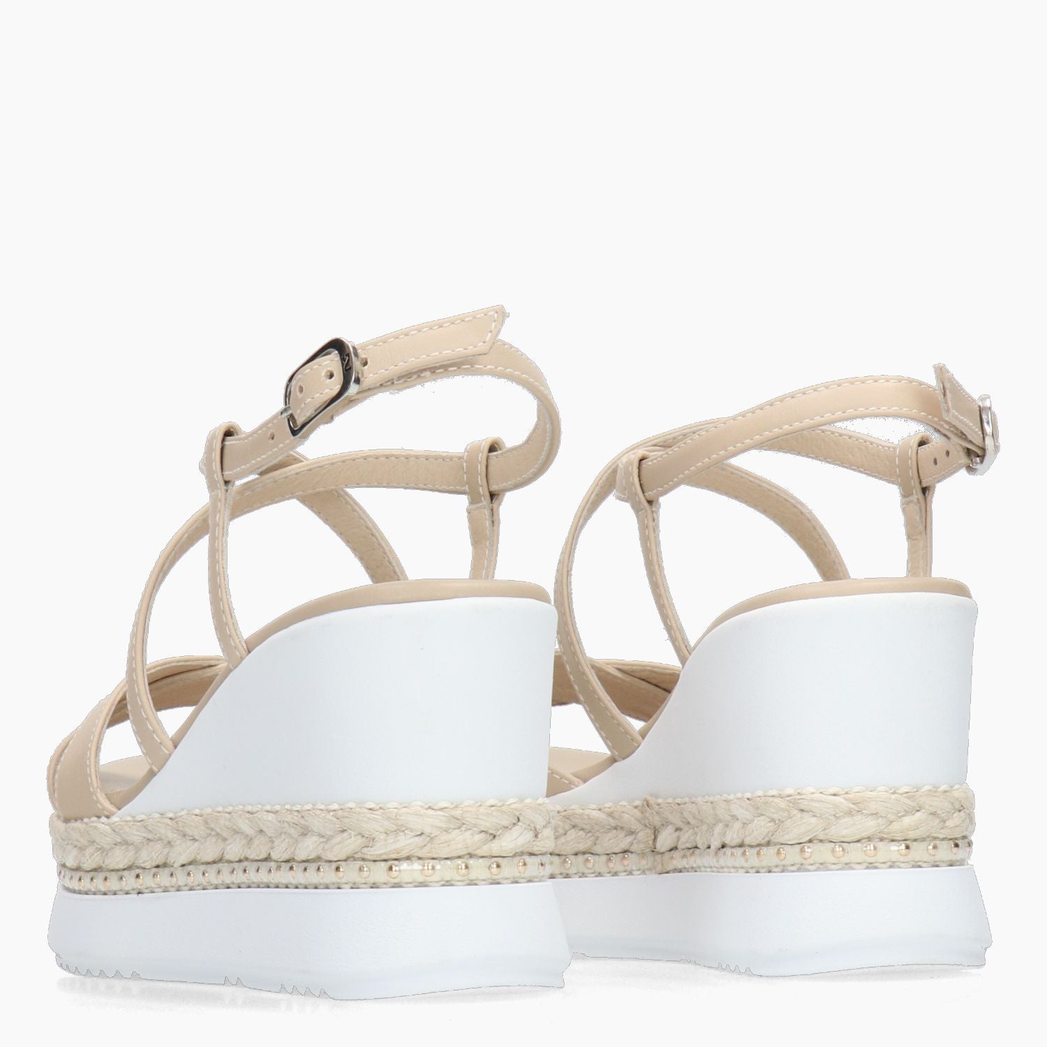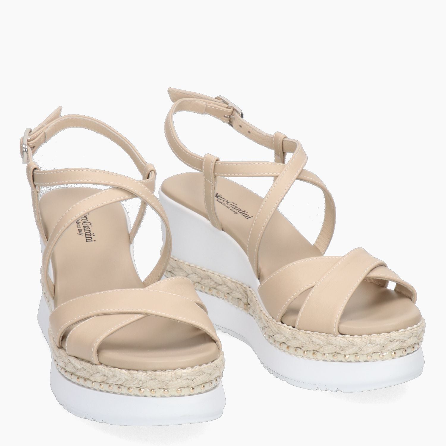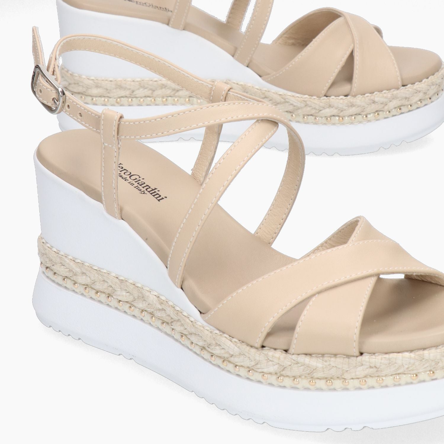 Sandalo in pelle beige. Cinturino con regolazione tramite fibbia logata. Interno in pelle con sottopiede imbottito. Suola in gomma con zeppa in parte ricoperta con treccia in corda di 8 cm. Collezione donna Nero Giardini primavera/estate.