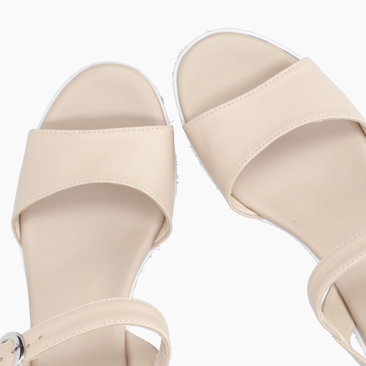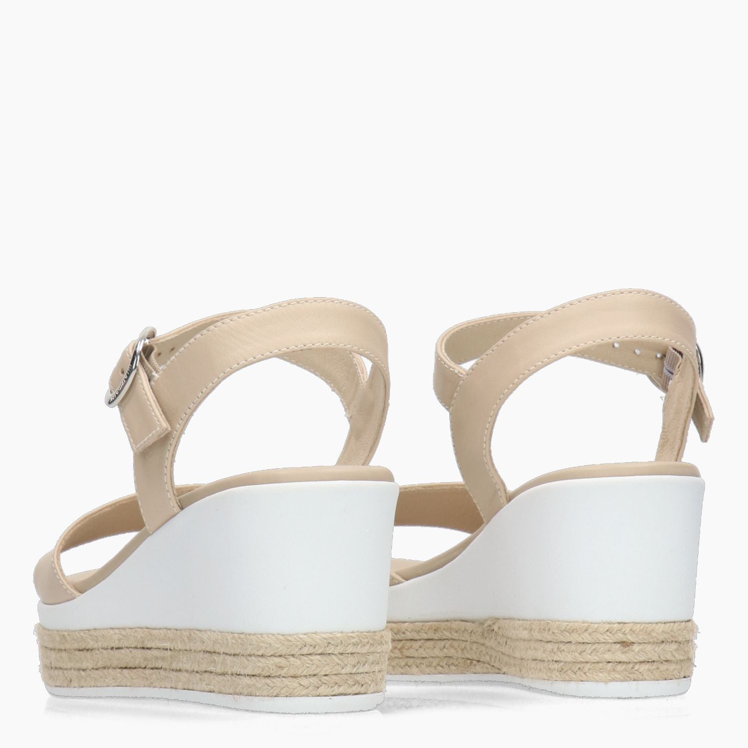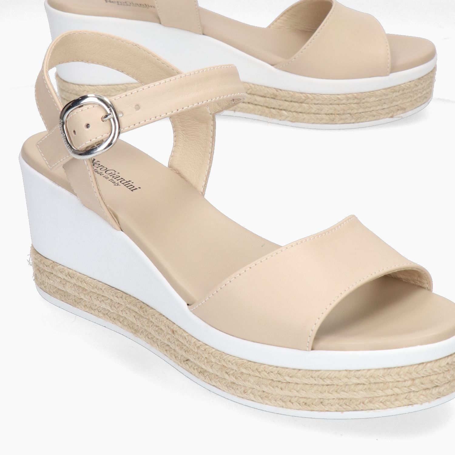Sandalo in pelle beige. Cinturino con regolazione tramite fibbia logata. Interno in pelle con sottopiede imbottito. Suola in gomma con zeppa in parte ricoperta con treccia in corda di 7 cm. Collezione donna Nero Giardini primavera/estate.