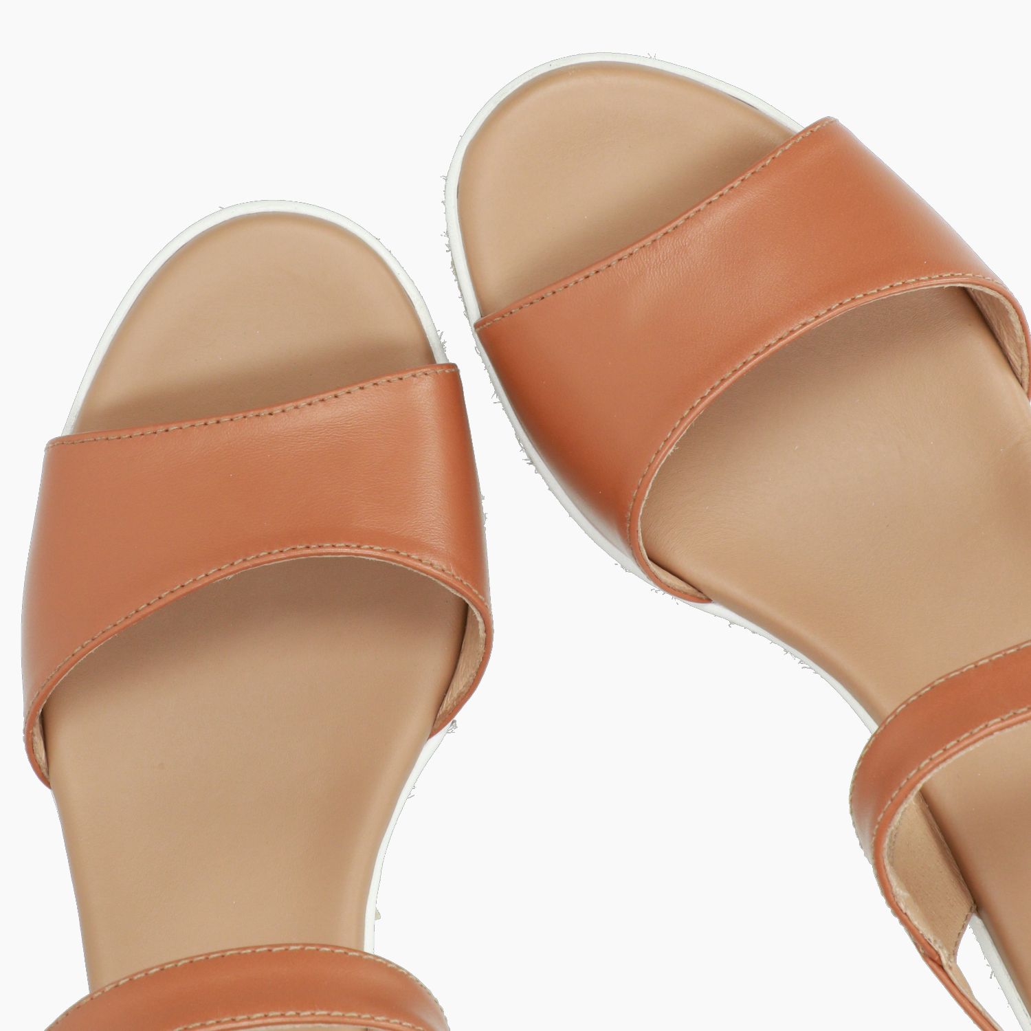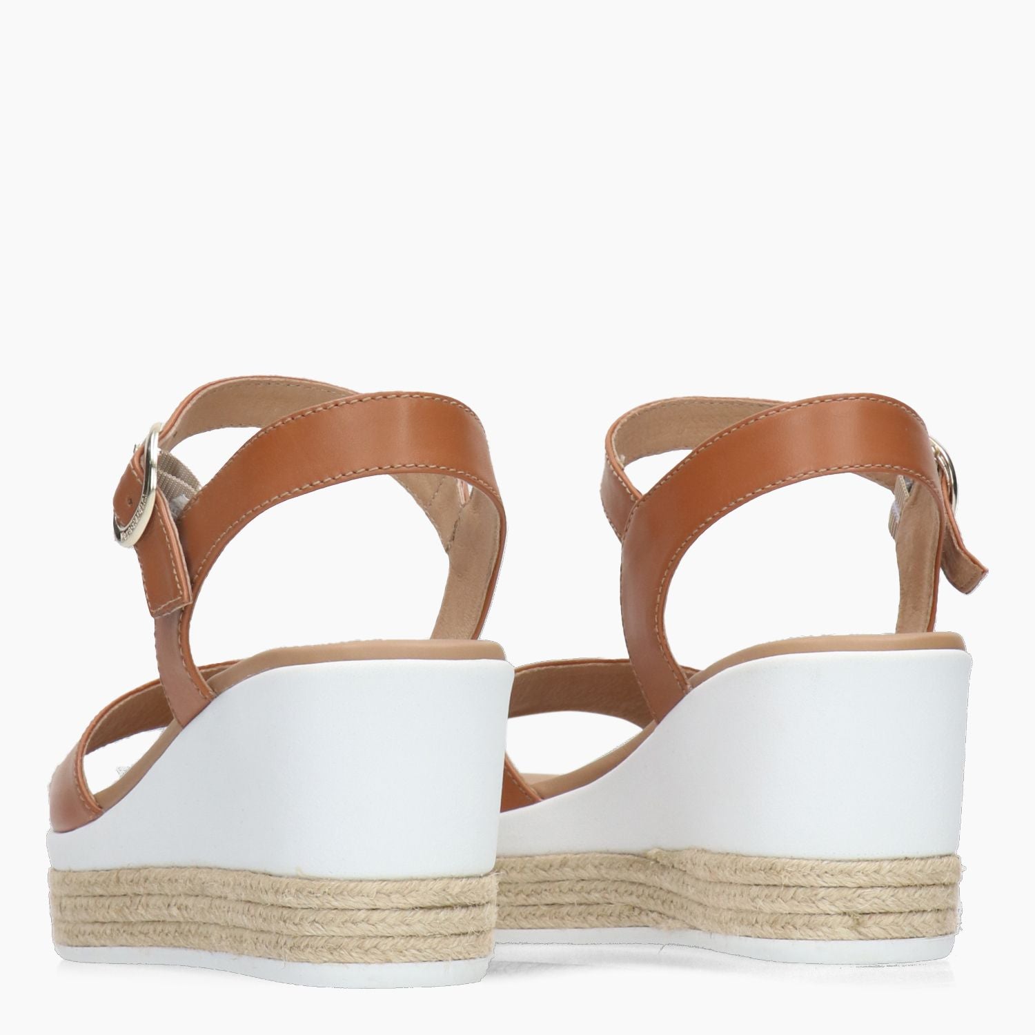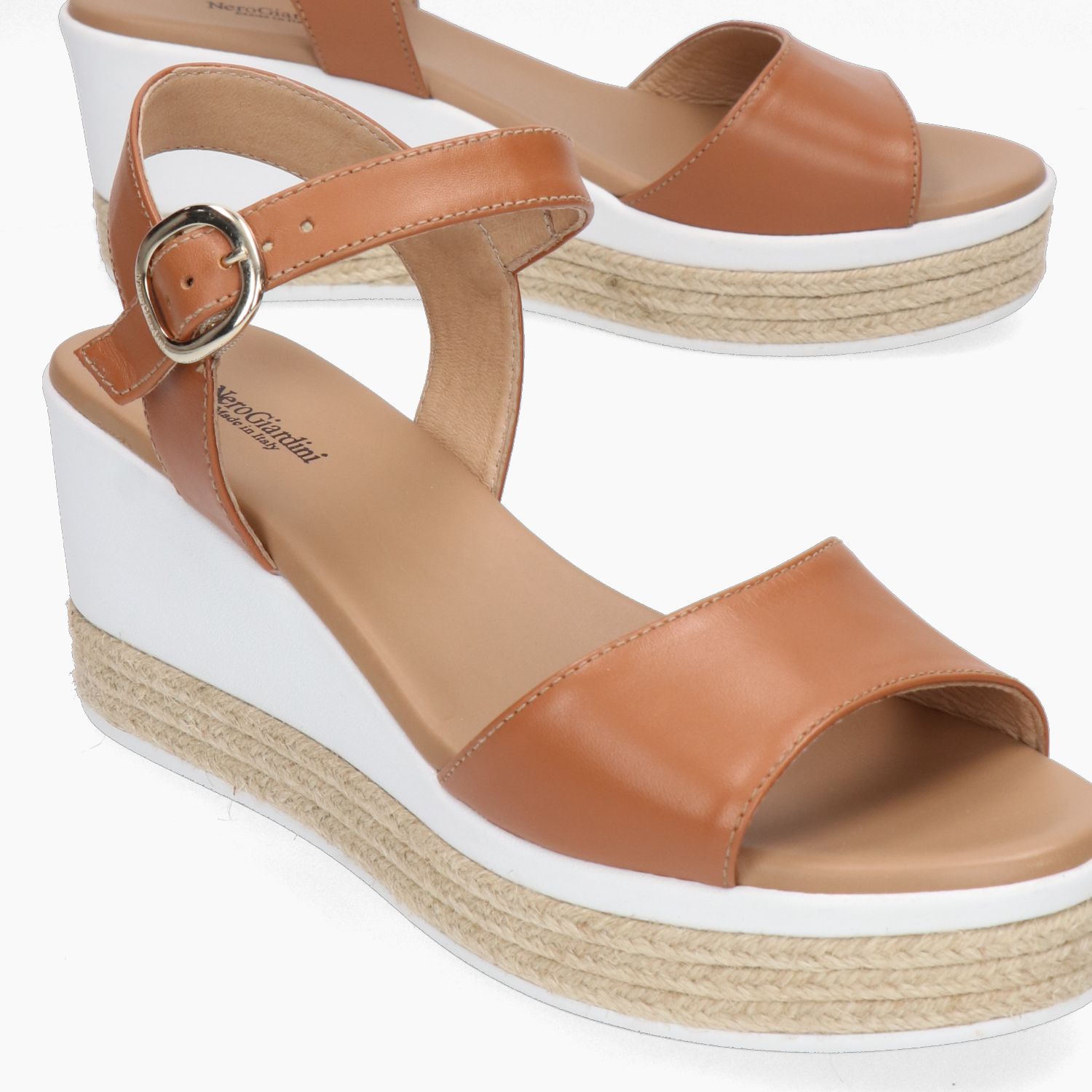Sandalo in pelle cuoio. Cinturino con regolazione tramite fibbia logata. Interno in pelle con sottopiede imbottito. Suola in gomma con zeppa in parte ricoperta con treccia in corda di 7 cm. Collezione donna Nero Giardini primavera/estate.