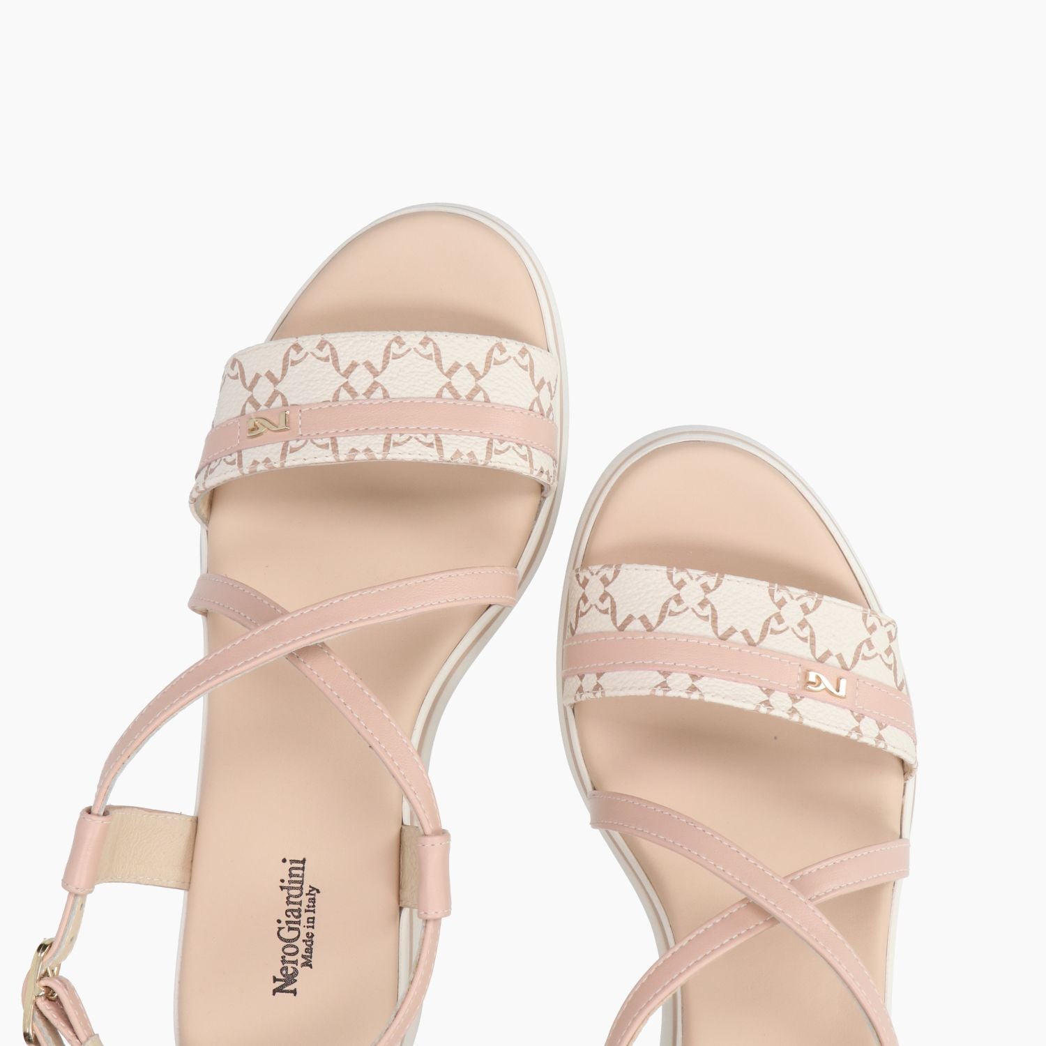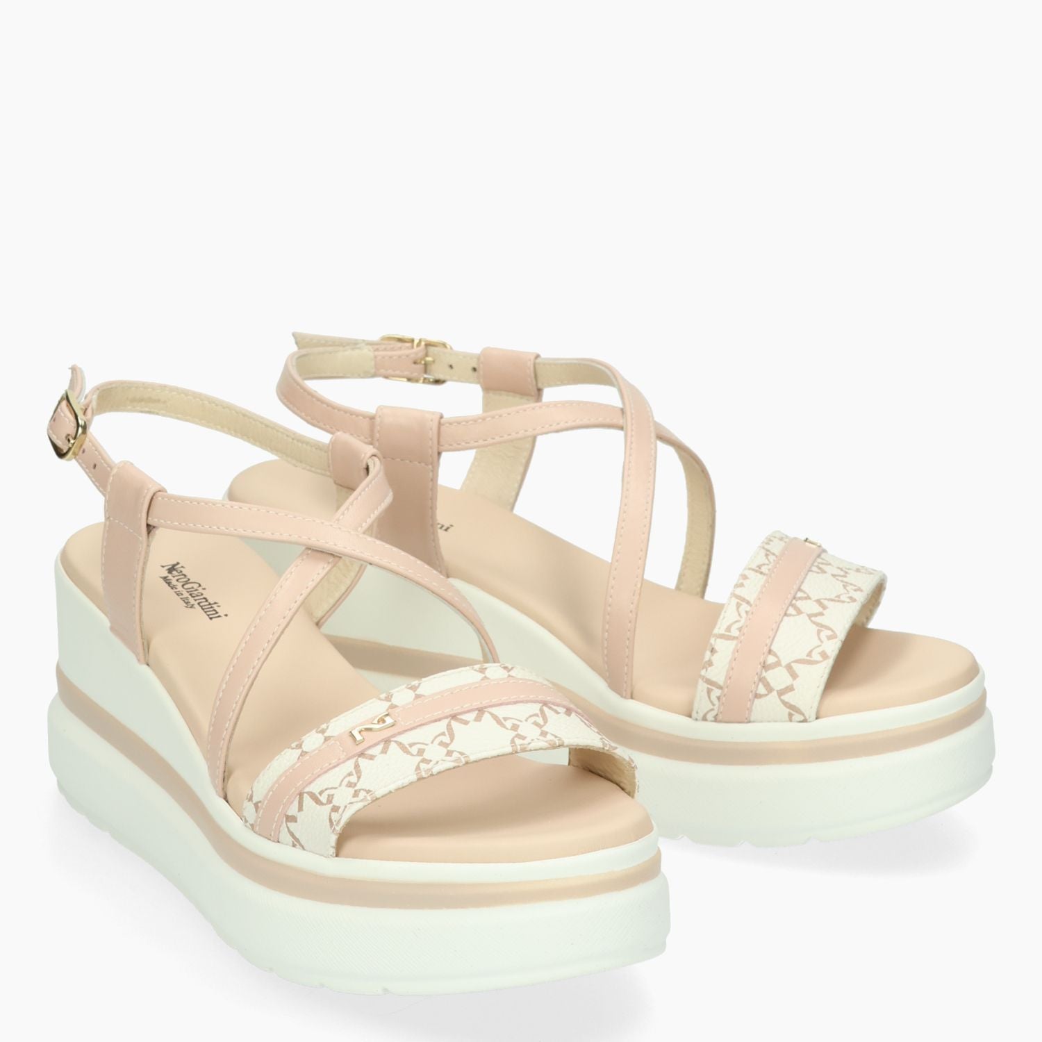 Sandalo in pelle cipria ed ecopelle logata beige con incrocio. Cinturino con regolazione tramite fibbia. Interno in pelle con sottopiede imbottito. Suola in gomma con zeppa di 8 cm. Collezione donna Nero Giardini primavera/estate.