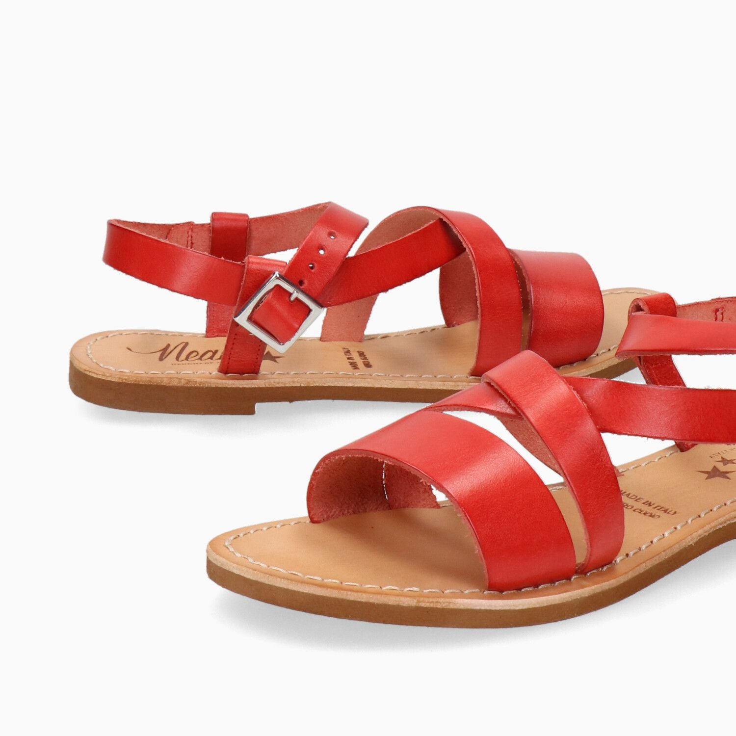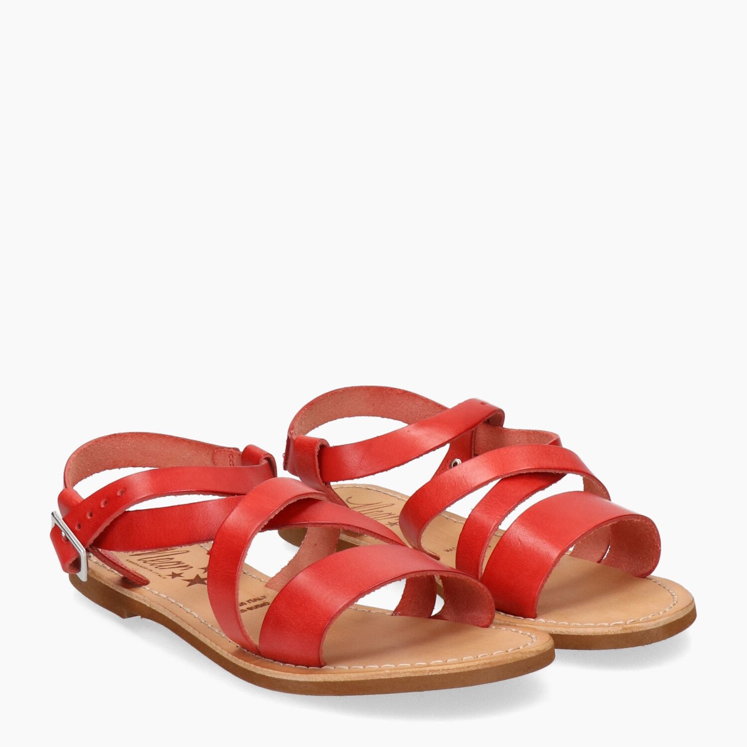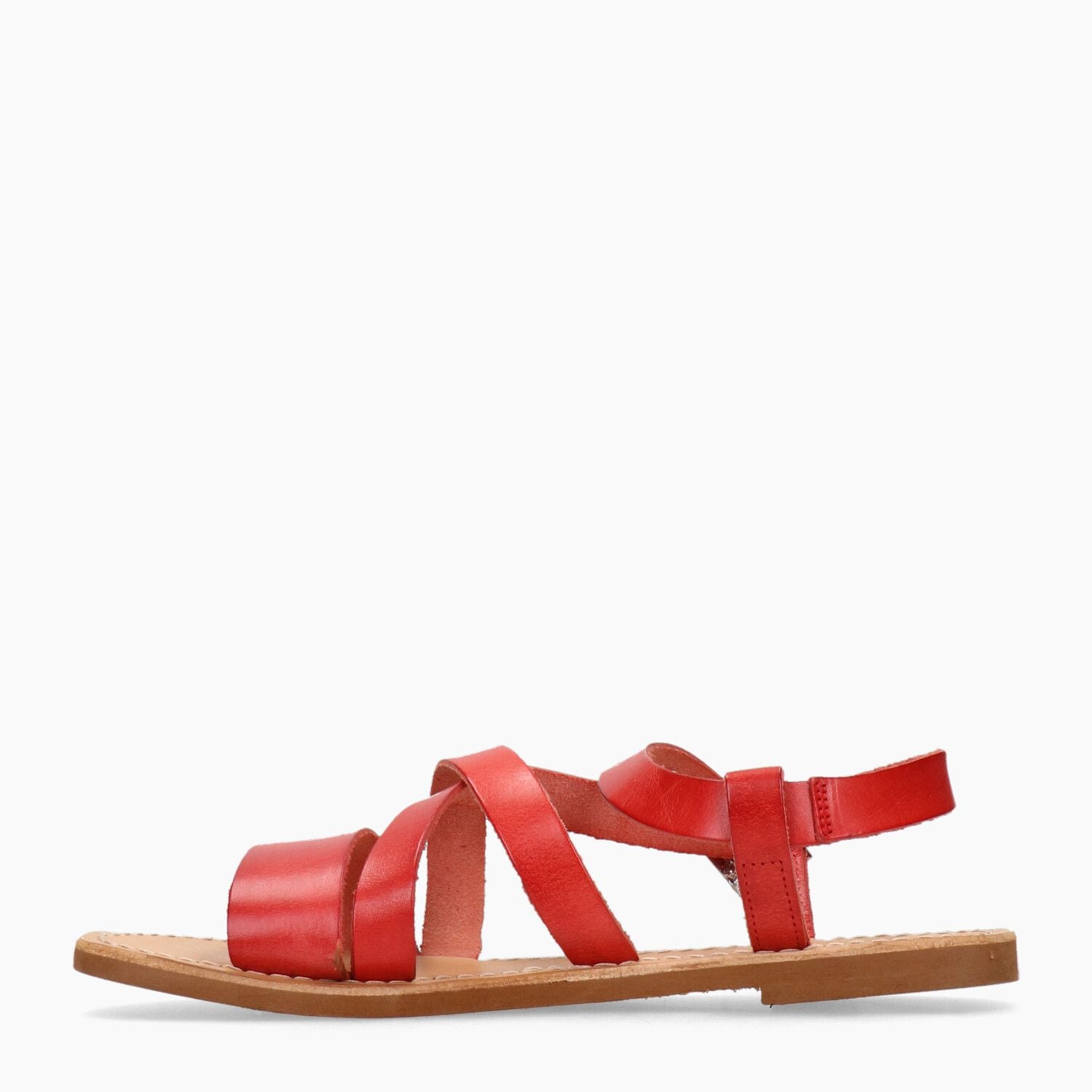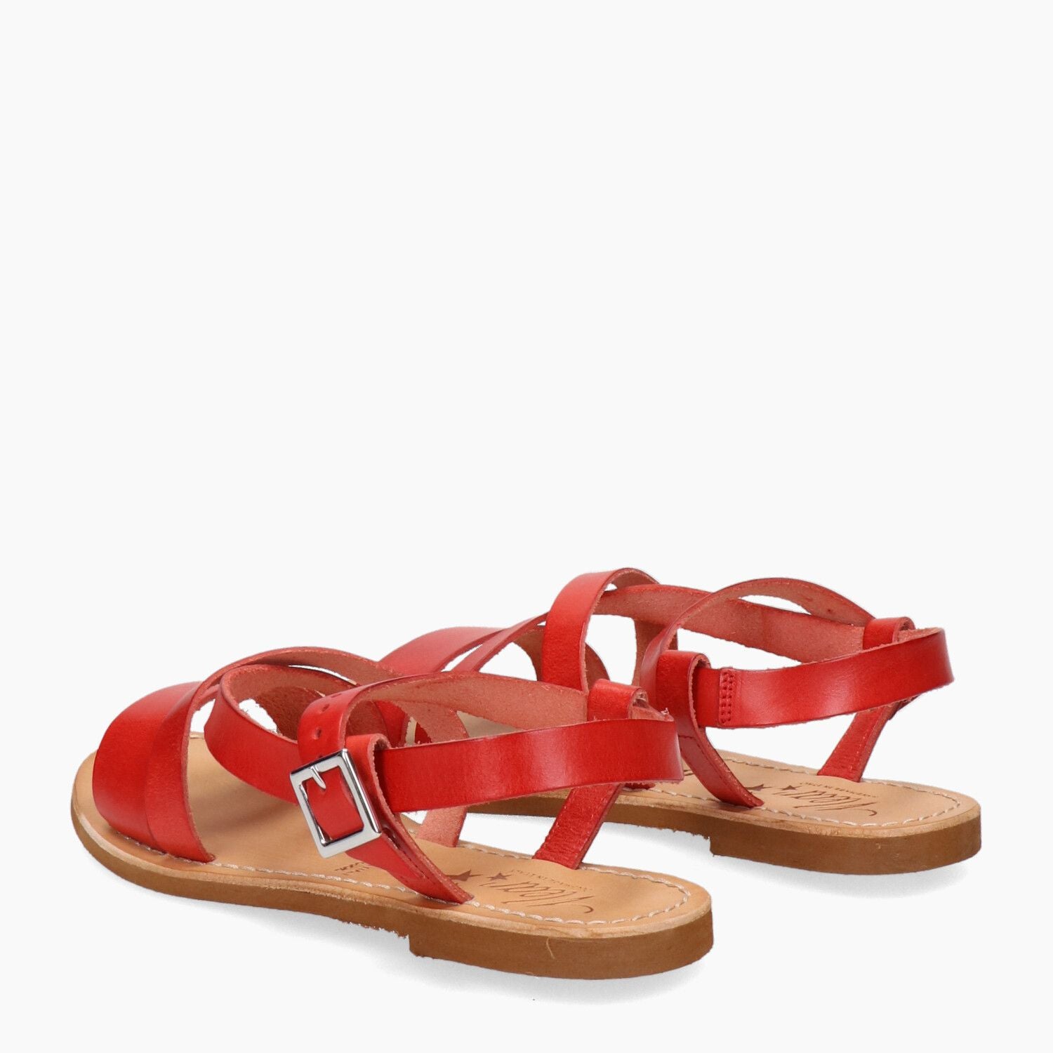 Sandali in pelle rossa con incrocio, fondo gomma.