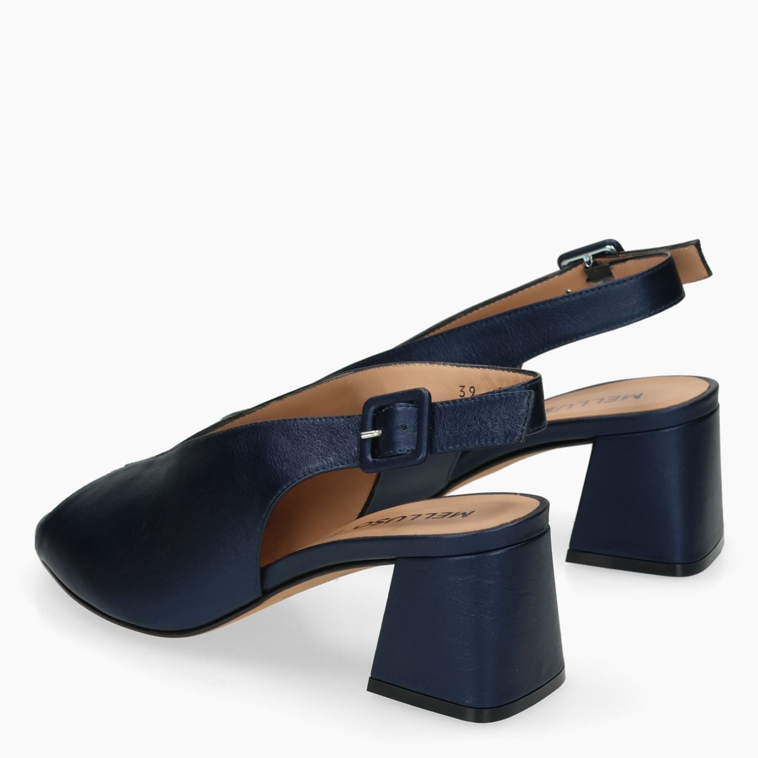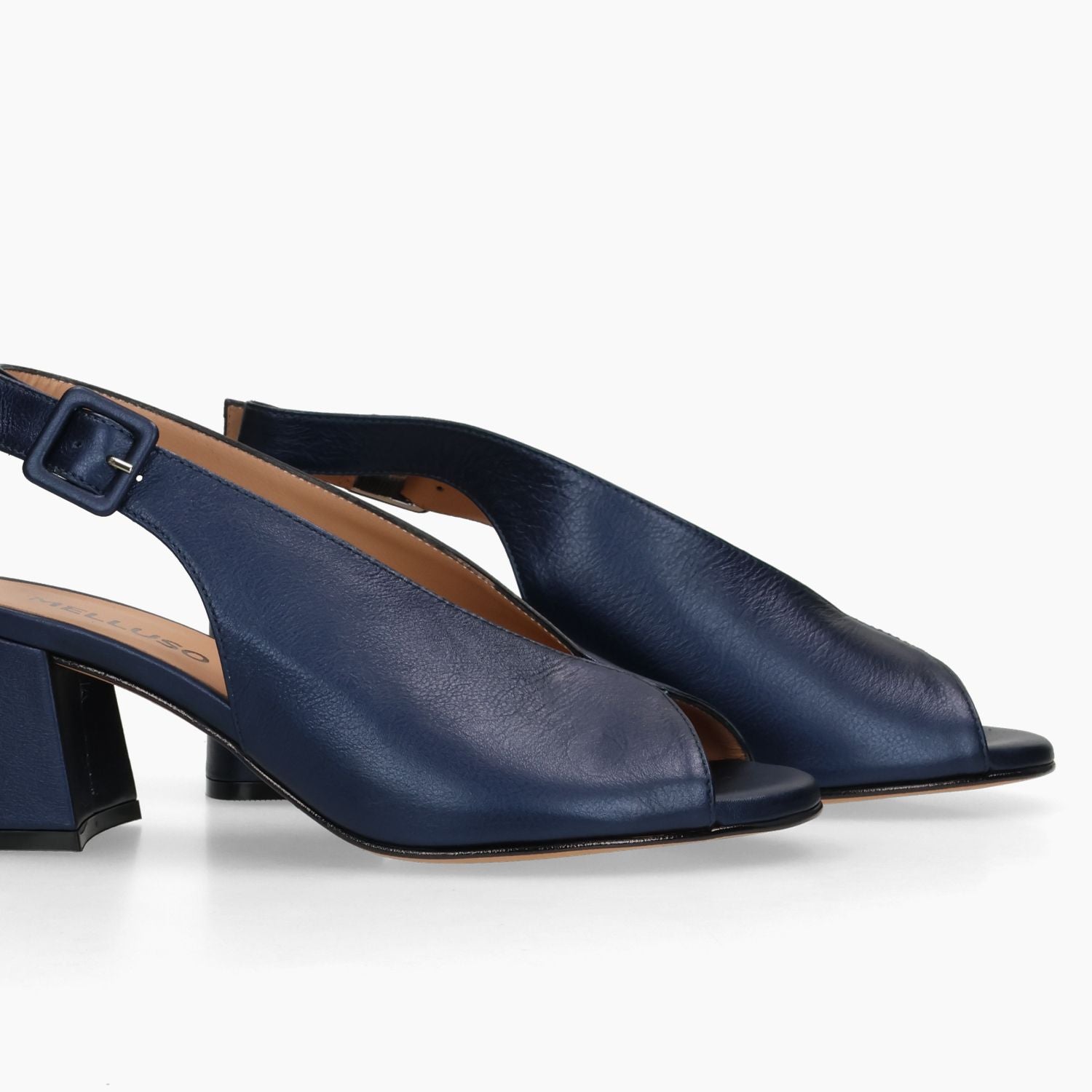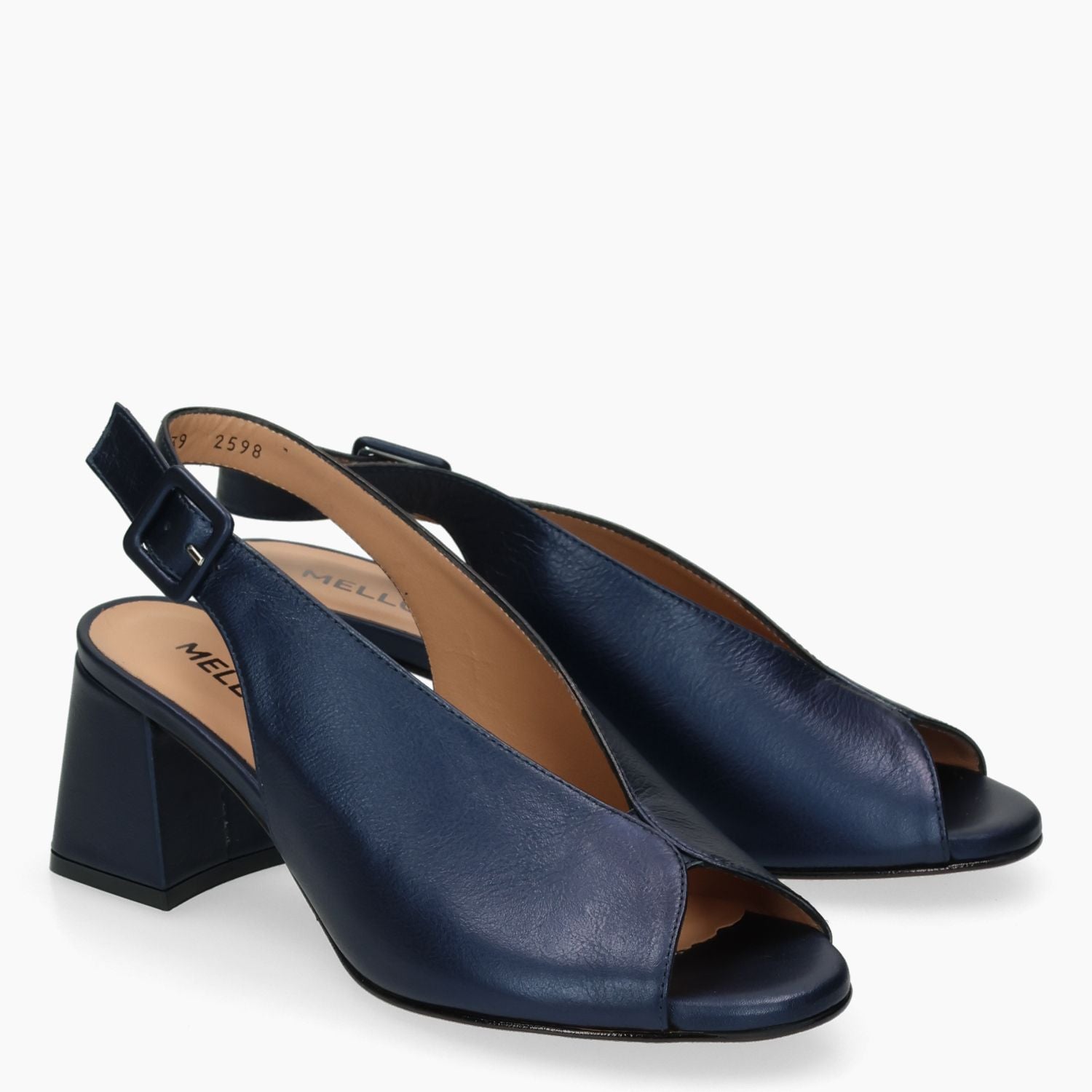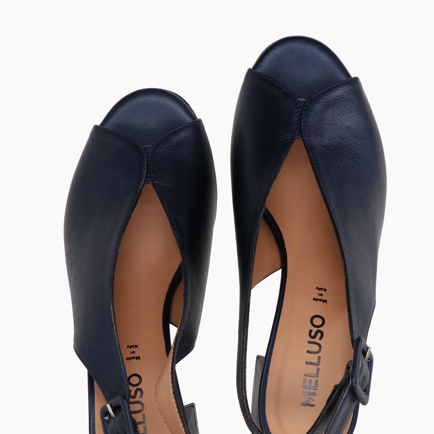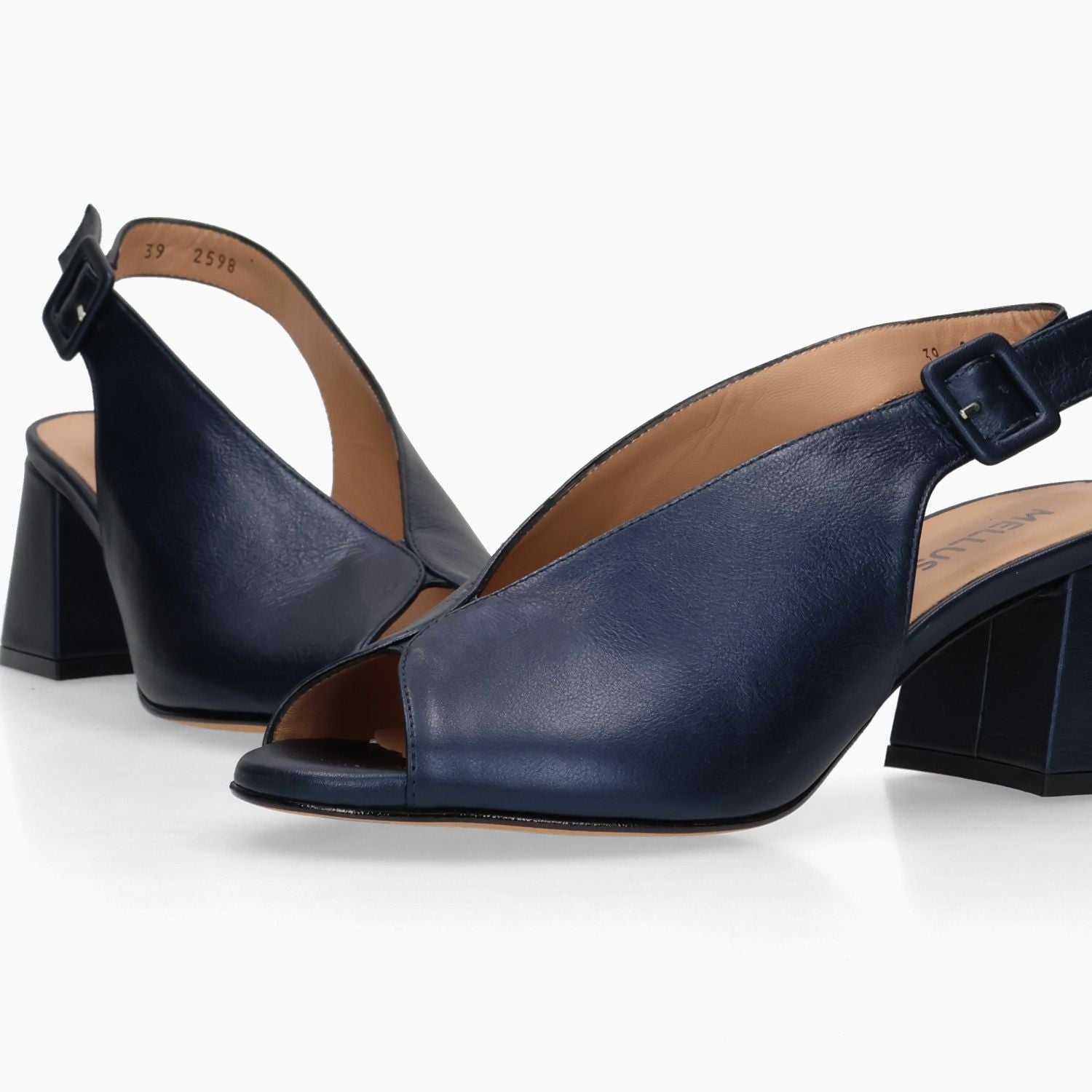Sandalo Melluso con tomaia in pelle in colore blu perlato. Chiusura con cinturino. Interno in pelle. Suola in gomma con tacco di 6 cm. Collezione Melluso donna Primavera/Estate.