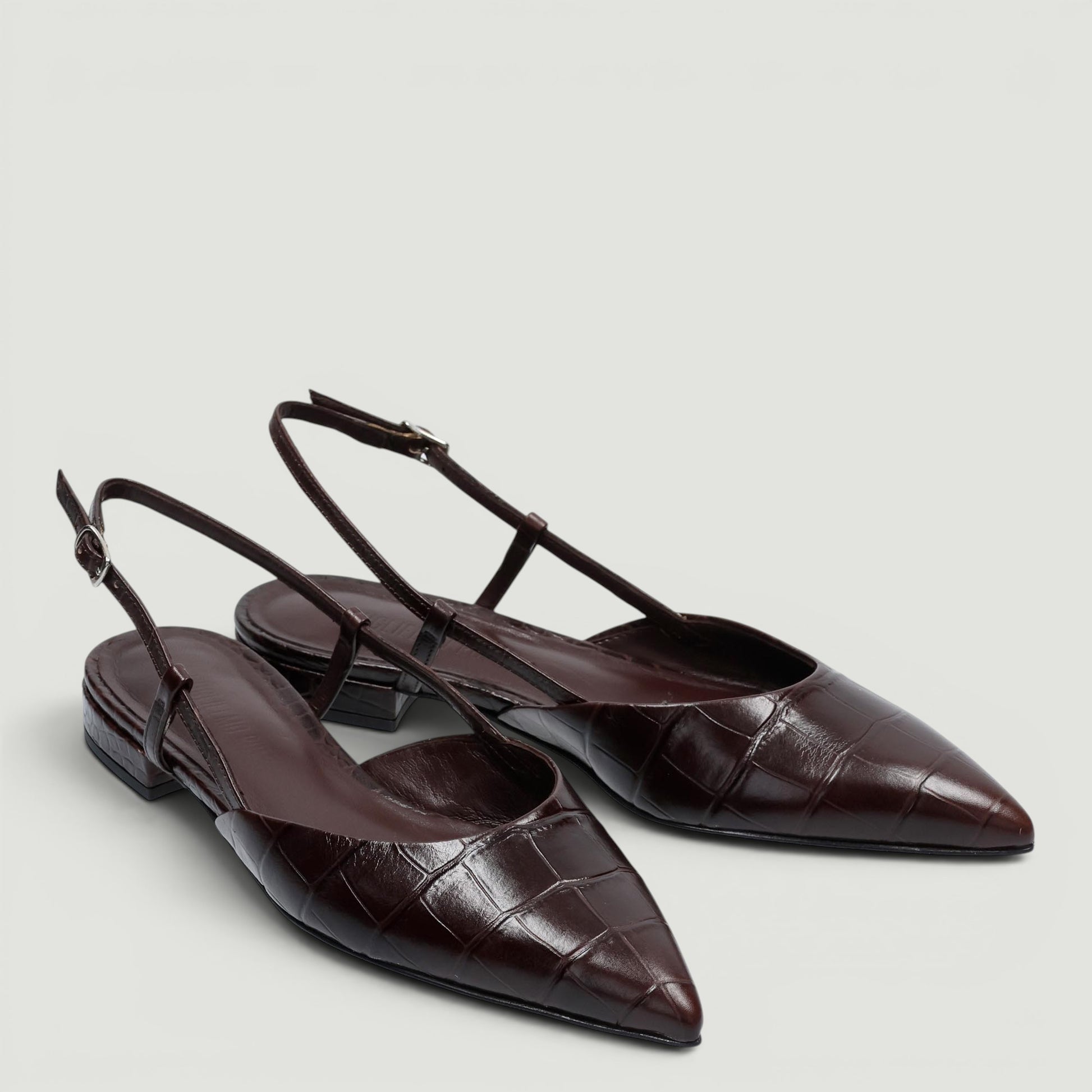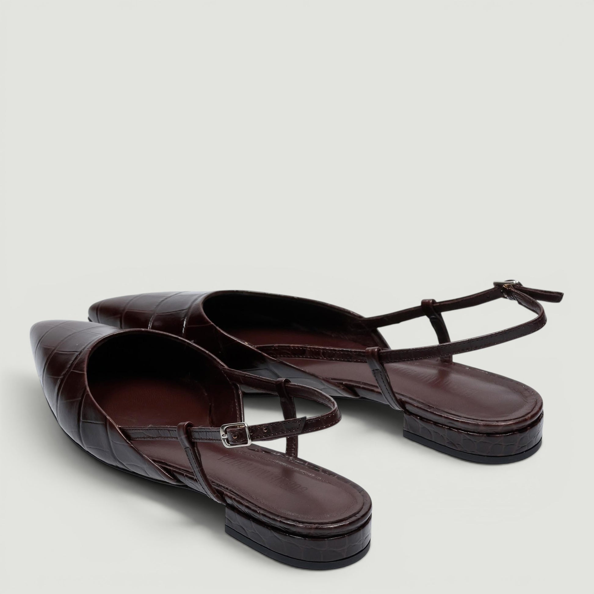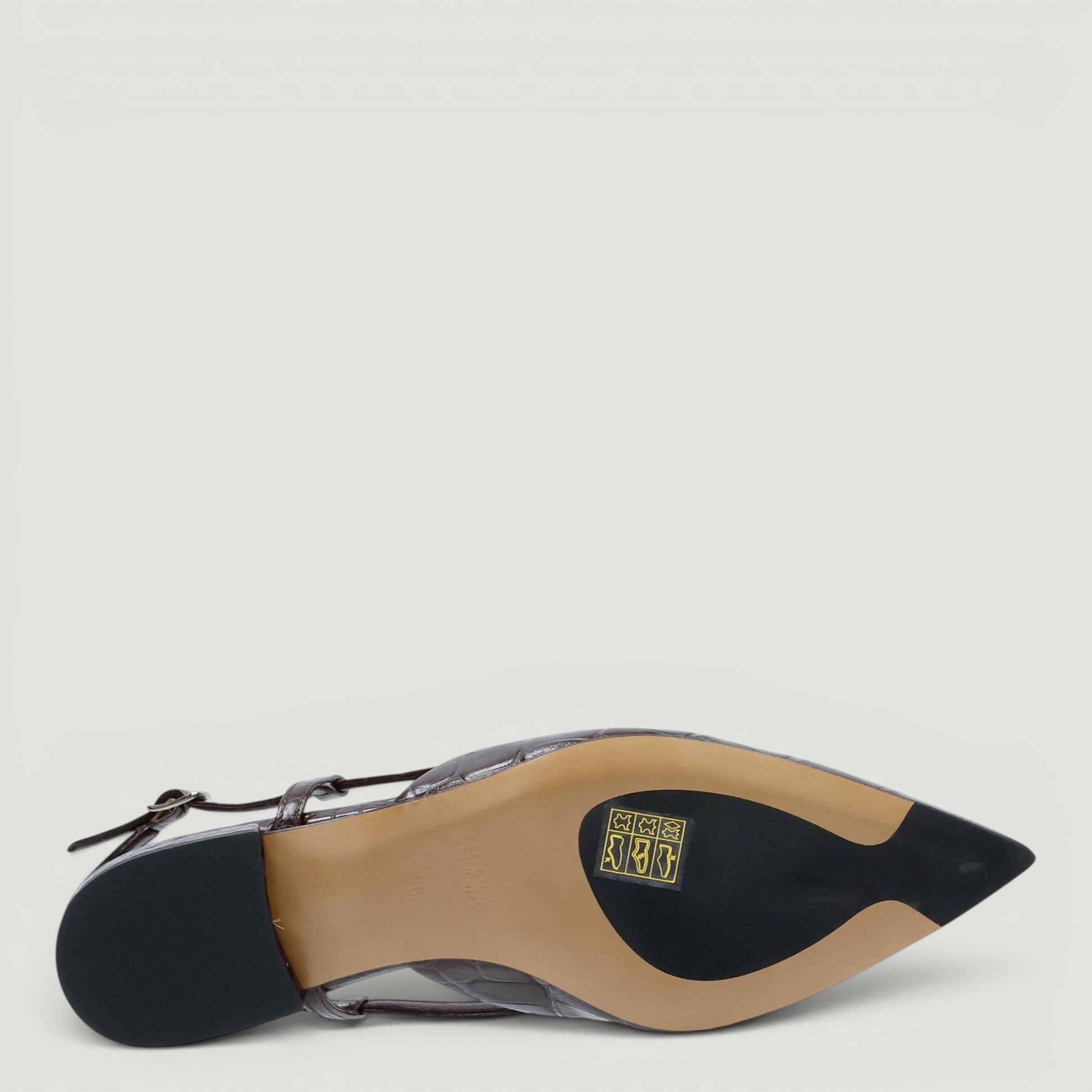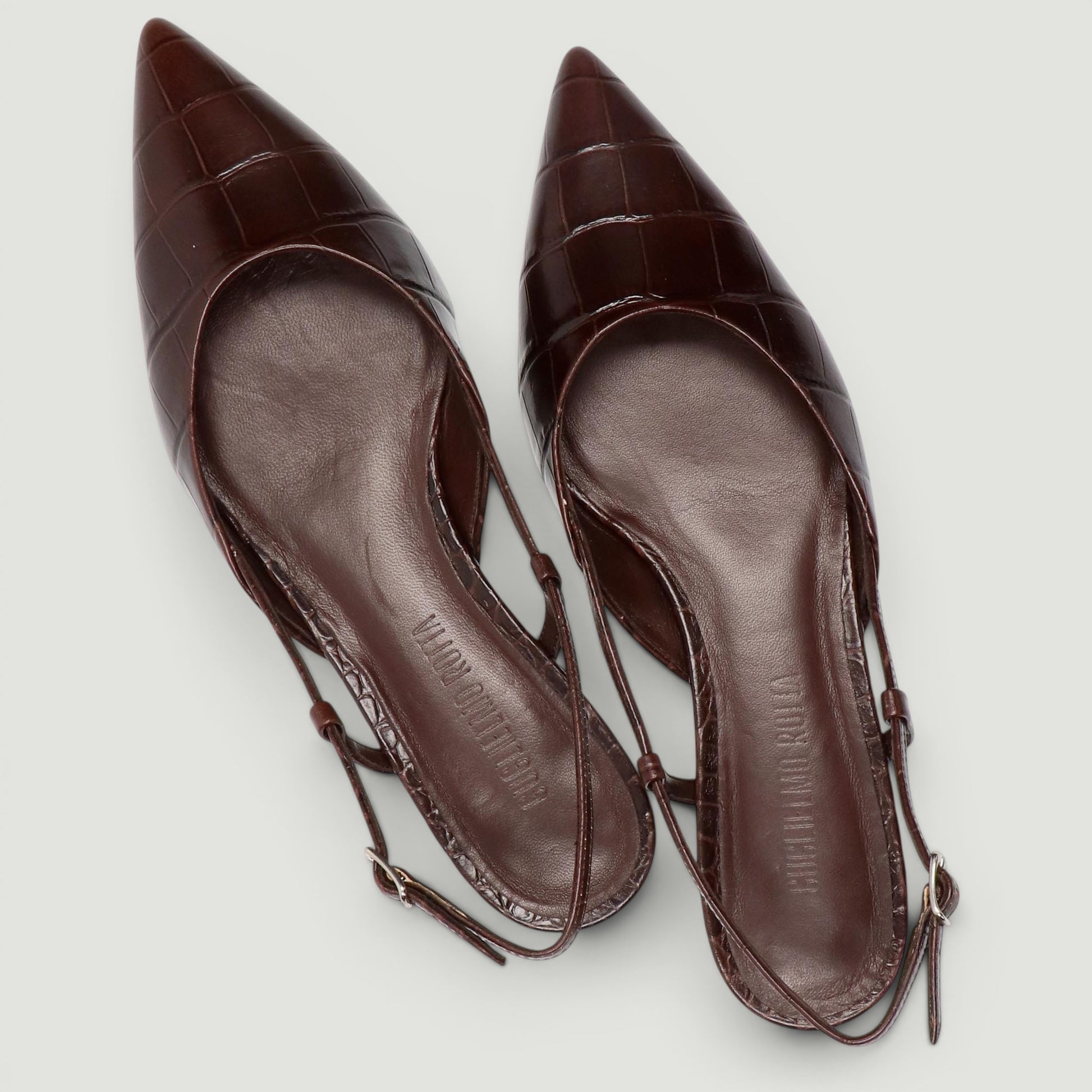 Chanel in pelle stampata cocco testa di moro. Cinturino con fibbia regolabile. Interno in pelle. Suola in cuoio con tacco di 2 cm. Collezione Guglielmo rotta Primavera/Estate.