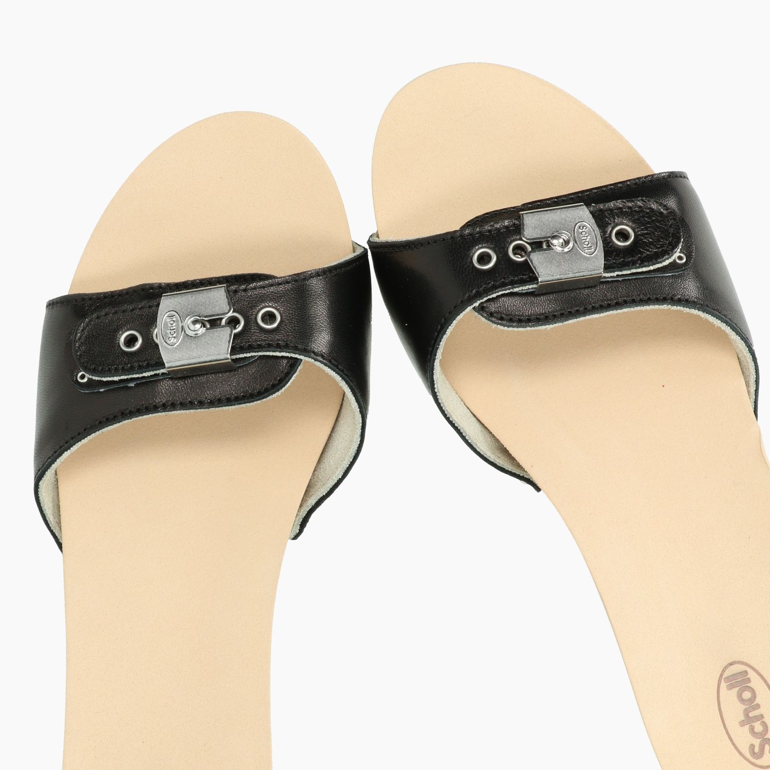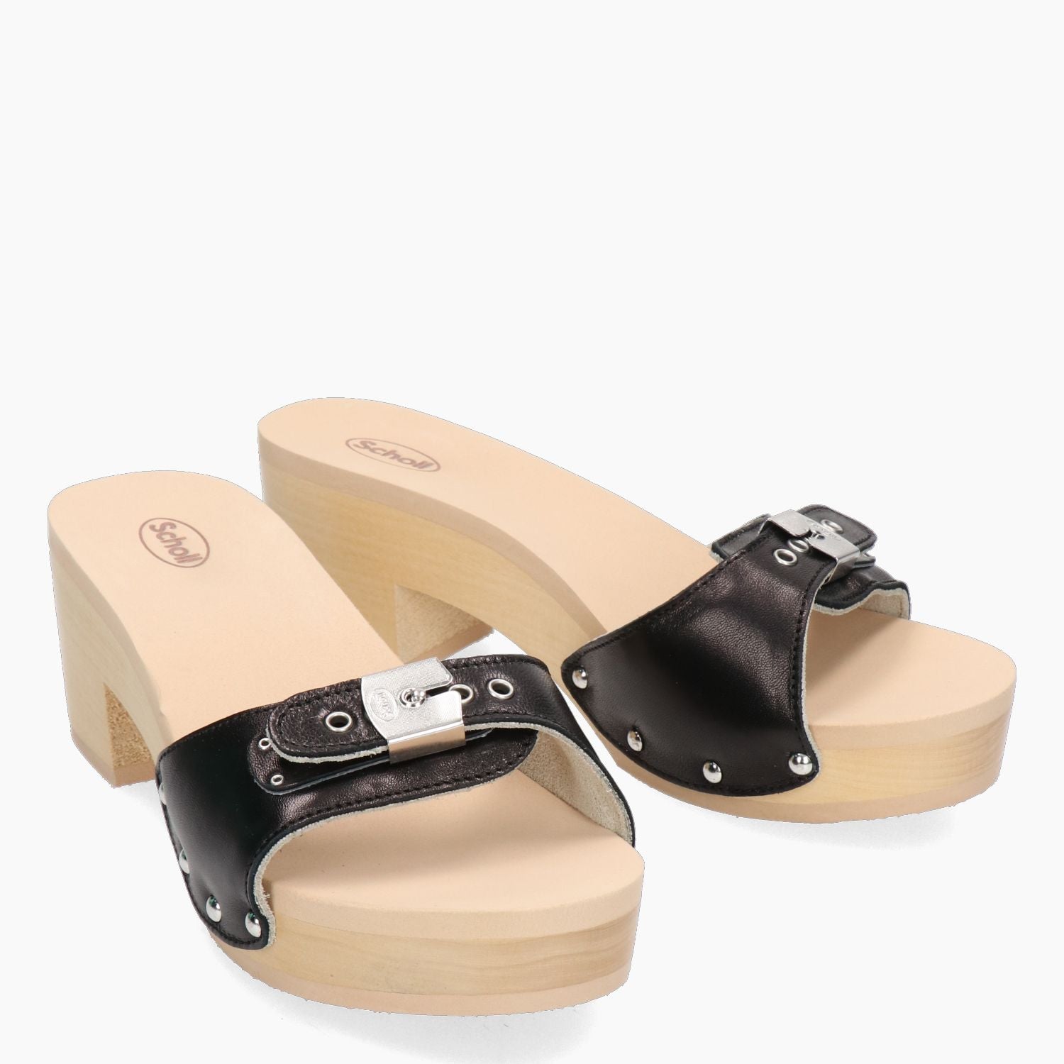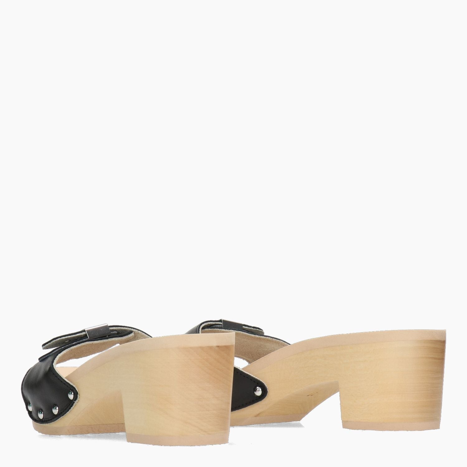 Zoccolo in legno in pelle nera con fibbia regolabile. Sottopiede in gomma microporosa. Tacco di 6 cm. Battistrada in gomma. Collezione Sholl donna.