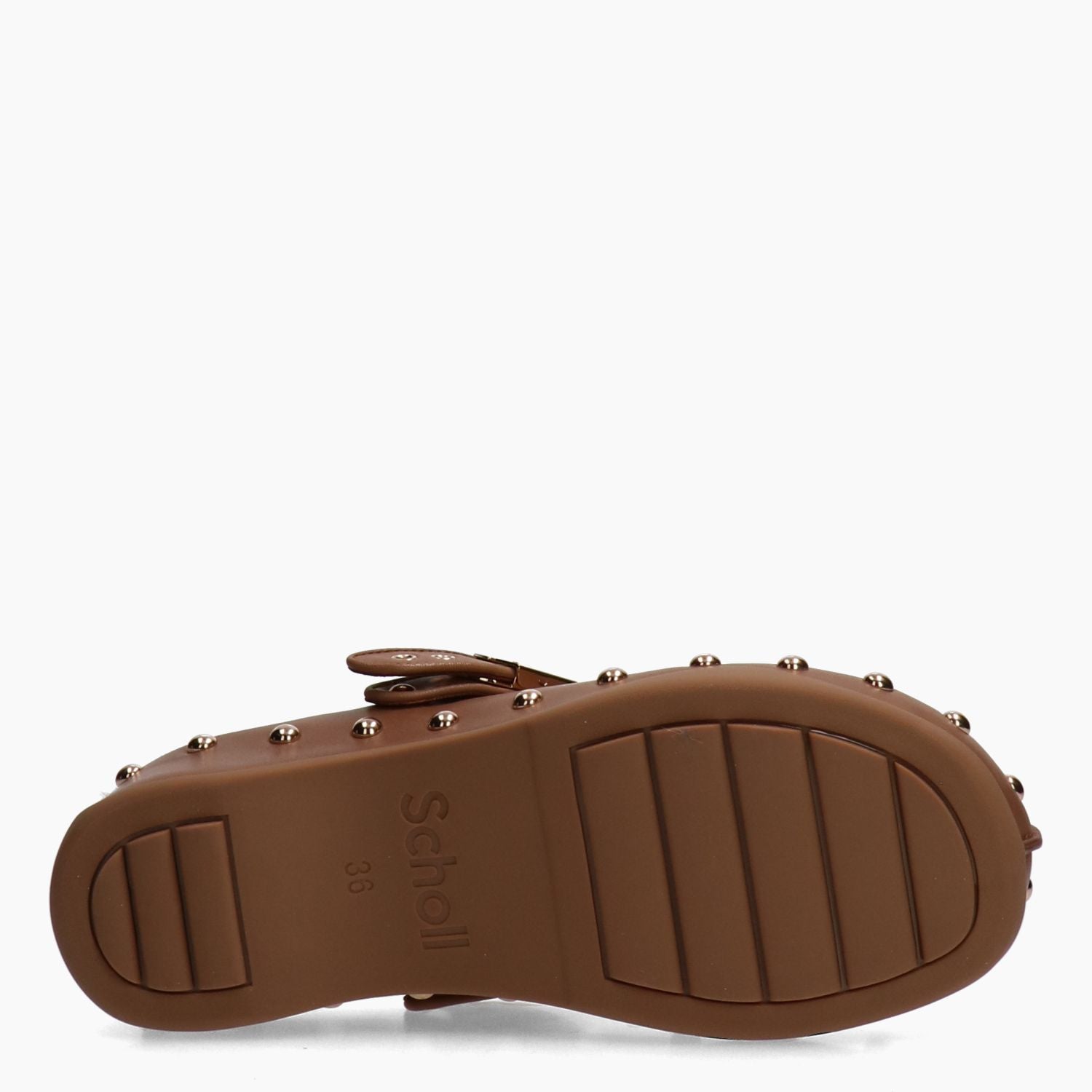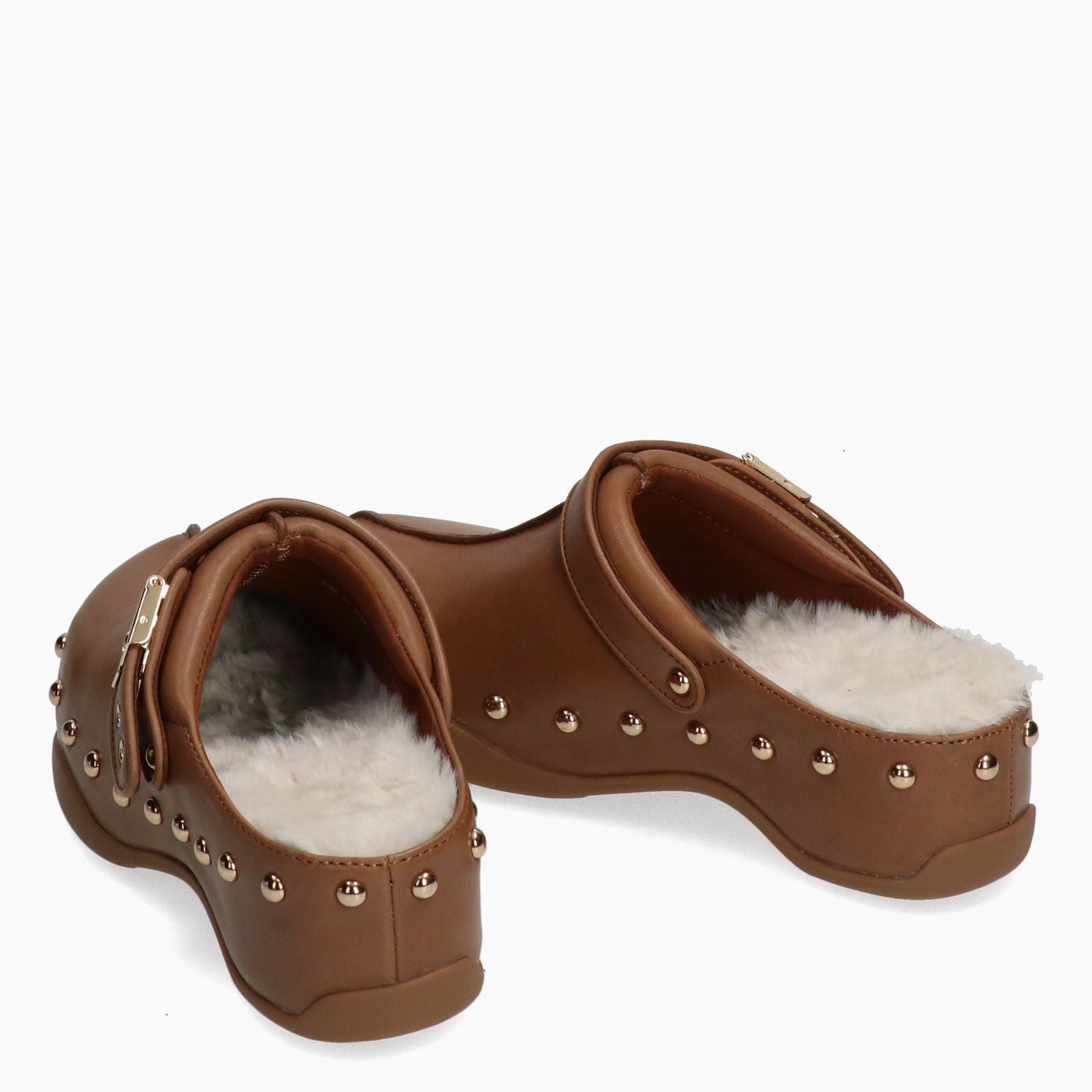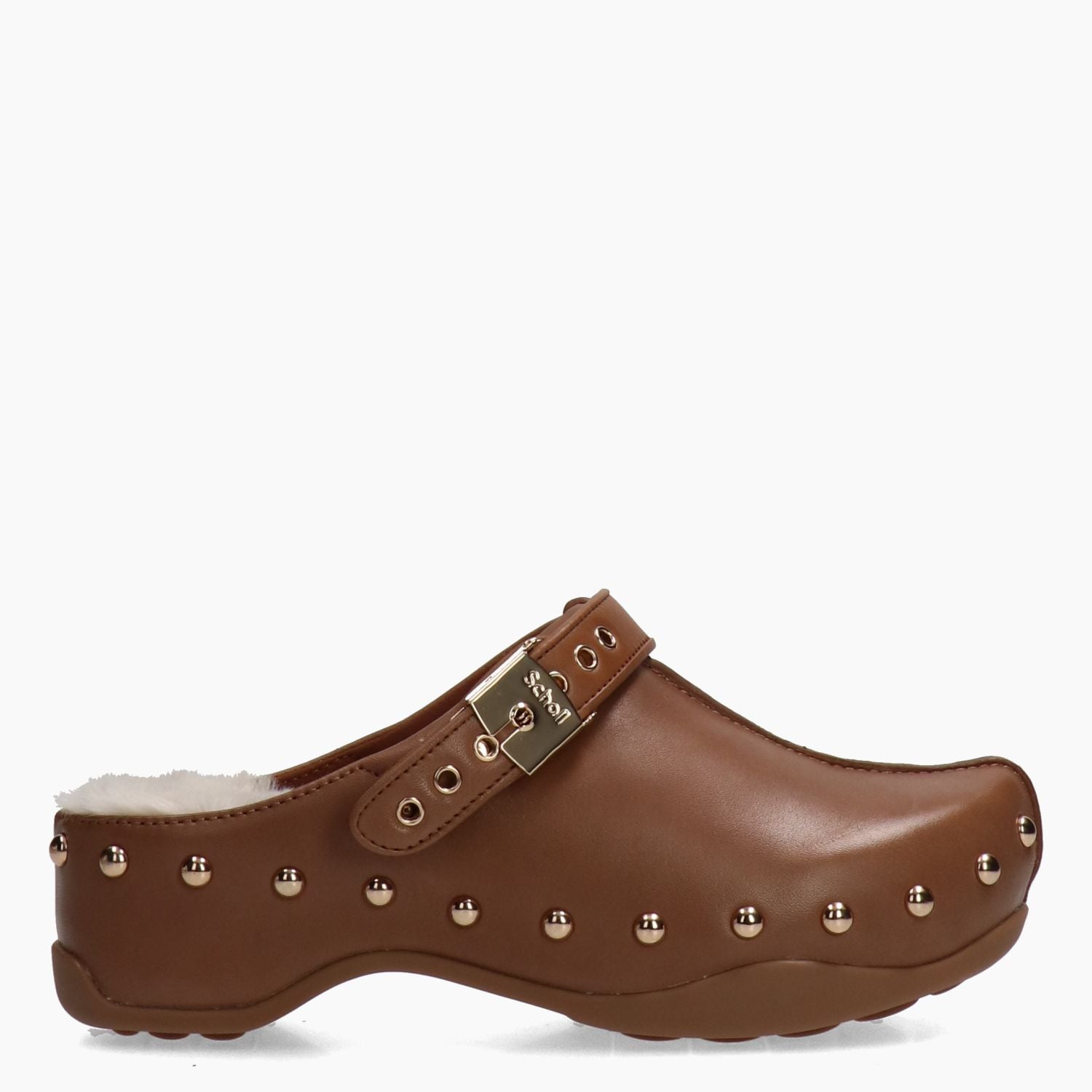Zoccolo in pelle color brandy. Cinturino girevole per il tallone regolabile con fibbia dorata. Contorno di borchie dorate. Interno in ecopelo. Suola in gomma con tacco di 5 cm. Collezione Sholl donna.