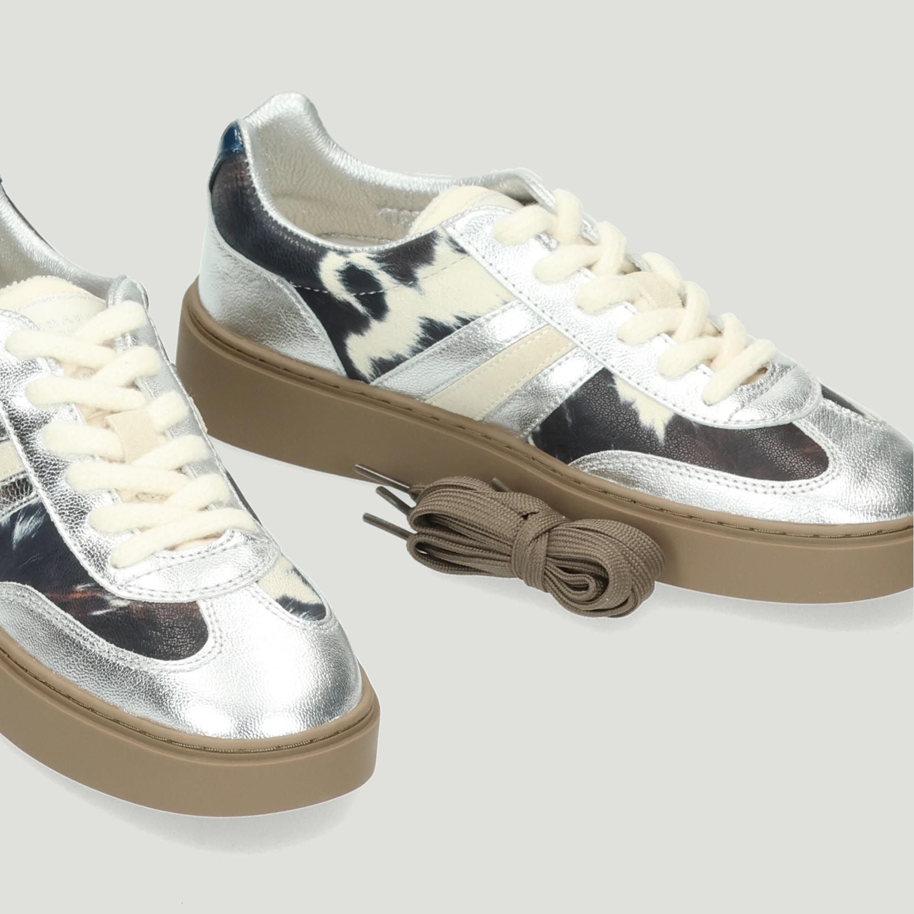 Sneakers in pelle laminata argento e maculata. Chiusura con lacci in cotone ecru'. In dotazione e' presente un laccio marrone in cotone. Iinterno in pelle e tessuto con sottopiede amovibile. Suola in gomma in colore mastice di cm 3. Collezione Serafini donna.
