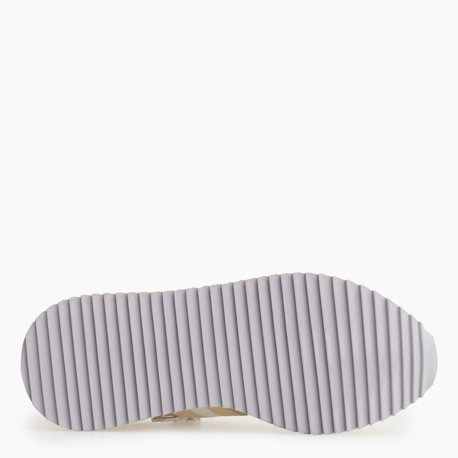 Sneakers in nylon beige e riporti in camoscio in tinta. Lacci in cotone bianco di ricambio. Soletta interna rimovibile. Interni in tessuto e pelle. Suola in gomma di cm 3. Collezione Serafini donna.