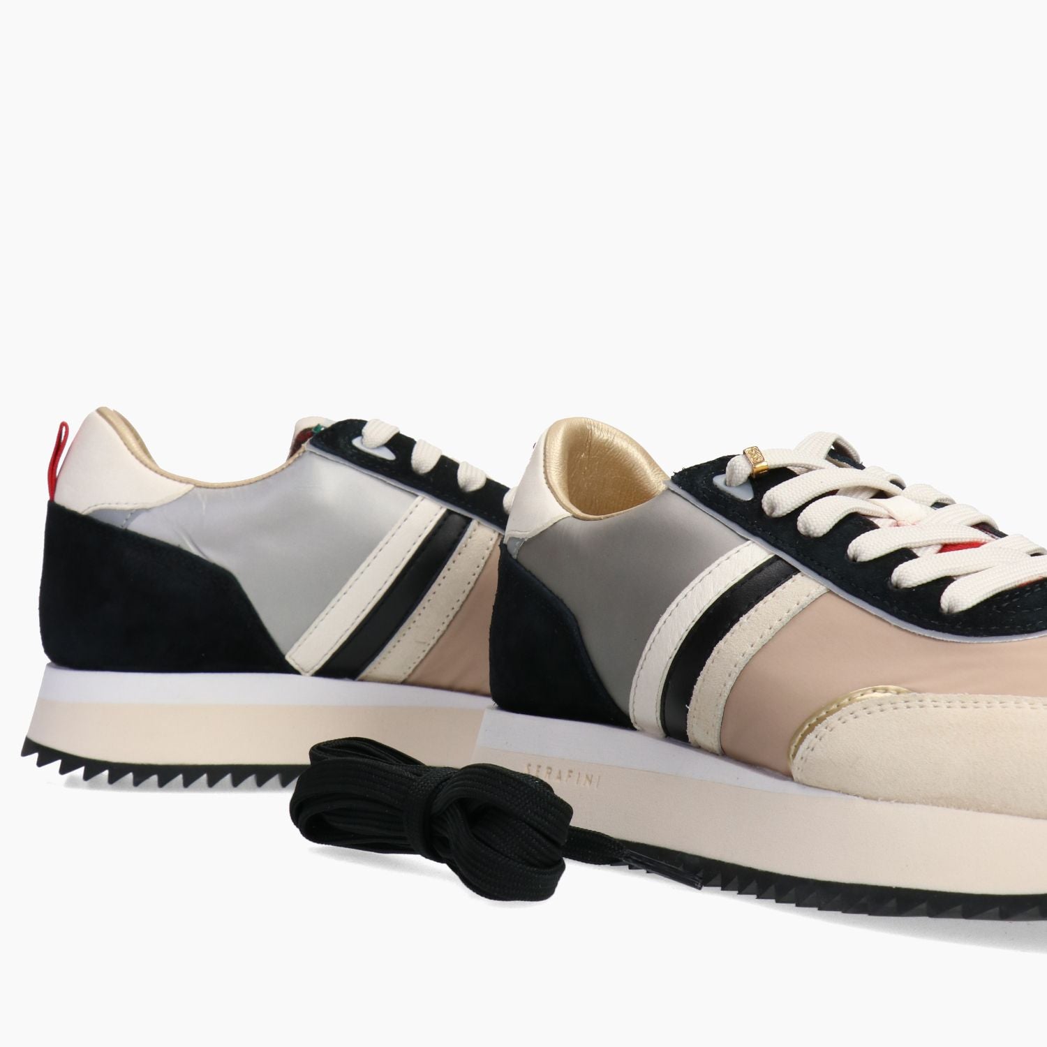 Sneakers in nylon beige e riporti in camoscio in sabbia e nero. Talloncino in pelle di colore latte. Lacci in cotone nero di ricambio. Soletta interna rimovibile. Interni in tessuto e pelle. Suola in gomma di cm 3. Collezione Serafini donna.