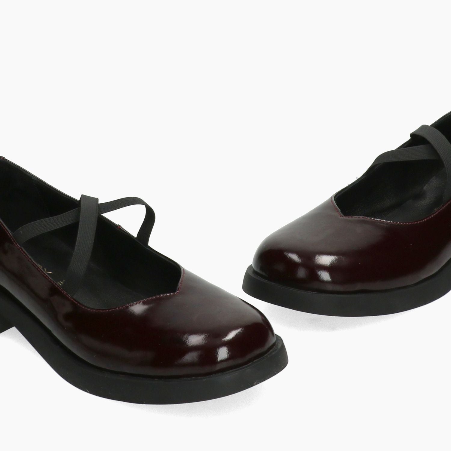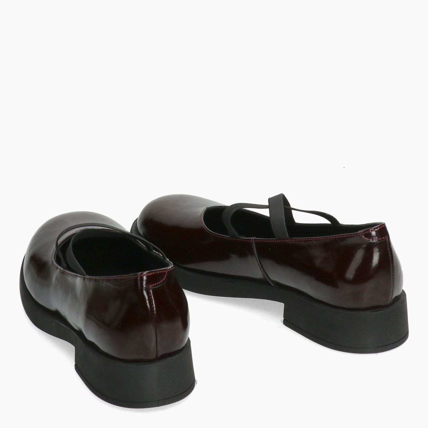 Ballerima in pelle verniciata bordeaux. Cinturino in elastico nero. Interno in pelle. Suola in gomma con tacco di 3 cm. Collezione Shaddy donna autunno/inverno.