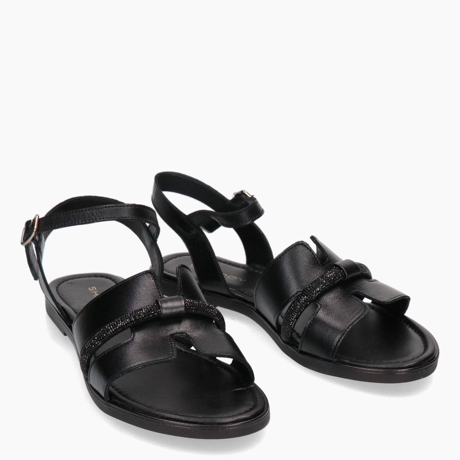 Sandalo in pelle nera con strass neri sulla tomaia a forma di H. Cinturino regolabile con fibbia. Interno in pelle con sottopiede imbottito. Suola in gomma di 1 cm. Collezione Shaddy donna primavera/estate.