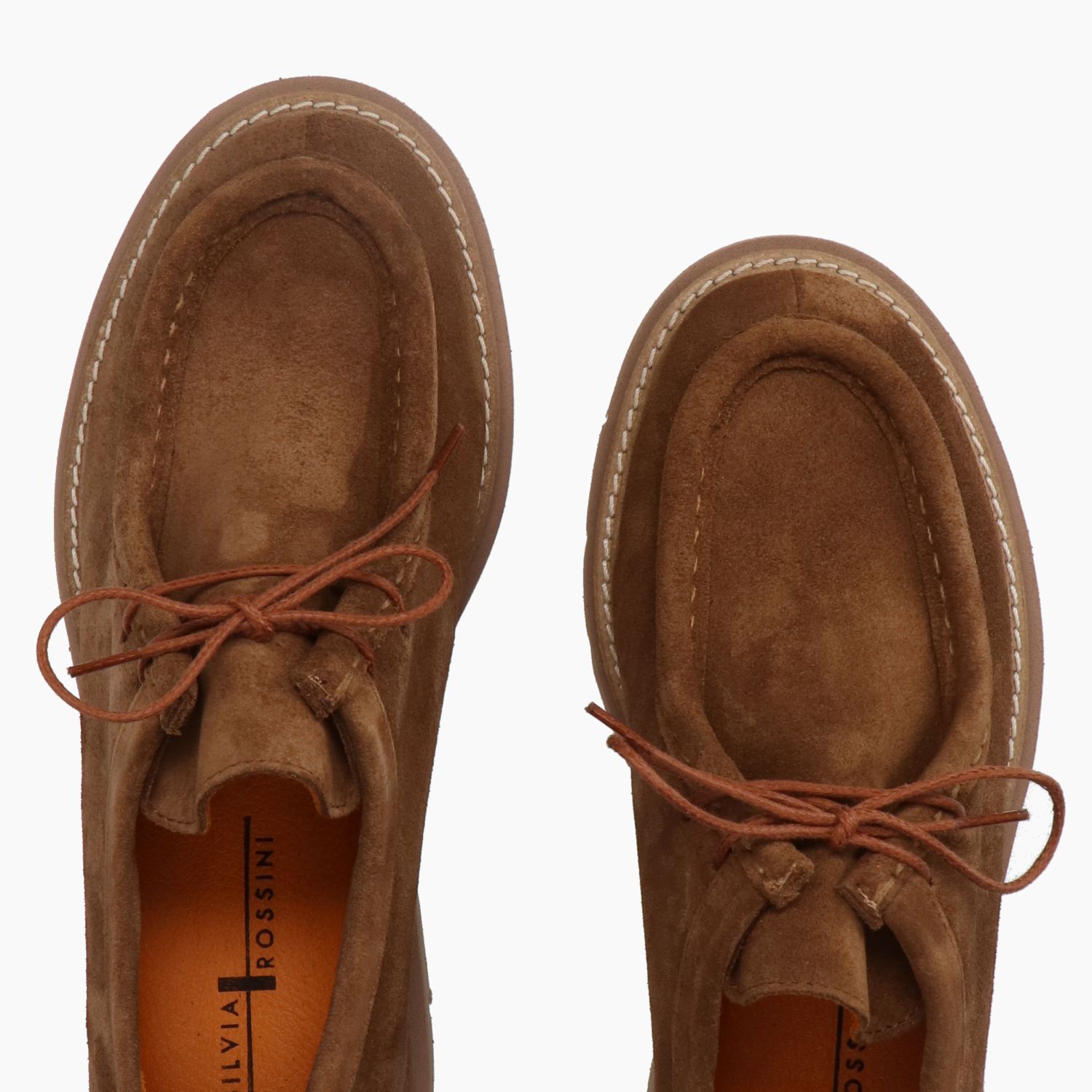 Stringata in pelle scamosciata in colore cuoio. Interno in pelle. Chiusura con lacci. Suola in gomma con tacco di 4 cm. Collezione Silvia Rossini donna Autunno/Inverno.
