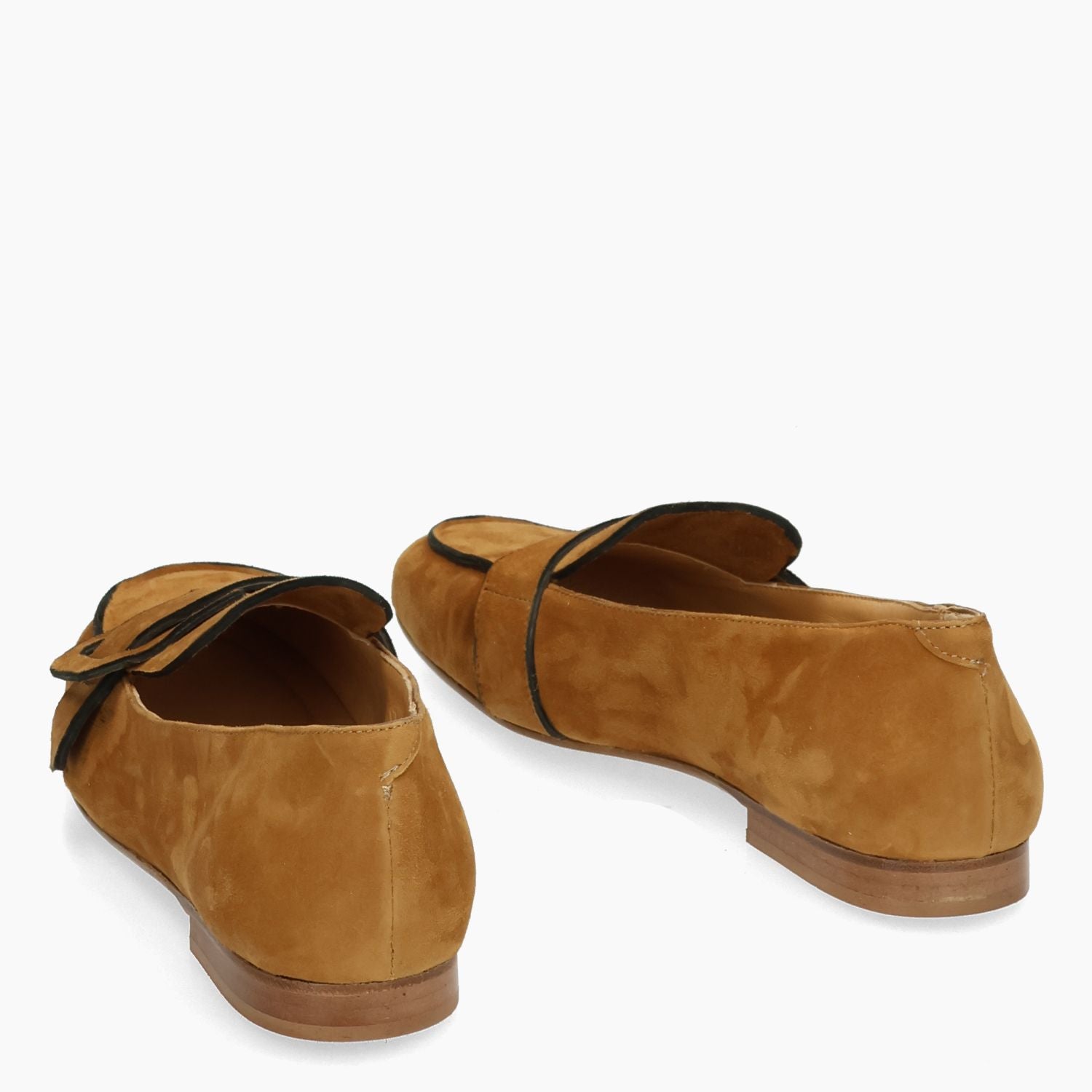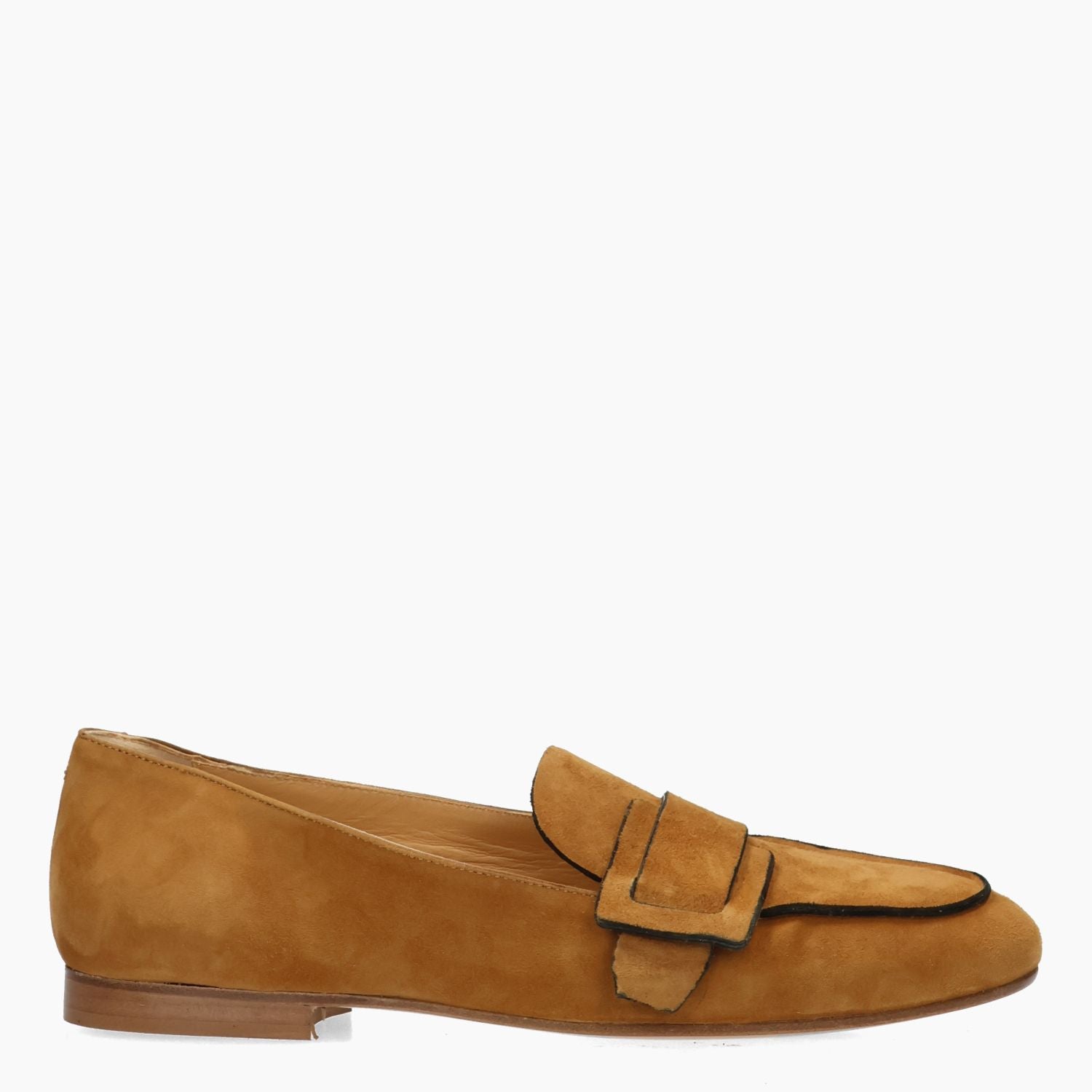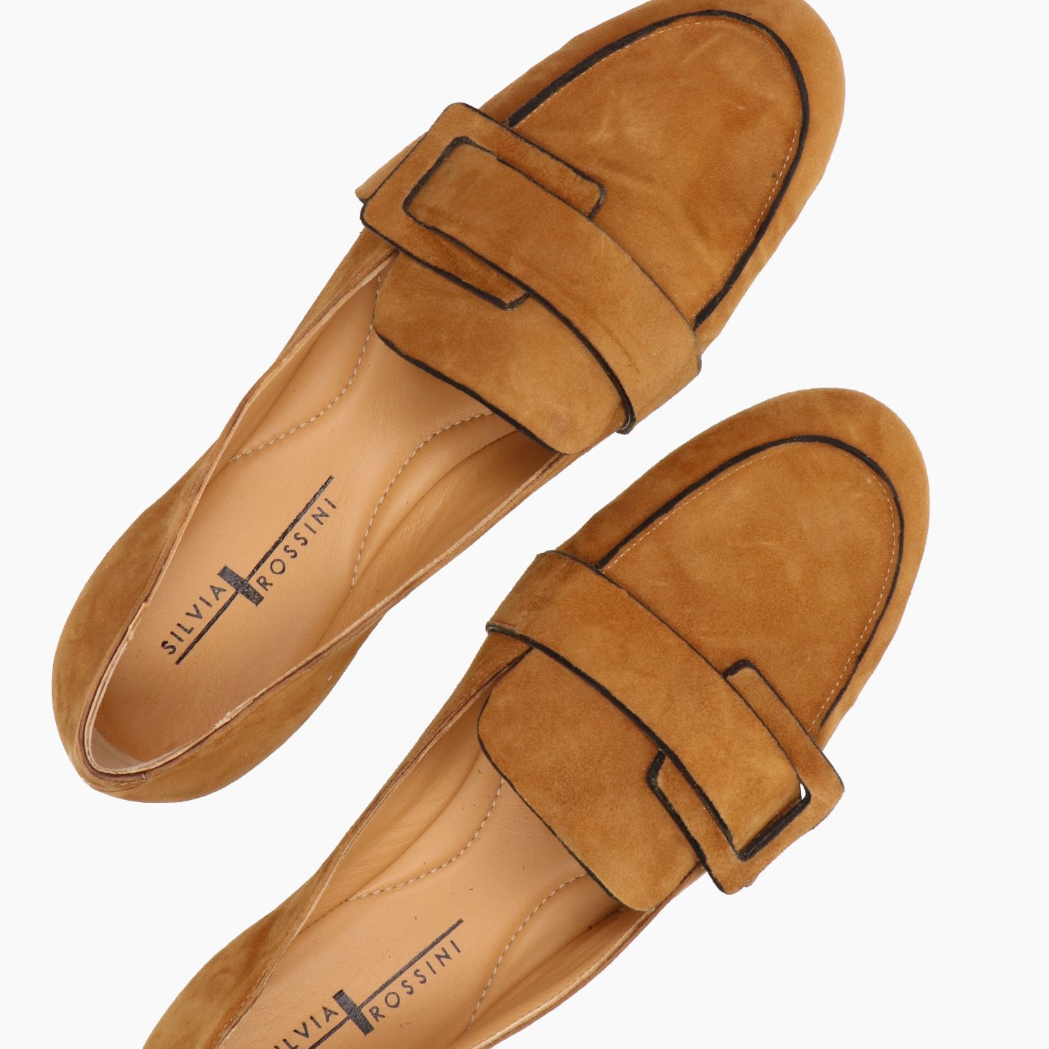 Mocassino in pelle scamosciata cuoio. Fascetta con fibbia tipo cintura non regolabile. Interno in pelle. Suola in cuoio con isola in gomma antiscivolo. Tacco di 1,5 cm. Collezione Silvia Rossini donna primavera/estate.