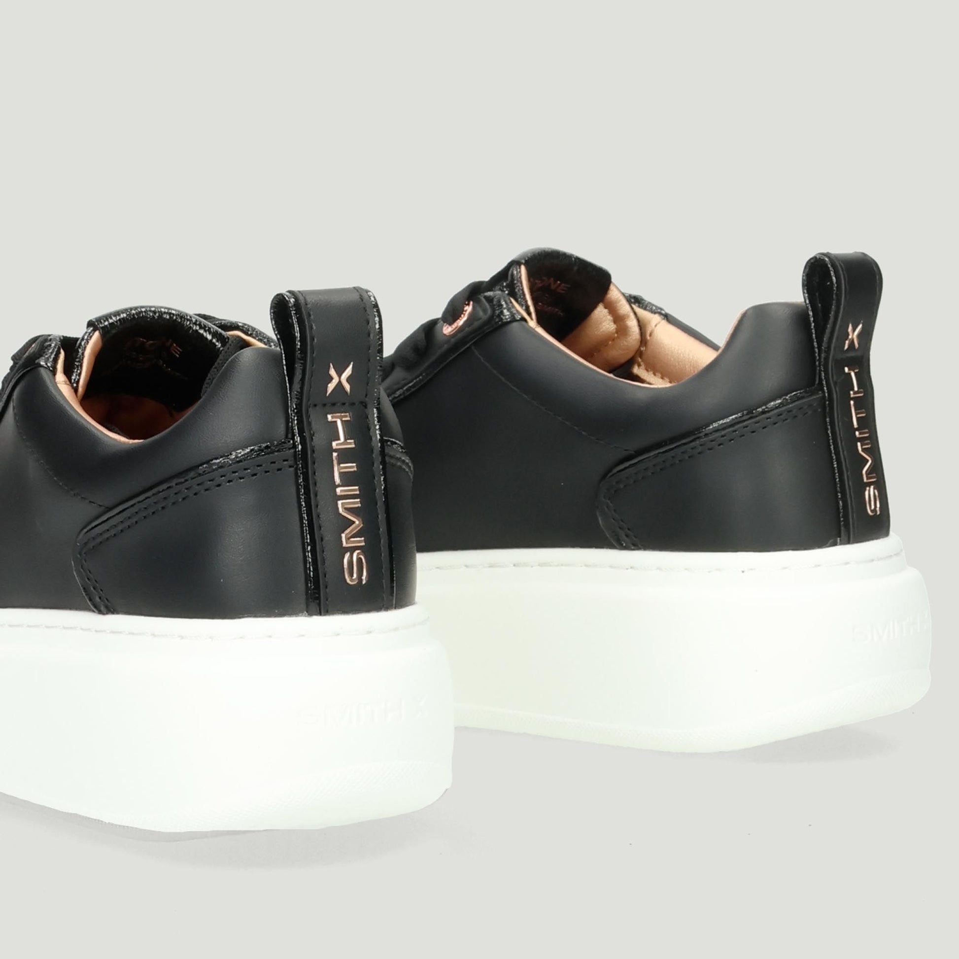 Sneakers Stone con tomaia in ecopelle nera. Profili in ecopelle laminata nera. Tallone con logo. Sottopiede estraibile in ecopelle con interni in tessuto. Chiusura con lacci in cotone. Linguetta con logo. Suola in gomma di 5 cm. Collezione Smith X donna.
