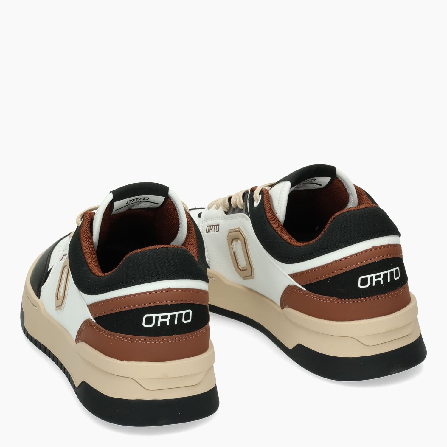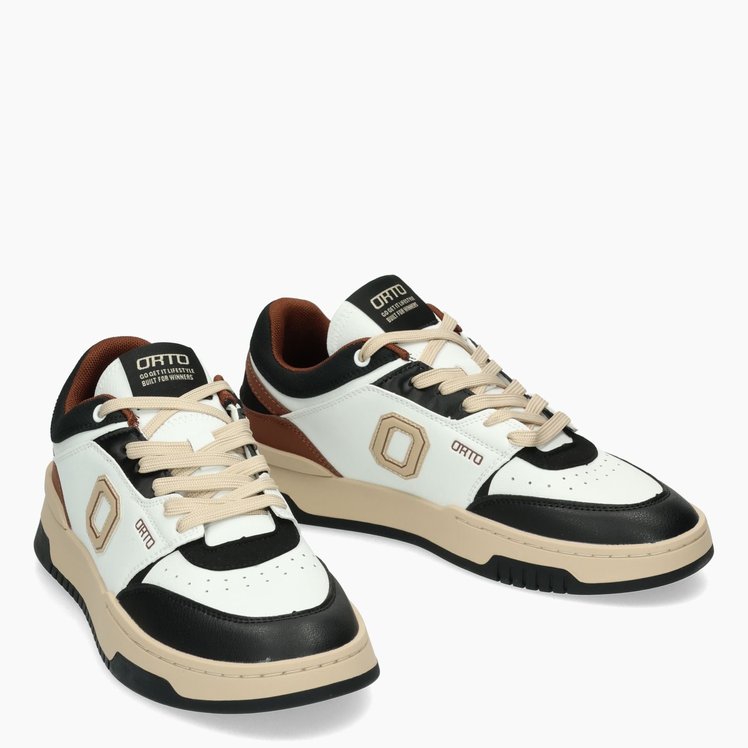 Sneakers con tomaia in ecopelle in colore offwhite. Logo beige con riporti neri e marroni. Chiusura con lacci in cotone beige. Interno in tessuto con sottopiede estraibile. Suola in gomma. Collezione Orto uomo.