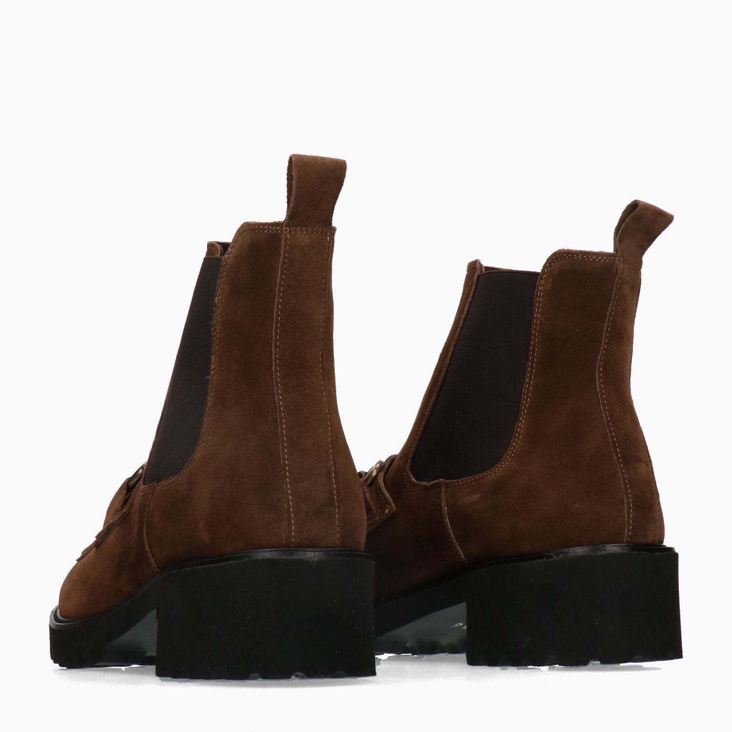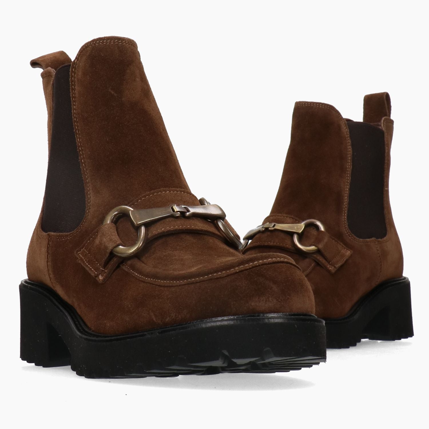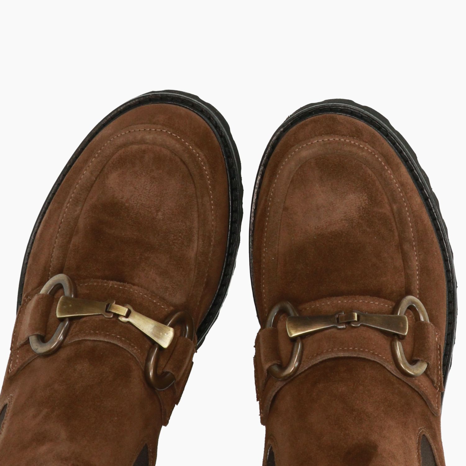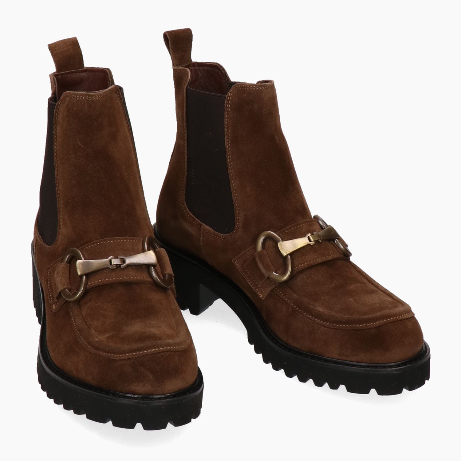 Beatles in camoscio in colore marrone. Bande elastiche sui lati e fascetta con morsetto ottonato. Interno in pelle. Soletta interna non rimovibile. Suola in gomma microporosa di colore nero. Tacco in gomma di 5 cm. Collezione Marco Venexia donna Autunno/Inverno.