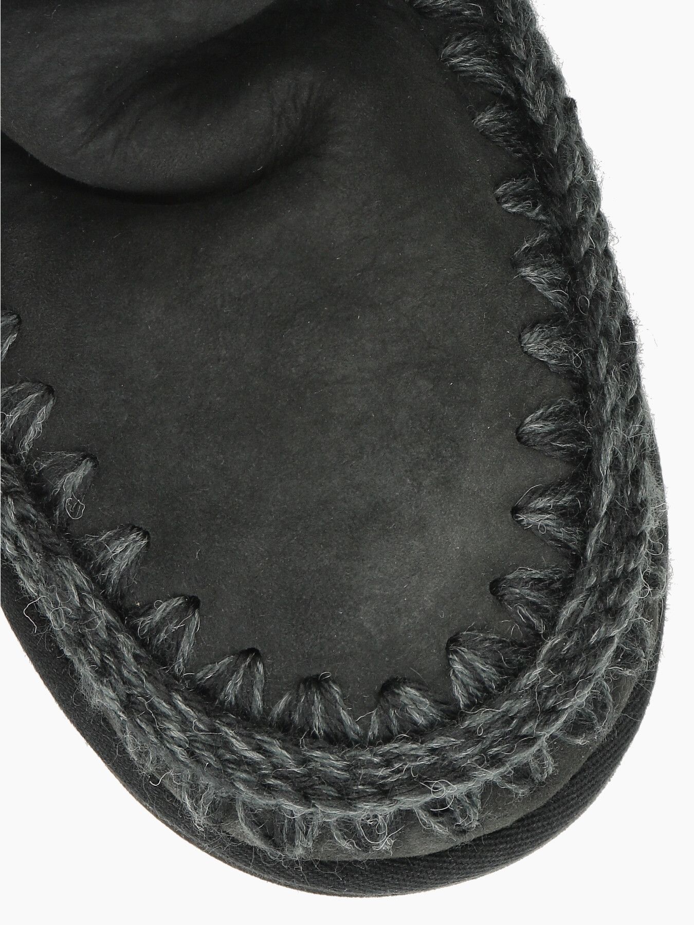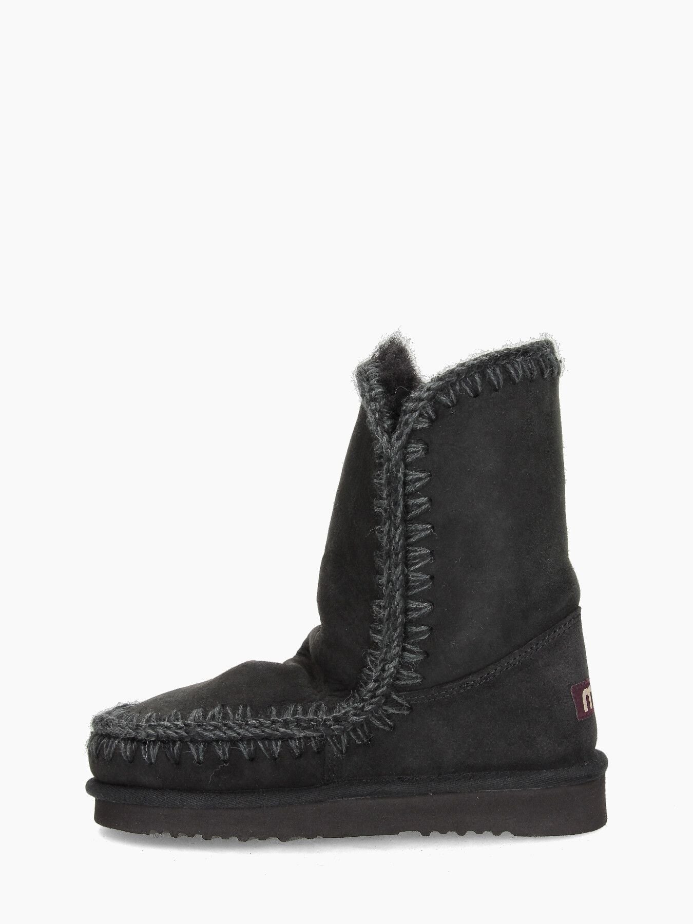 Mou Eskimo24 con tomaia in pelle scamosciata in colore nero. Cuciture in lana melange in tinta. Punta tonda. Logo in tessuto nel tallone. Interno in pelo. Suola in gomma. Collezione Mou donna Autunno/Inverno.