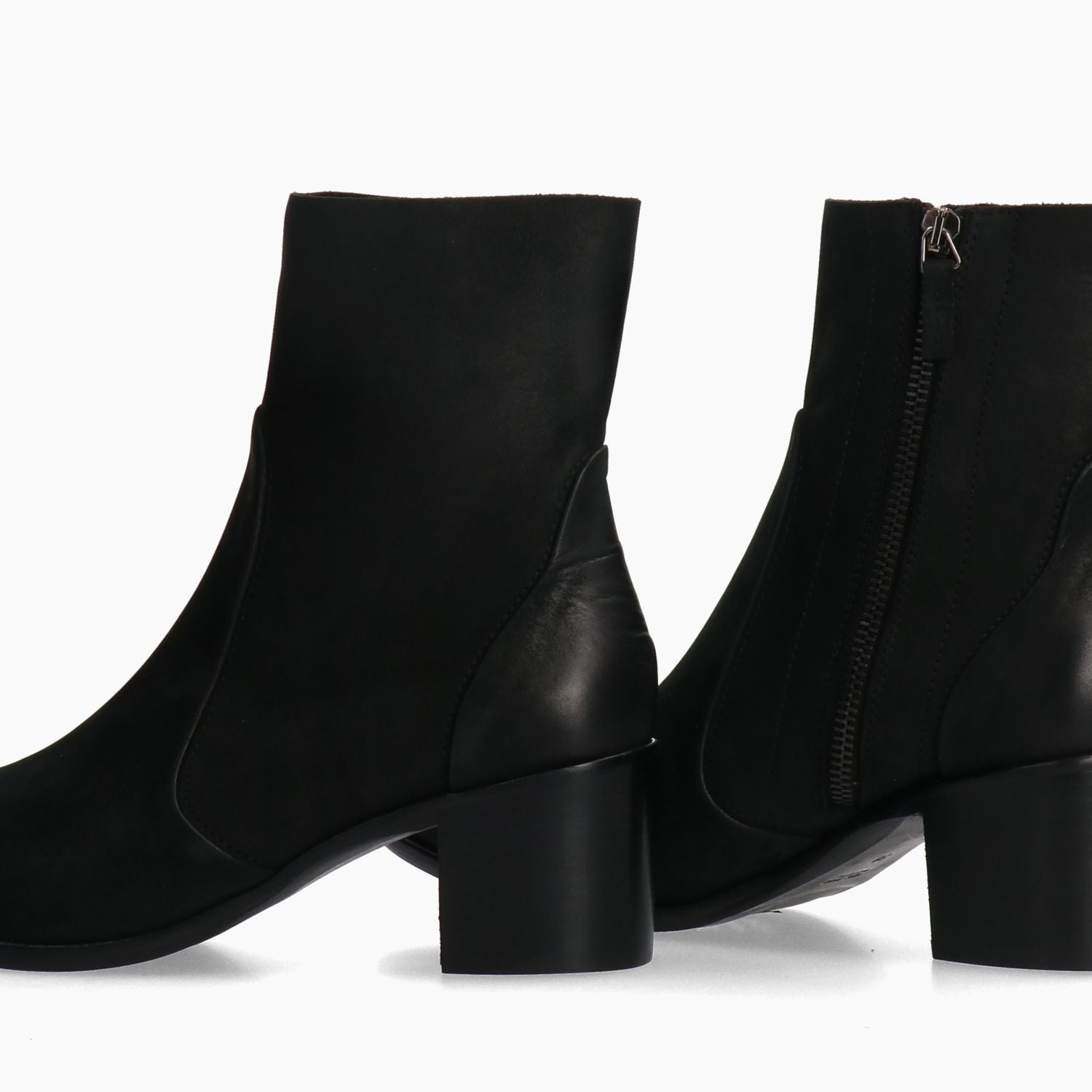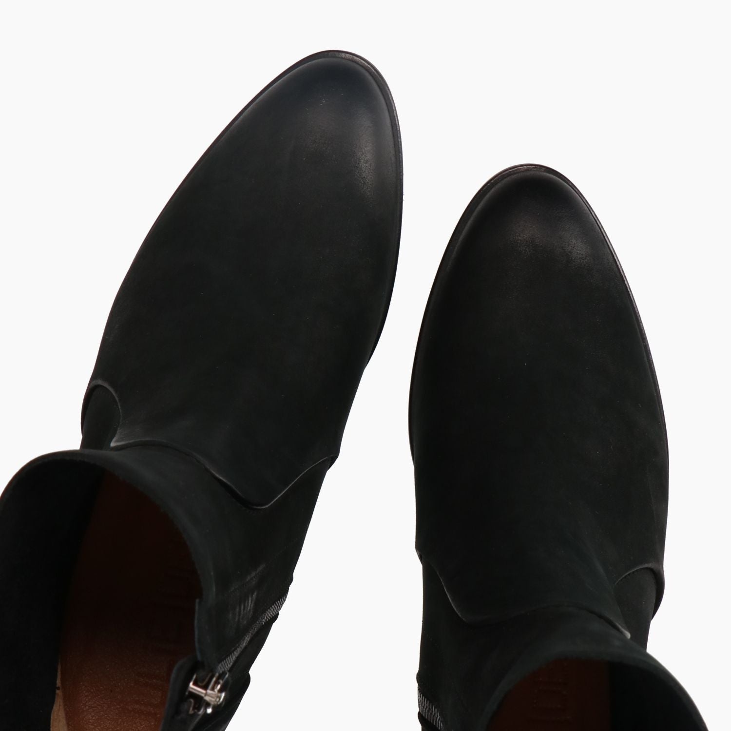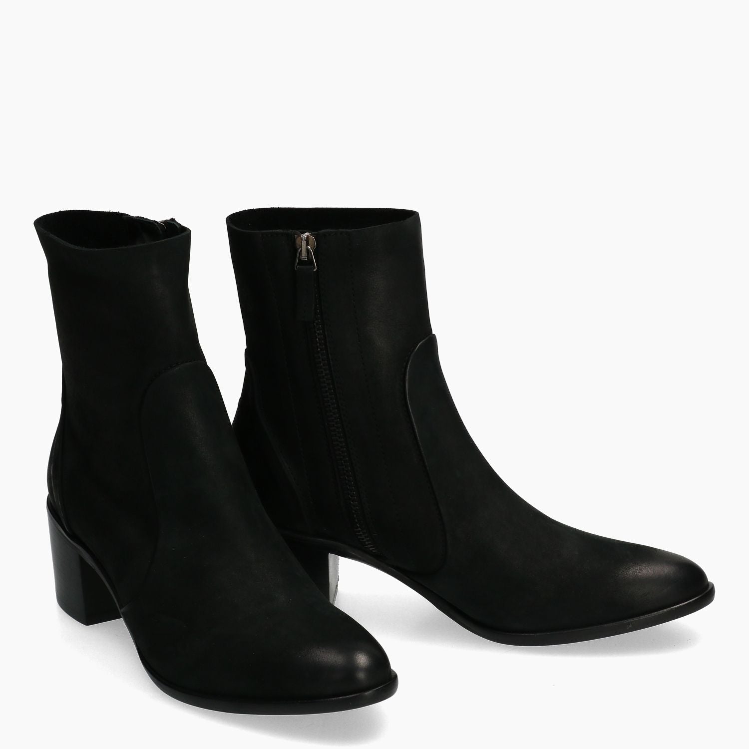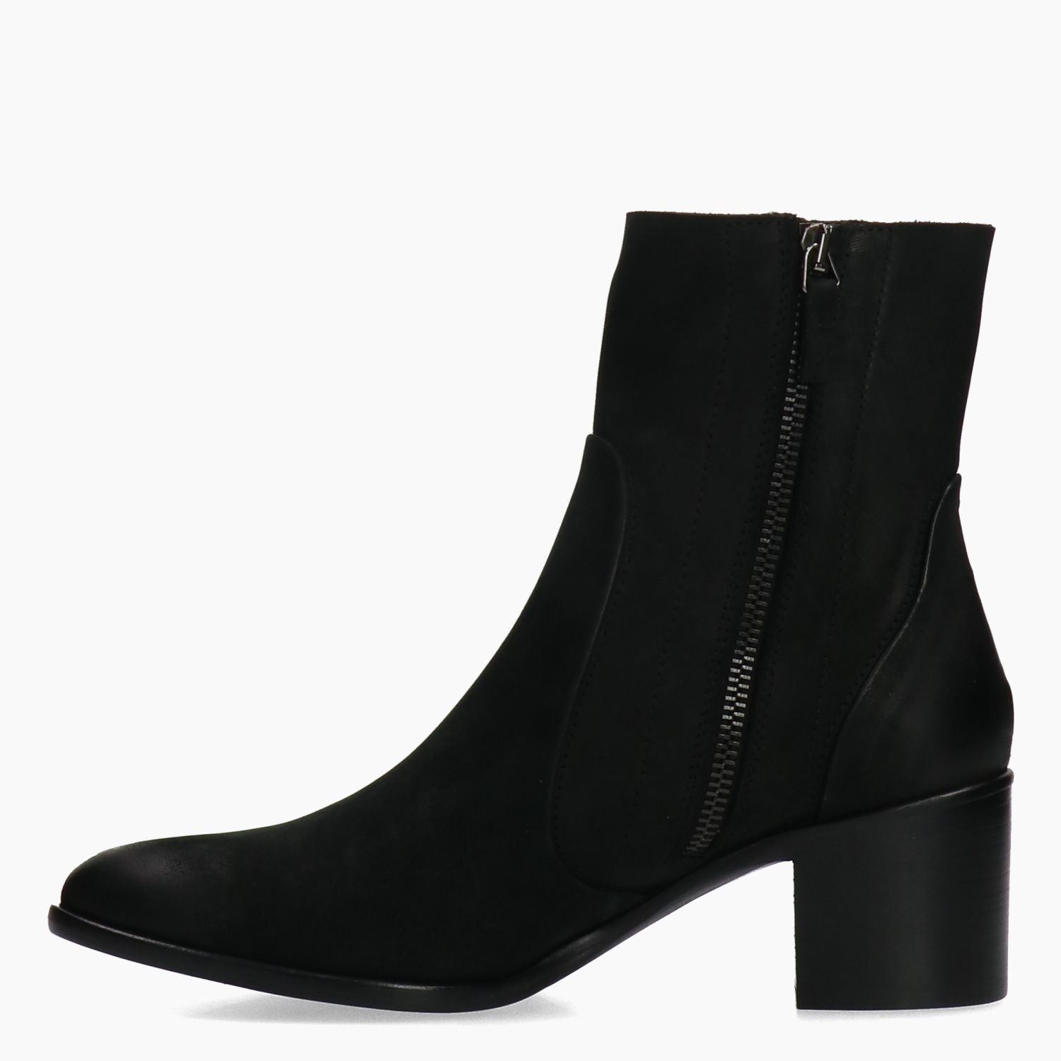 Stivaletto in nabuk nero. Chiusura laterale con zip. Gambale morbido e sfoderato. Soletta interna non rimovibile. Suola in cuoio e gomma con tacco di 5 cm. Collezione Julie Dee donna Autunno/Inverno.