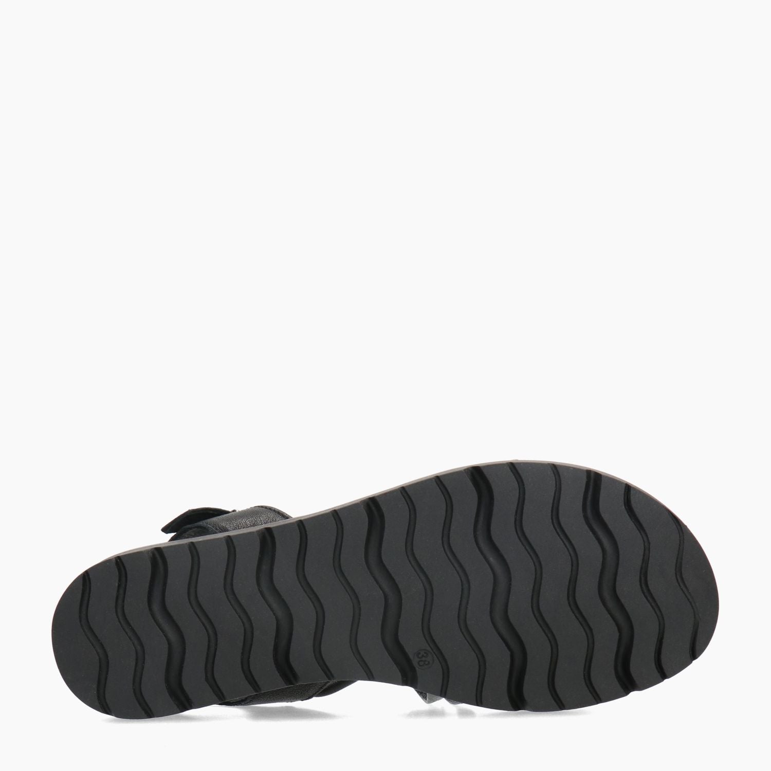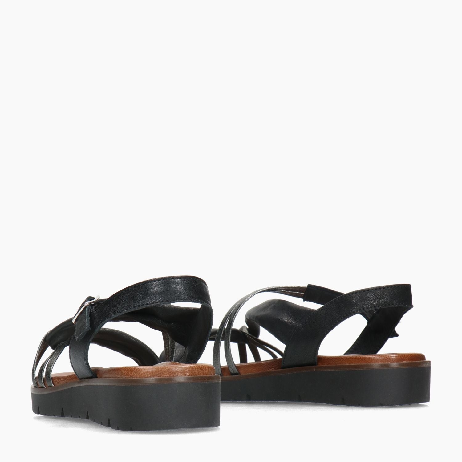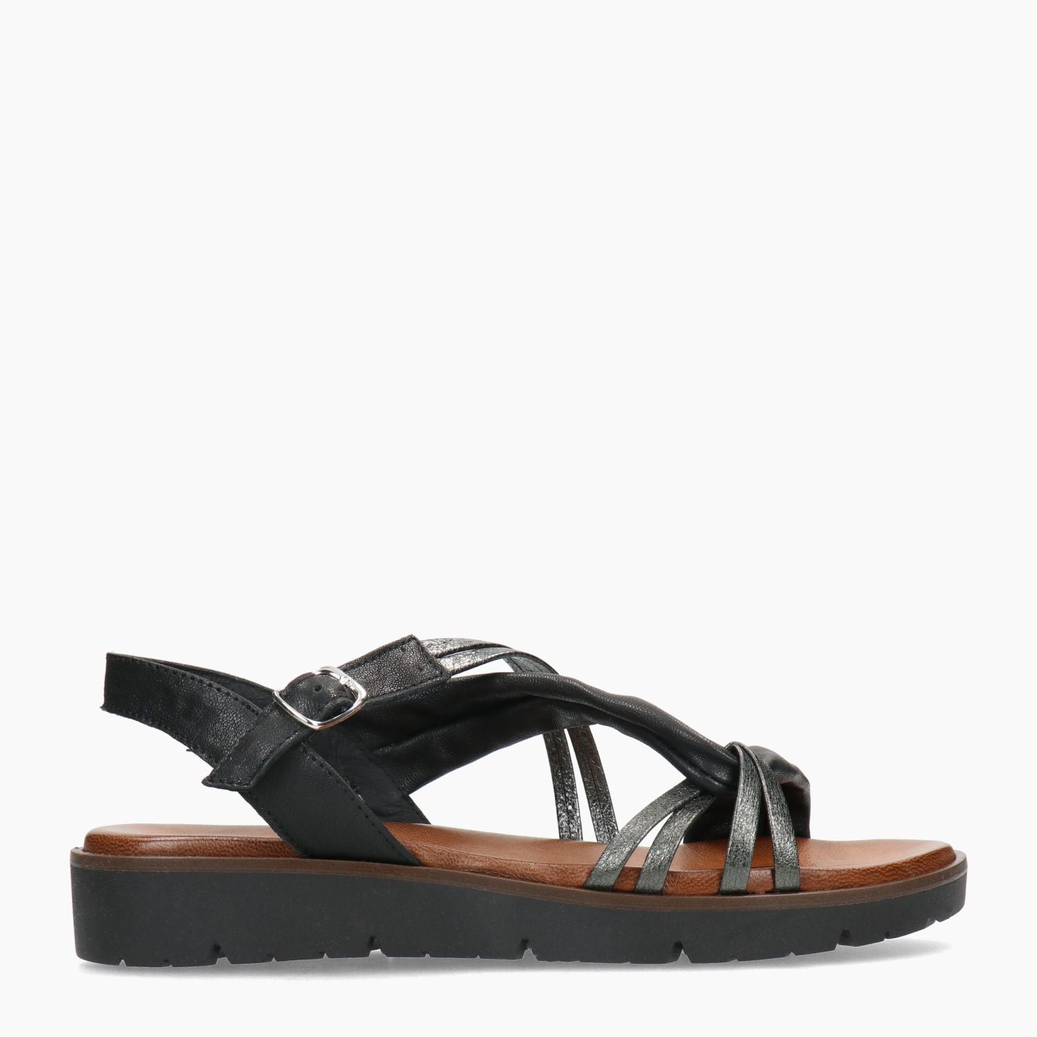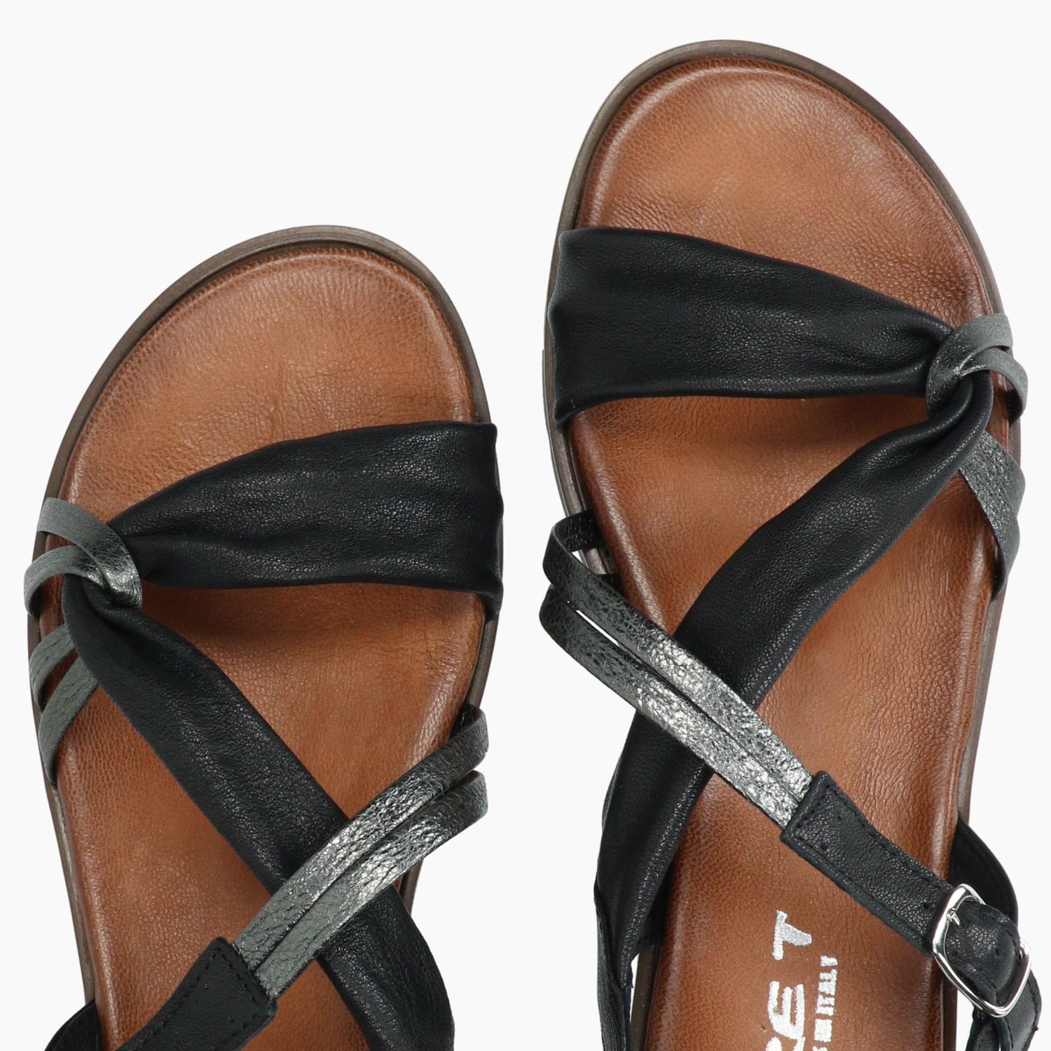 Sandalo Tre T con tomaia in pelle nera con mignon in pelle laminata cannadi fucile. Chiusura con cinturino. Interno in pelle con sottopiede imbottito. Suola in gomma con zeppa di 3,5 cm. Collezione Tre T donna Primavera/Estate.