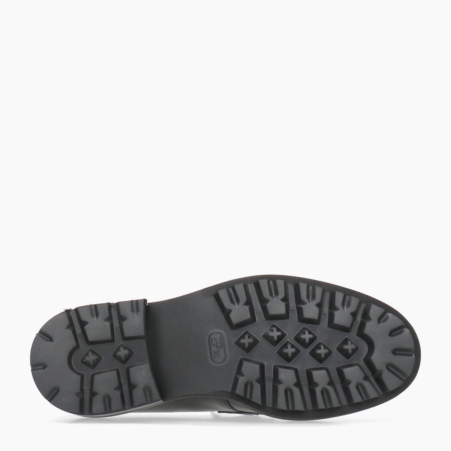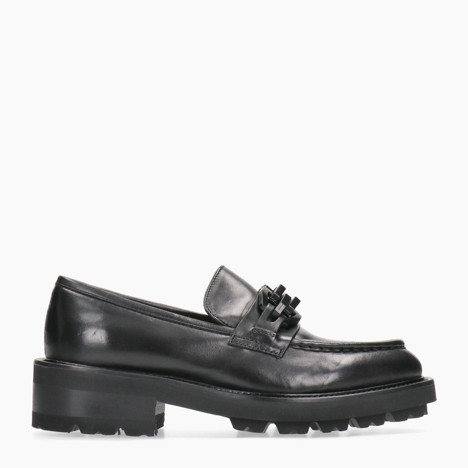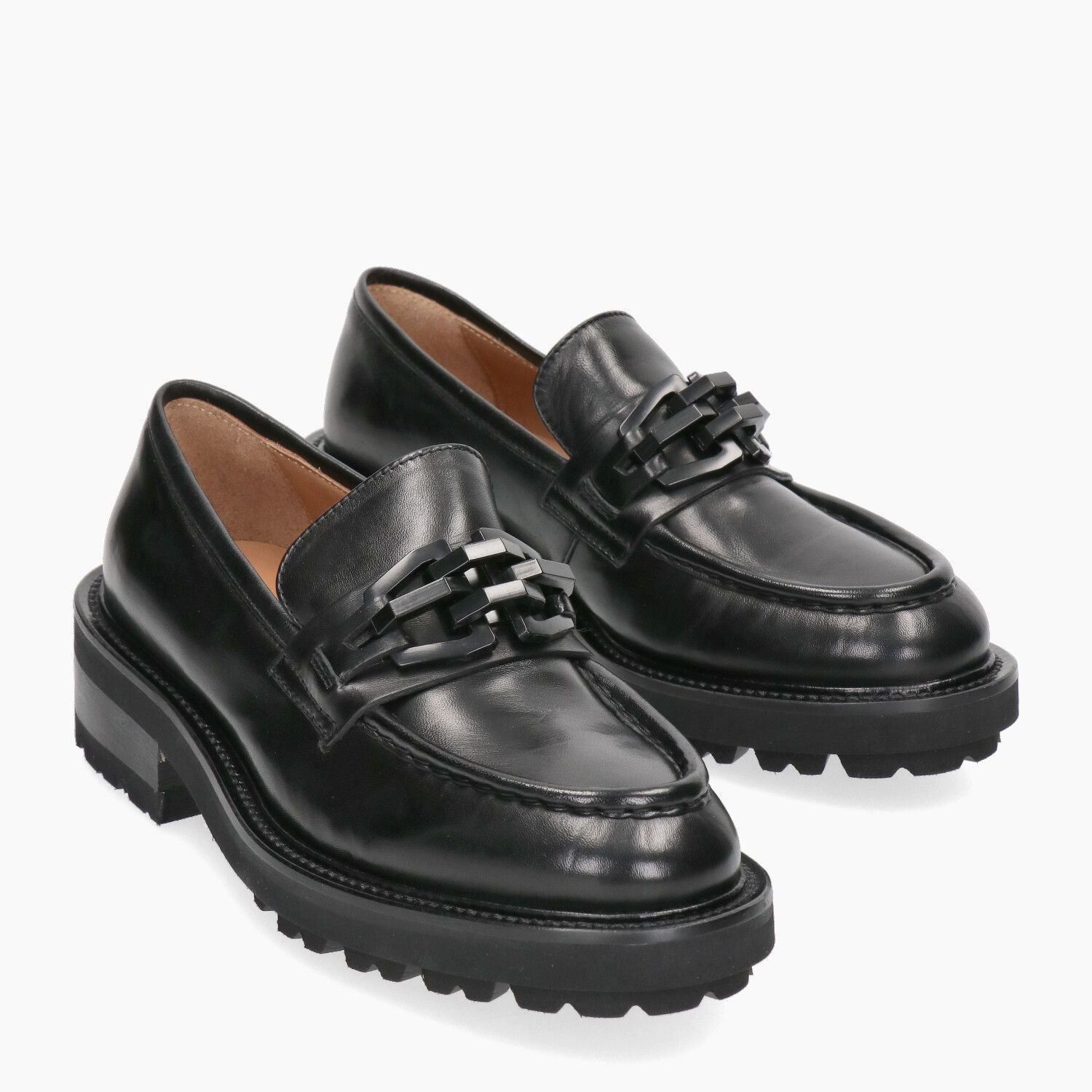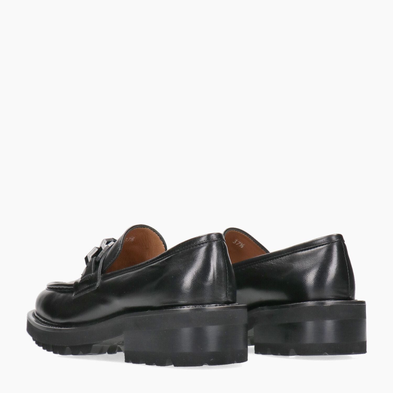 Mocassini in pelle nera con accessorio in metallo canna fucile, fondo gomma.