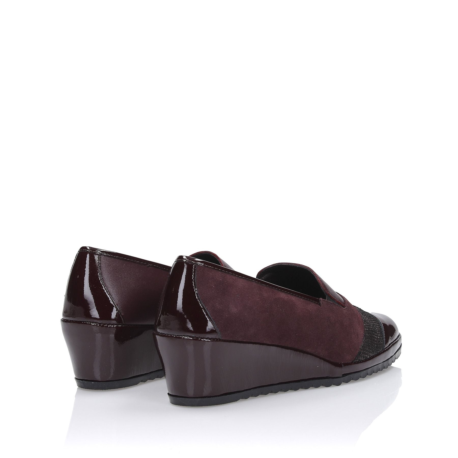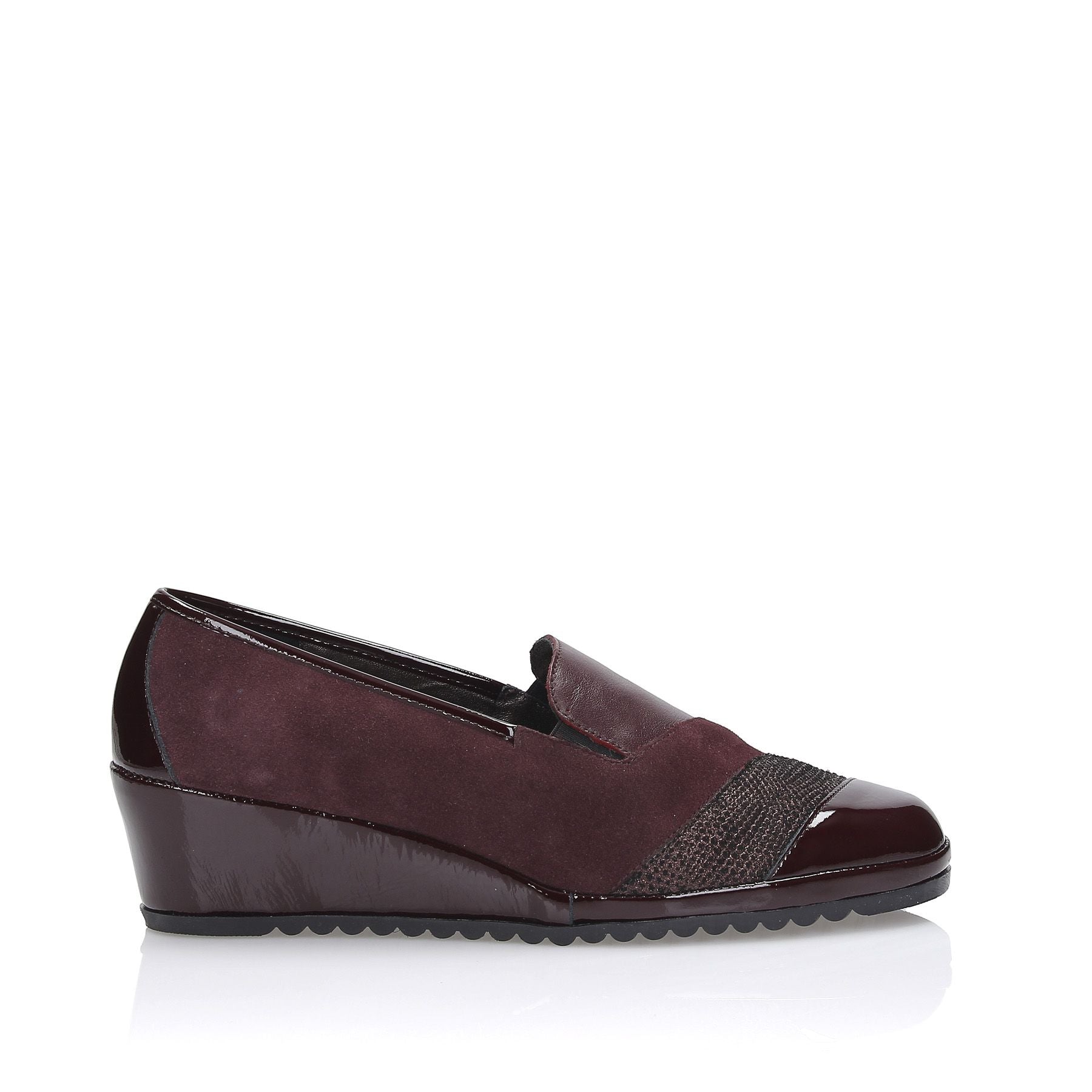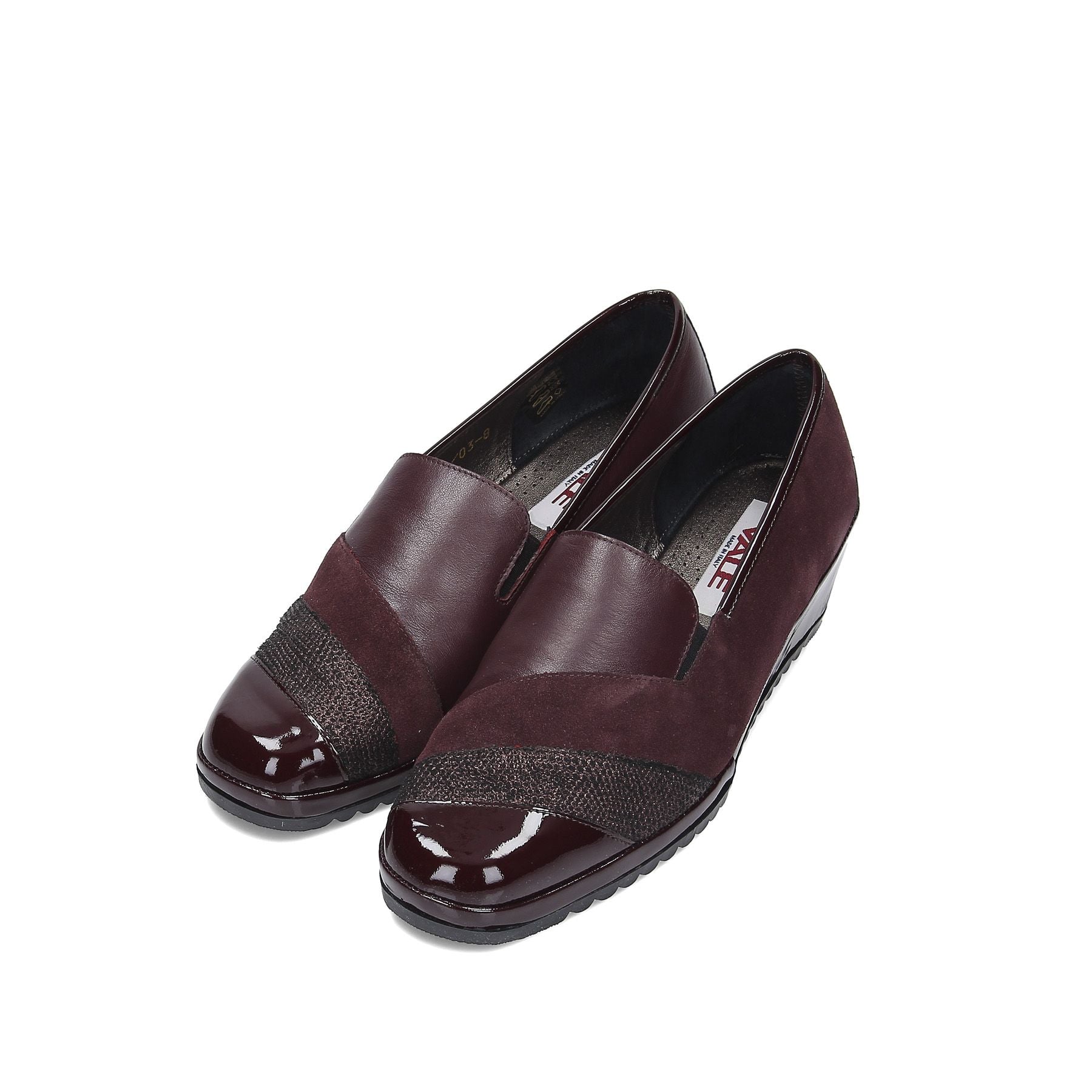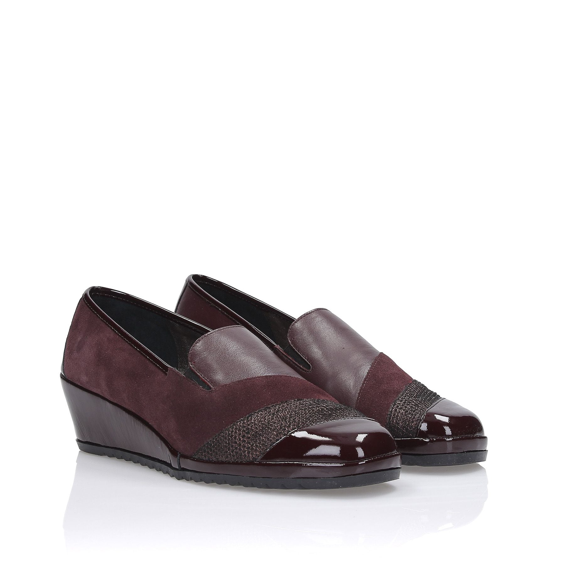 Pantofole in camoscio bordeaux con puntale in vernice, zeppa 40 fondo gomma.