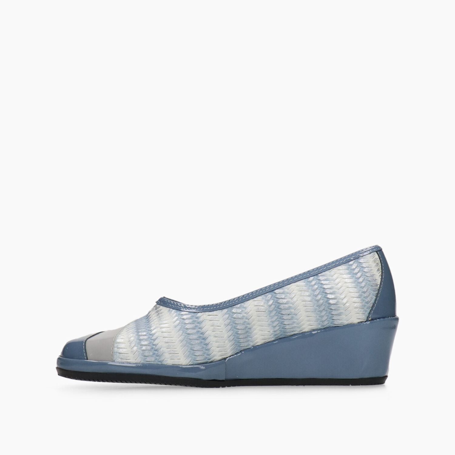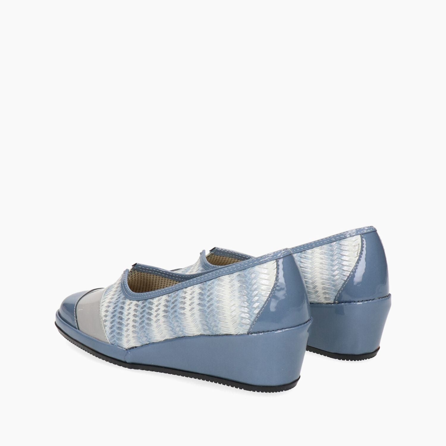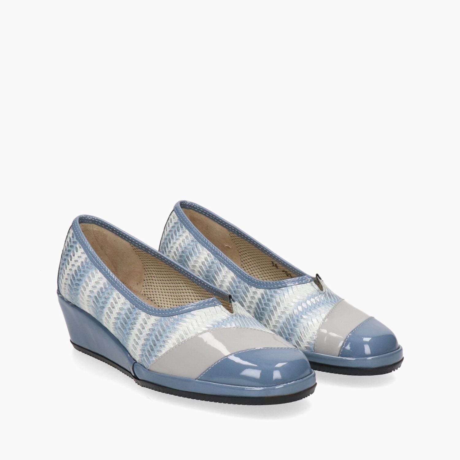 Decollete in pelle stampata fantasia multicolore con banda anteriore in vernice grigia, zeppa 40 fondo gomma.