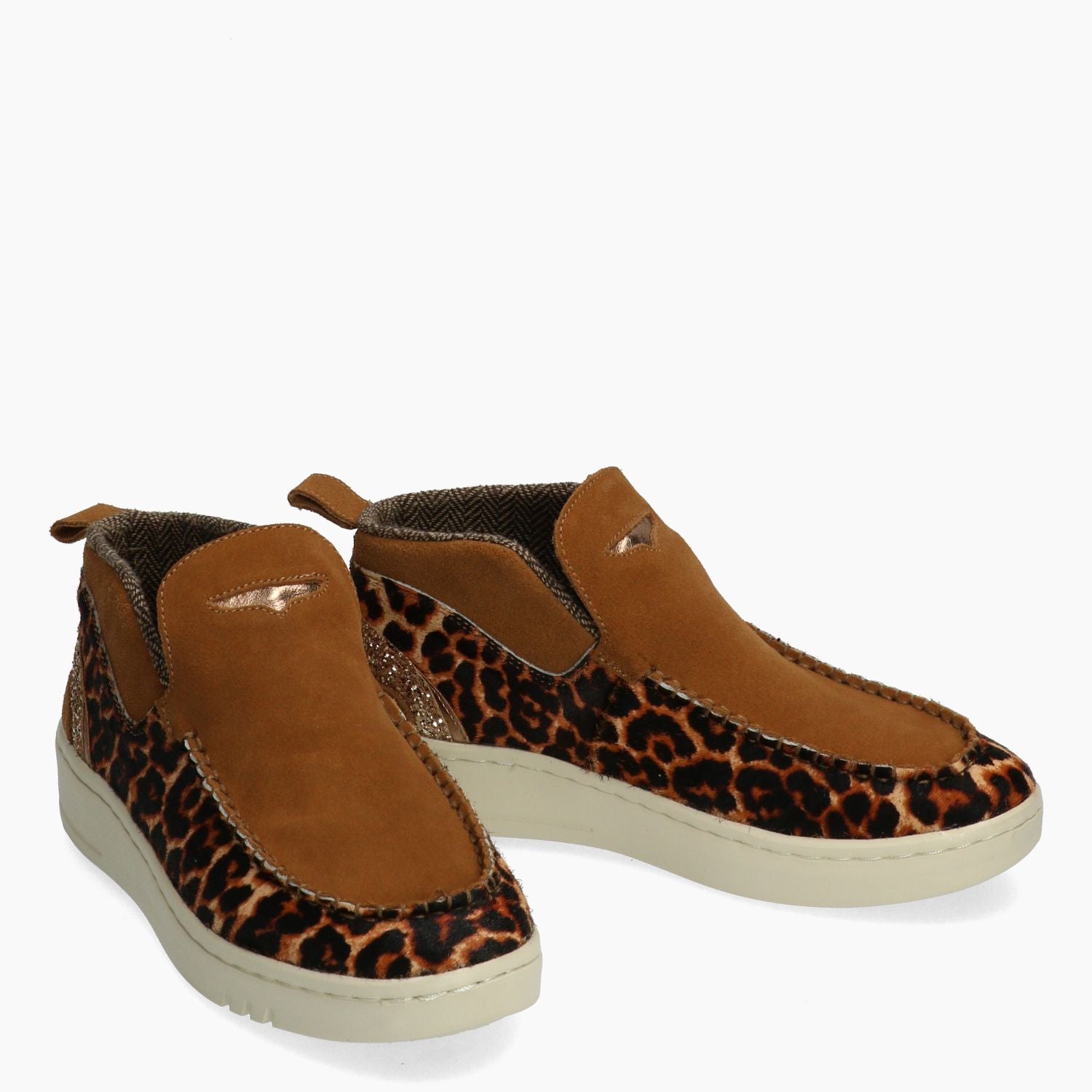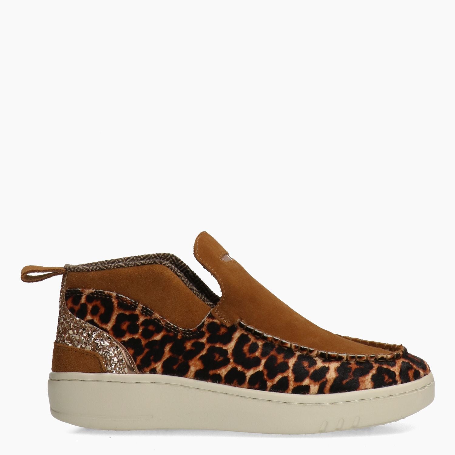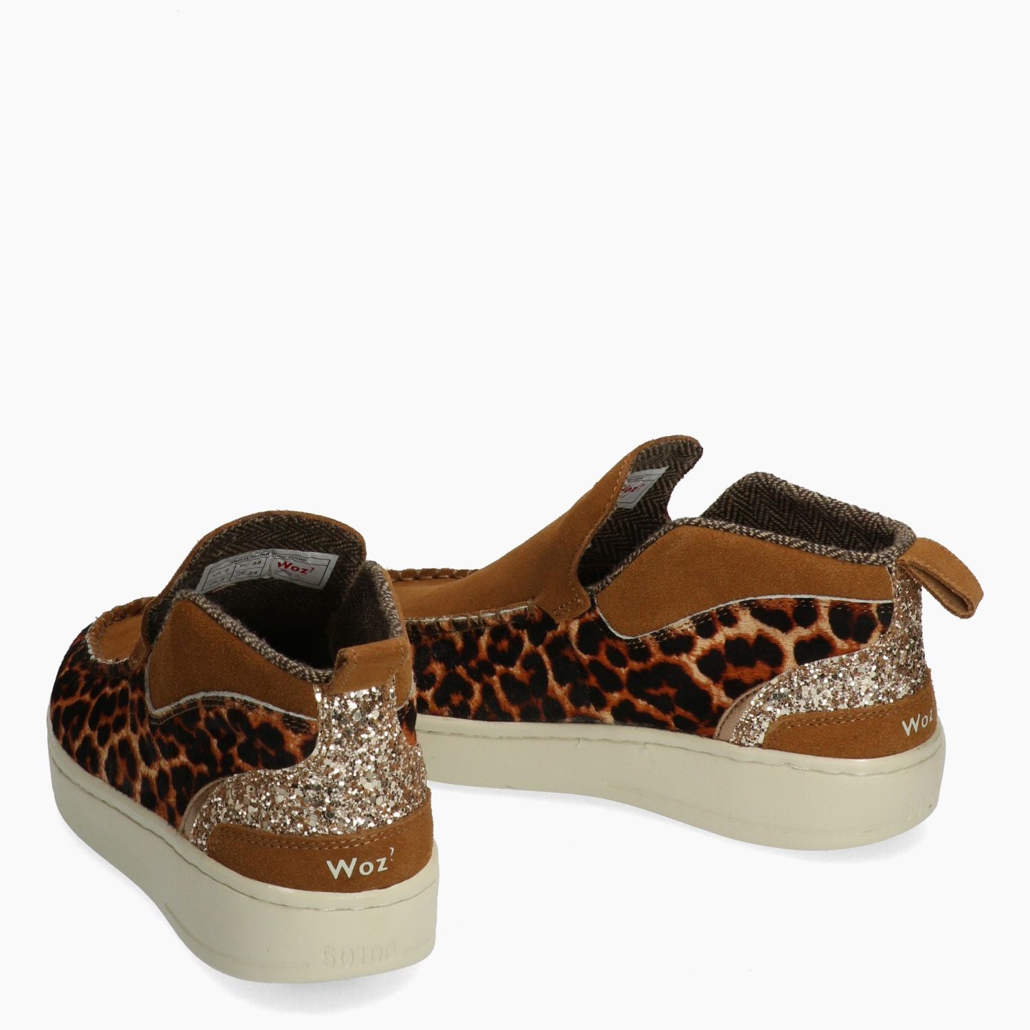 Slip on mid in camoscio cuoio e cavallino maculato foderato in tessuto spigato. Tallone in glitter oro. Sottopiede estraibile. Suola in gomma di 3 cm. Collezione Donna Woz? Autunno/Inverno.