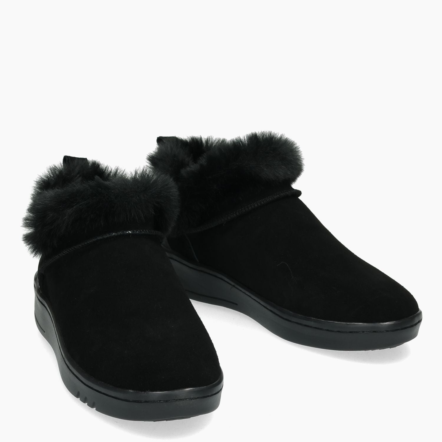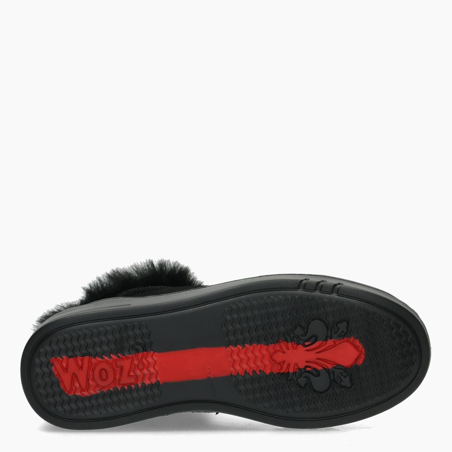 Slip on Mid in camoscio nero con fodera in eco pelo nero. Sottolpiede estraibile. Suola in gomma di 3,5 cm. Collezione Donna Woz? Autunno/Inverno.