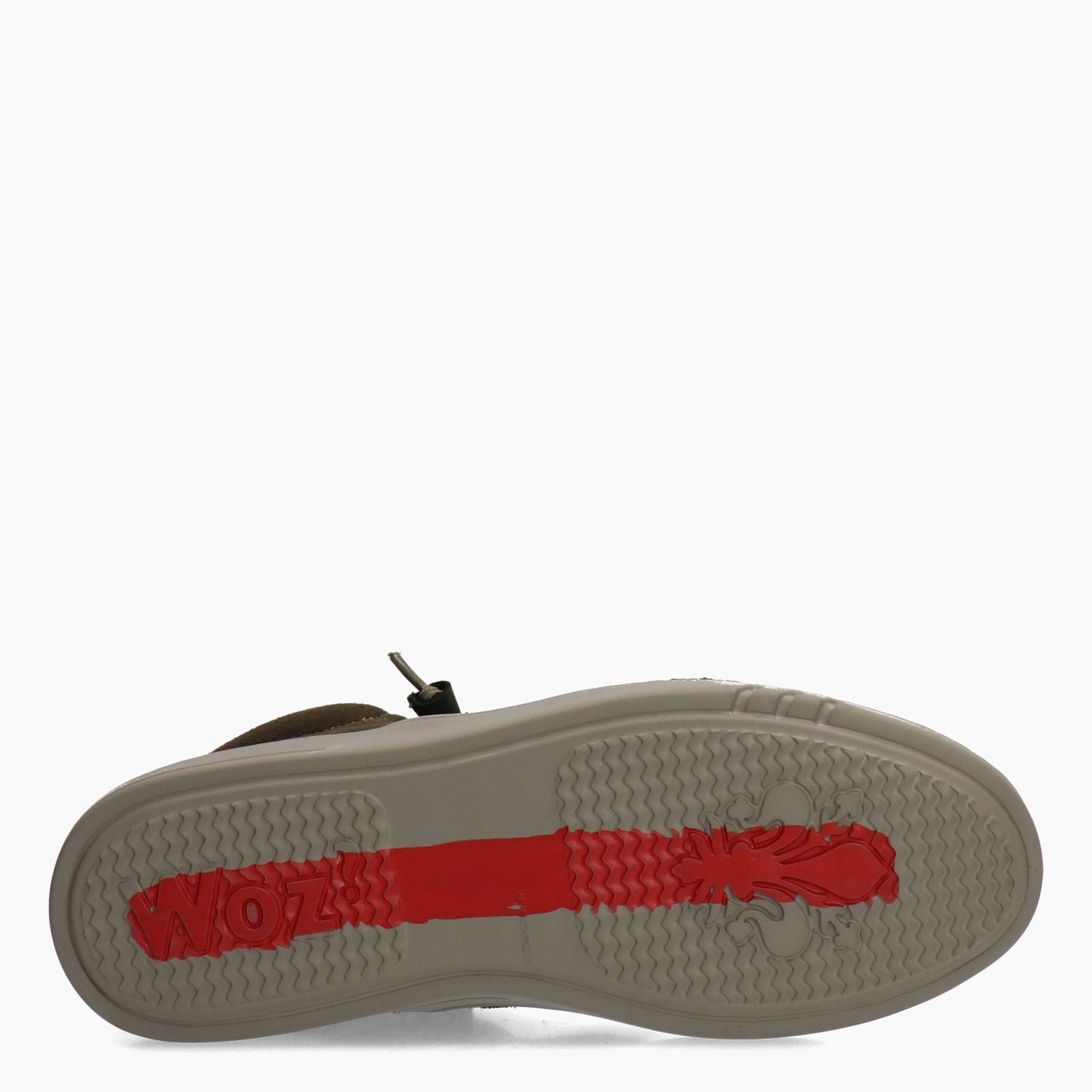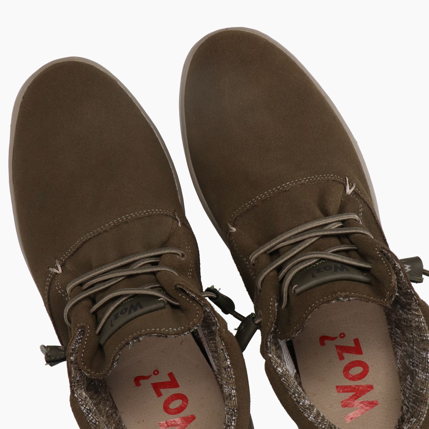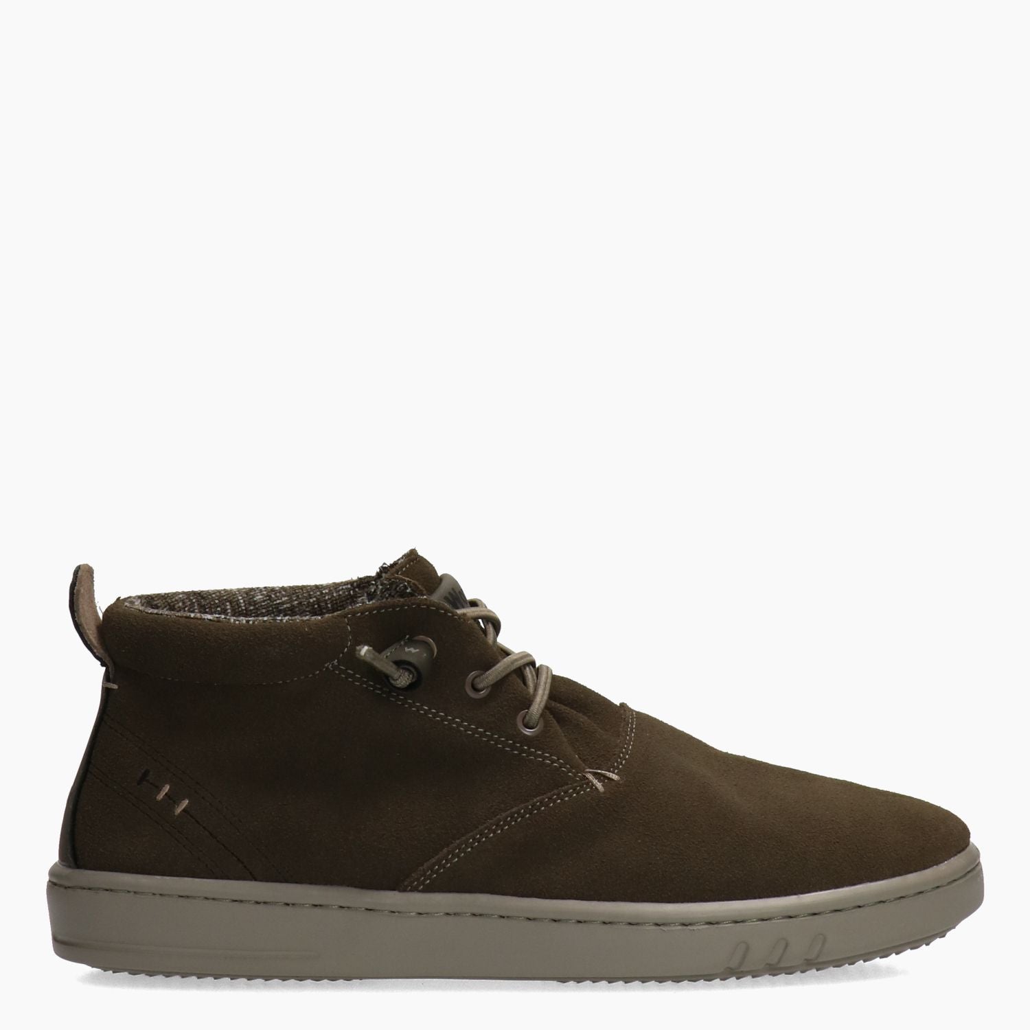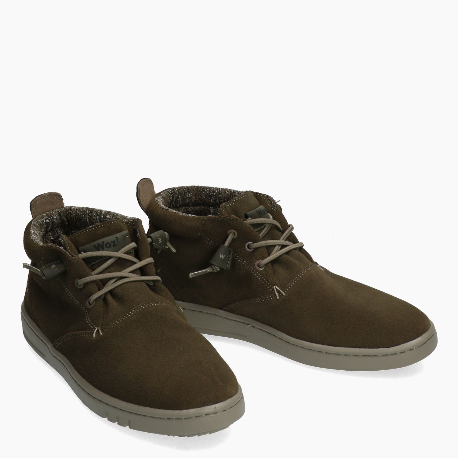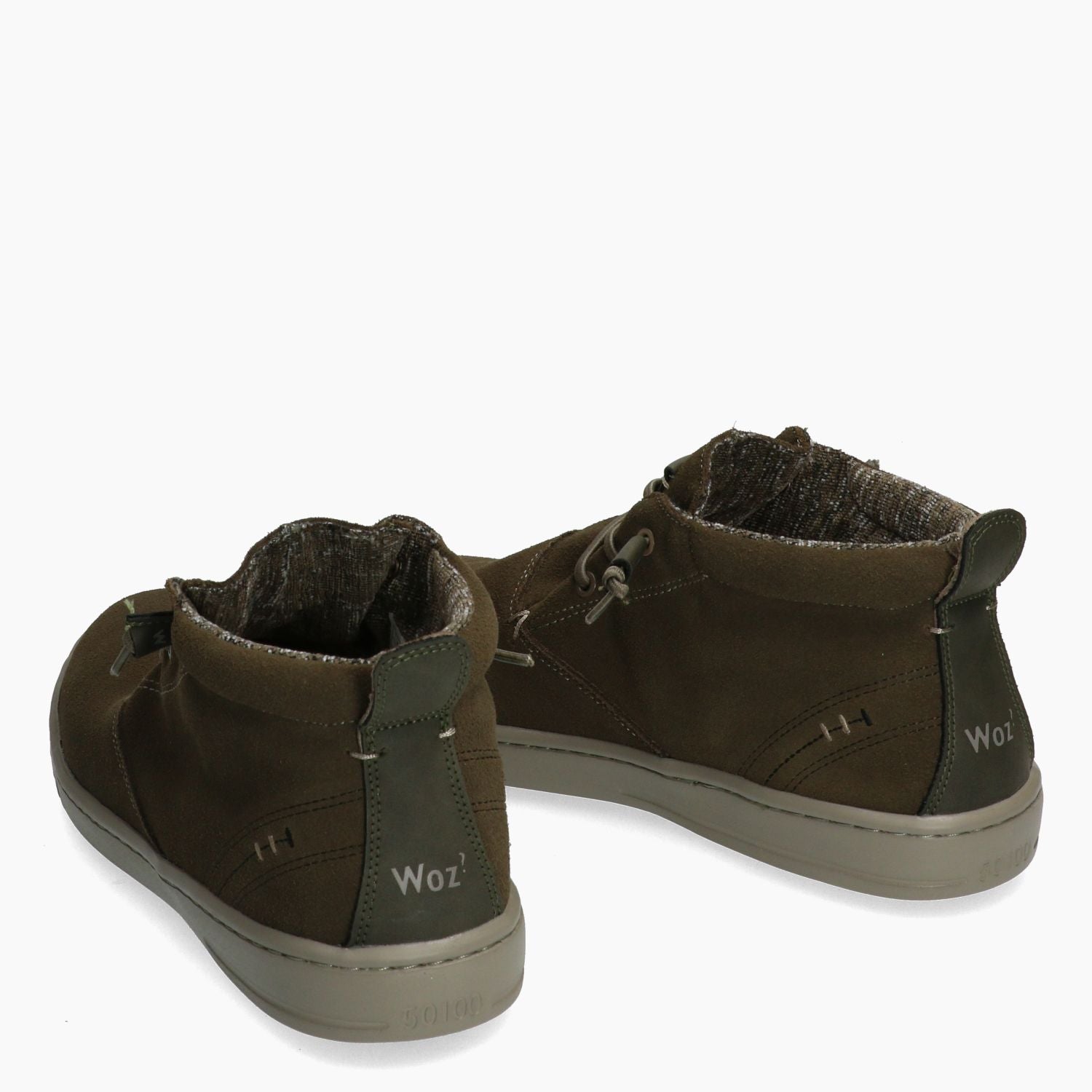 Polacchino in camoscio kaki foderato in tessuto melange. Lacci in elastico per la calzata tipo slip on. Sottopiede estraibile. Suola in gomma. Collezione Uomo Woz? Autunno/Inverno.
