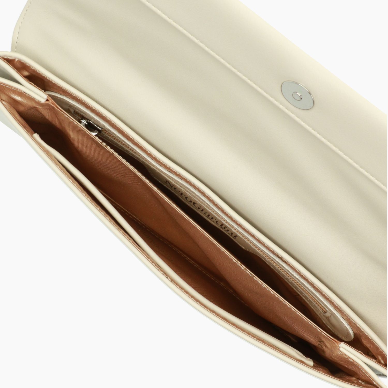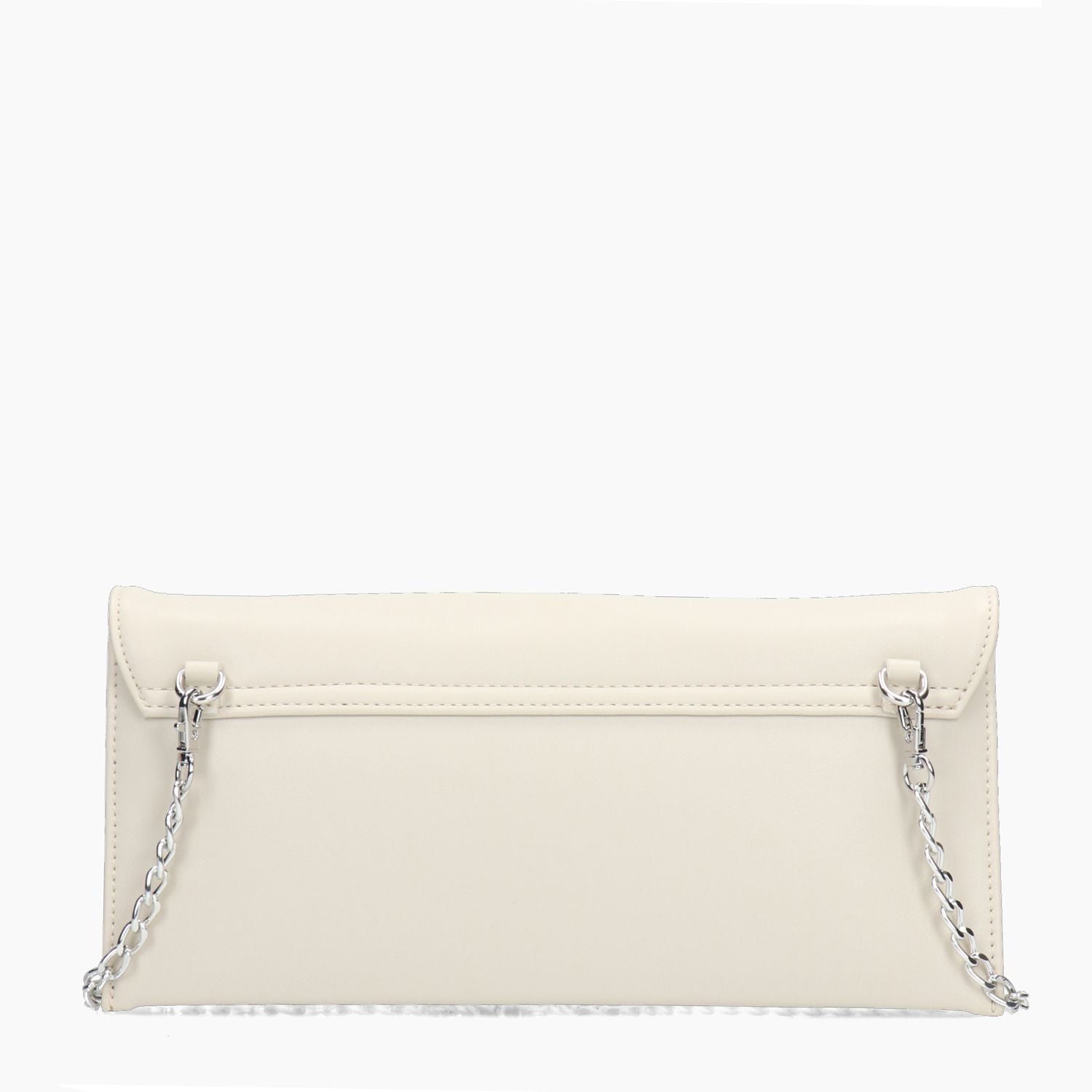 Handtasche aus elfenbeinfarbenem Kunstleder. Stoffgefüttertes Innenfach mit zwei Fächern, eines davon mit Reißverschluss. Silbernes Logo auf der Klappe. Abnehmbare silberne Kette mit Karabinerverschluss zur Befestigung an den äußeren Ösen. Magnetverschluss. Höhe 14 cm, Breite 29 cm, Tiefe 3 cm. Aus der Damenkollektion von Nero Giardini.