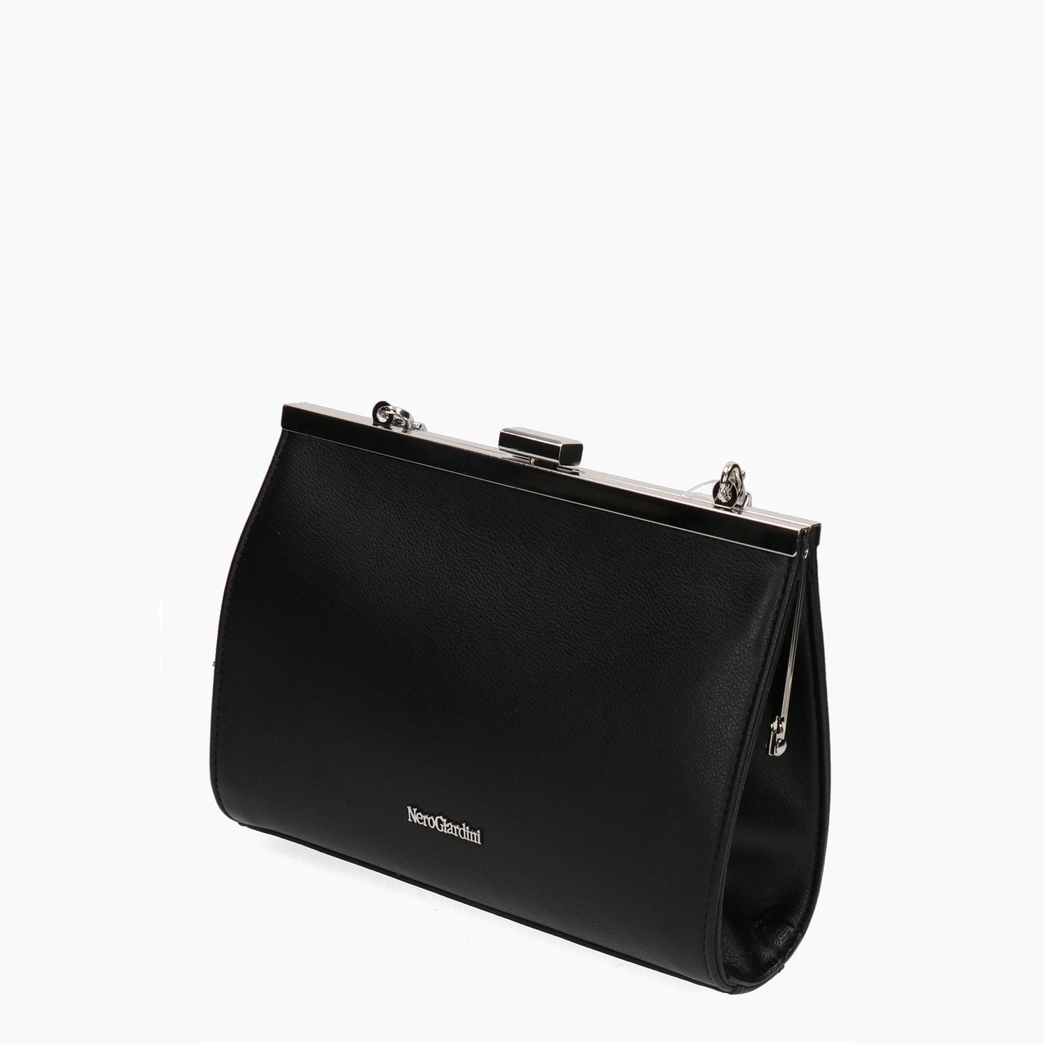Schwarze Clutch aus Kunstleder. Stoffgefüttertes Innenfach mit Reißverschlusstasche. Silbernes Logo. Innenliegende silberne Kette zum Tragen über der Schulter. Druckknopfverschluss. Höhe 16 cm, Breite 21 cm, Tiefe 6 cm. Aus der Damenkollektion Nero Giardini.