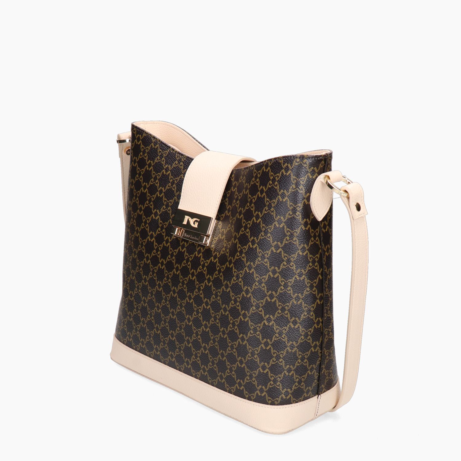 Braune Schultertasche aus Kunstleder mit zwei Henkeln. Stoffgefüttertes Innenfach mit zwei Taschen, eine davon mit Reißverschluss. Reißverschluss außen. Logo-Riemen mit Druckknopfverschluss. Außentasche mit Reißverschluss. Höhe 29 cm, Breite 28 cm, Tiefe 11 cm. Damenkollektion Nero Giardini.