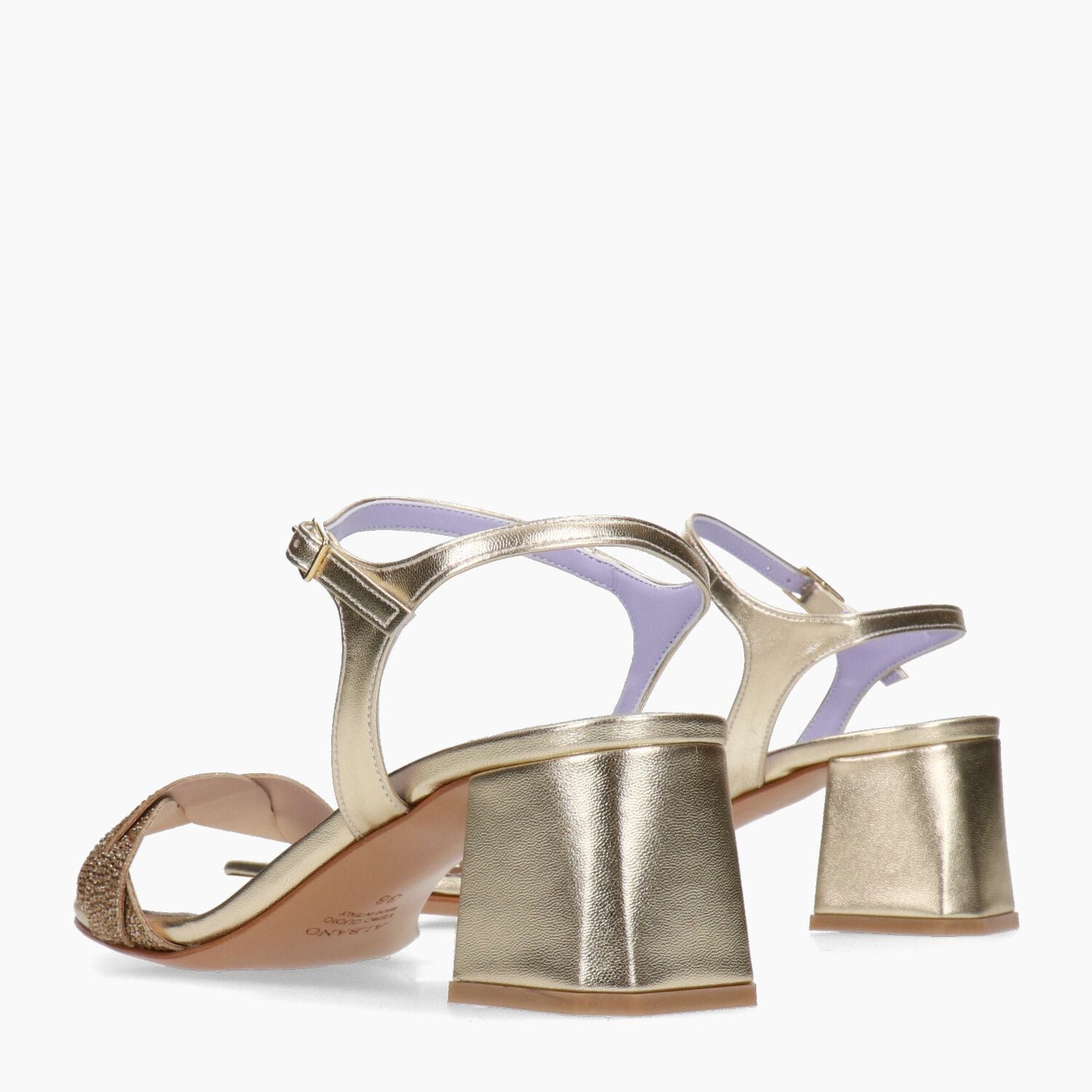 Albano Sandale mit goldfarbenem Obermaterial und Ton-in-Ton-Strasssteinen. Quadratische Zehenpartie. Riemenverschluss. Ledersohle. 6,5 cm Absatz. Ein Staubbeutel ist im Lieferumfang enthalten. Albano Damen-Frühjahr/Sommer-Kollektion.