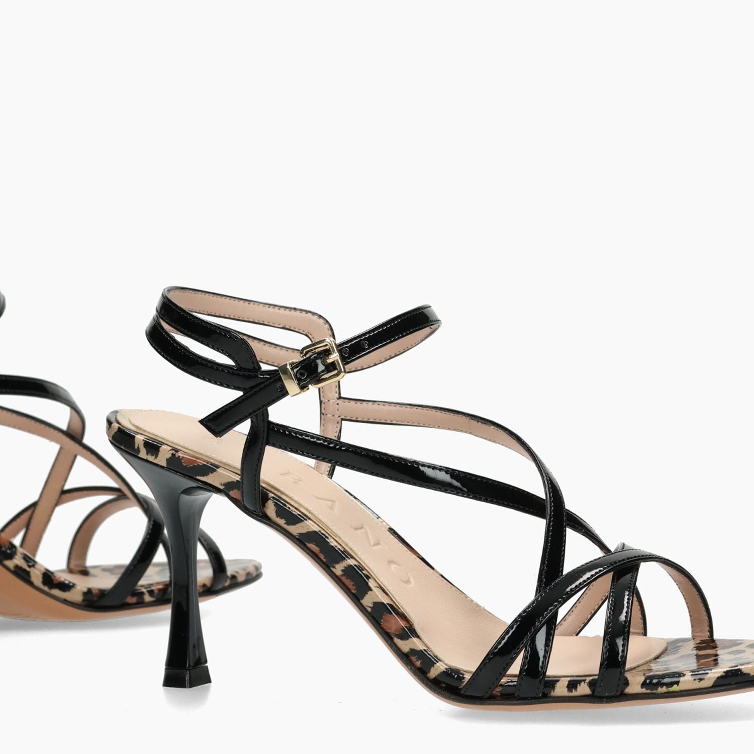 Schwarze Sandale aus Lacklederimitat. Verstellbarer Riemenverschluss. Gepunktetes Kunstlederfutter mit Lederinnensohle. Ledersohle mit 7 cm Absatz. Albano Damen-Frühjahr/Sommer-Kollektion.