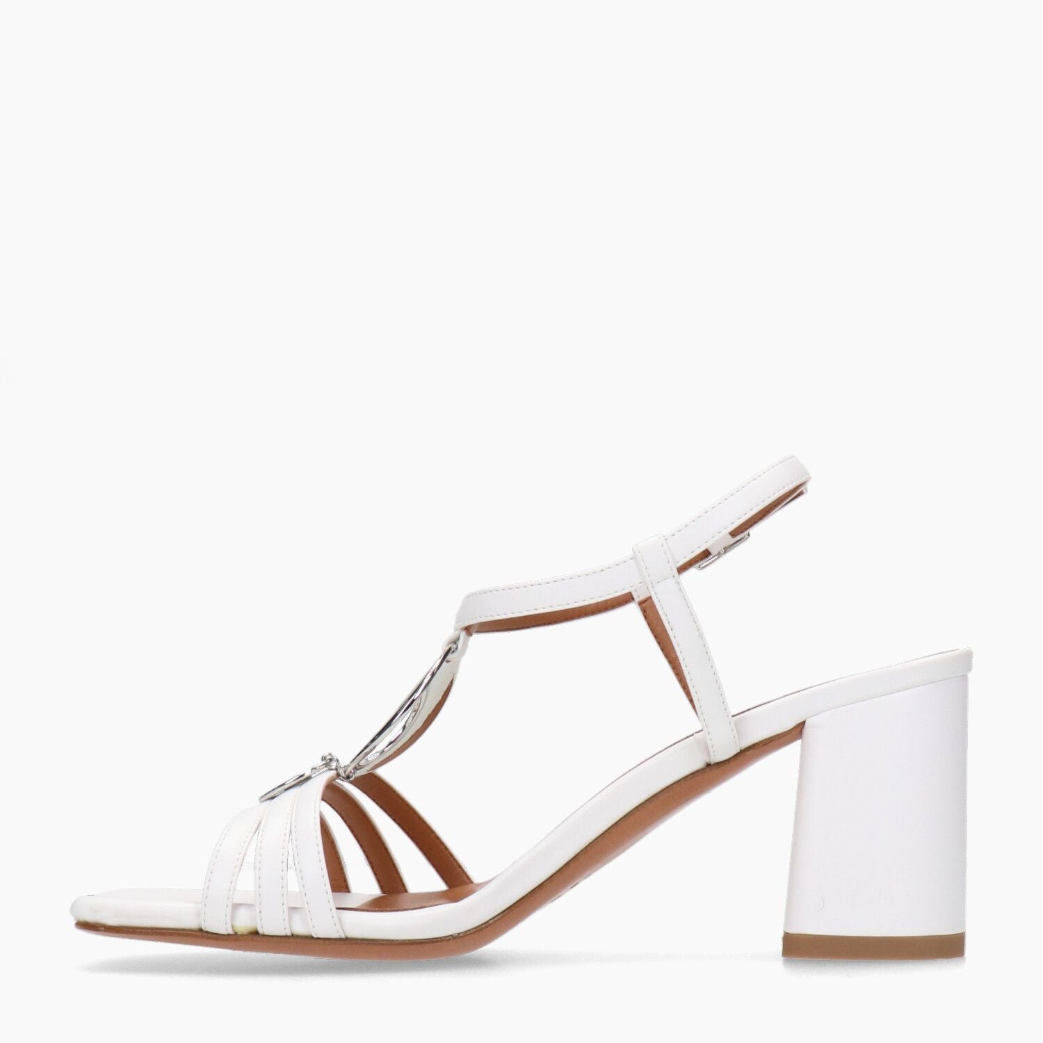 Weiße Ledersandalen mit silbernem Accessoire, Ledersohle.