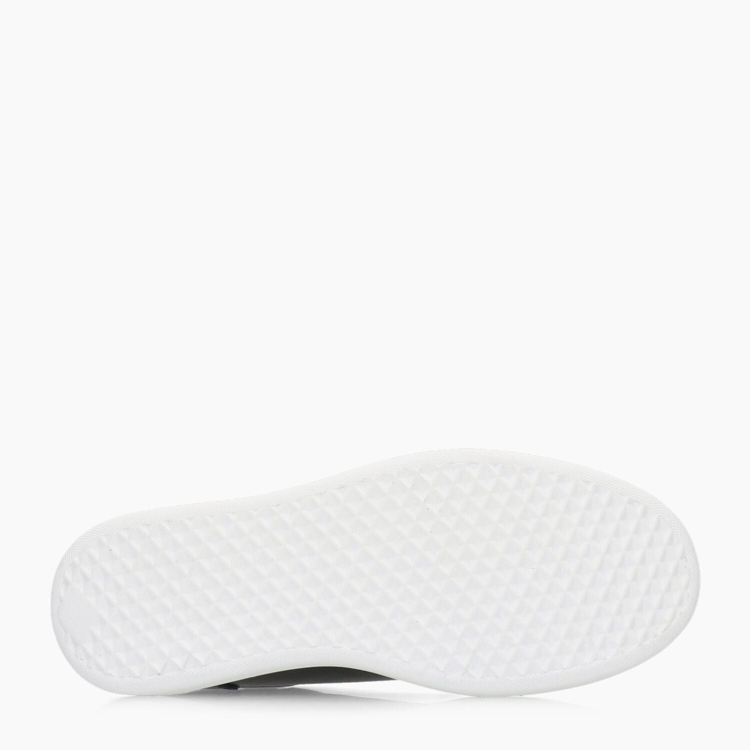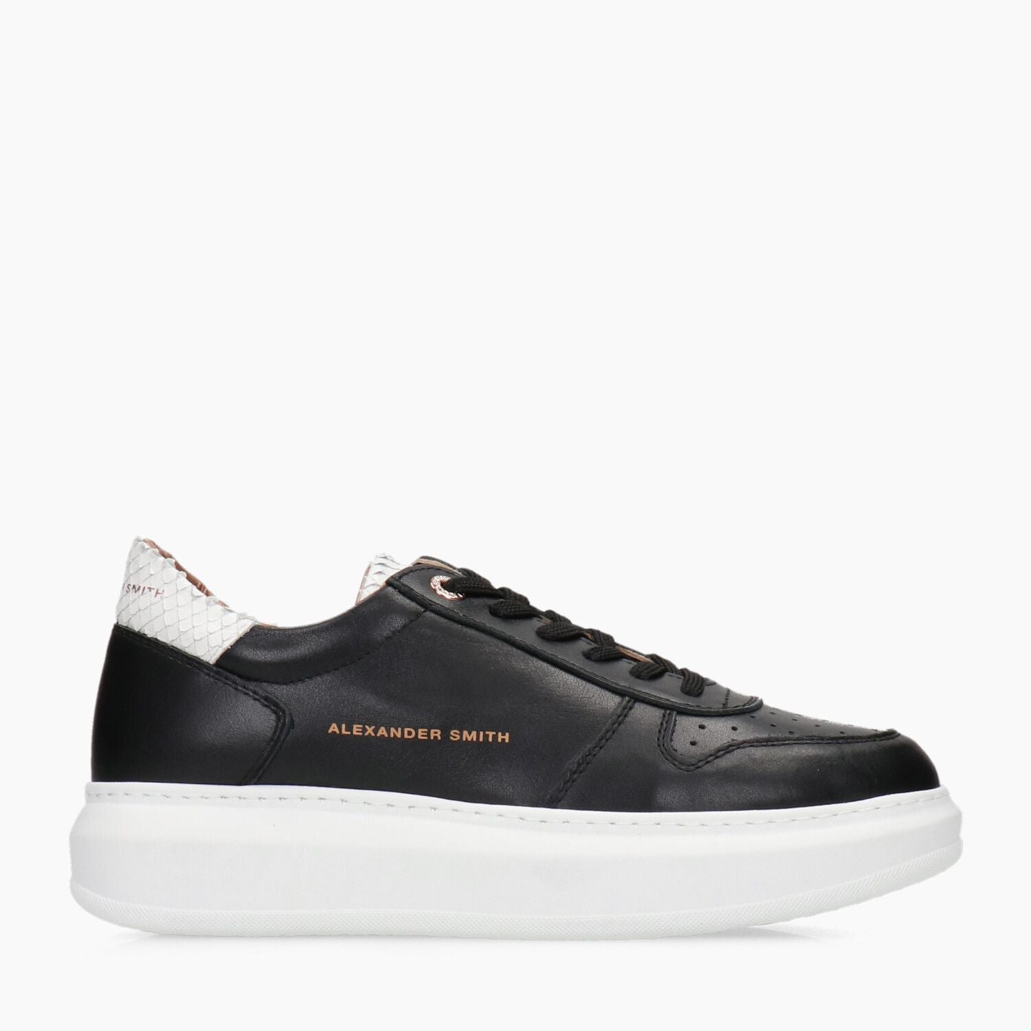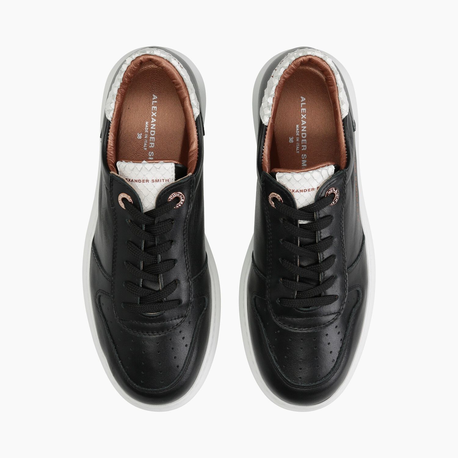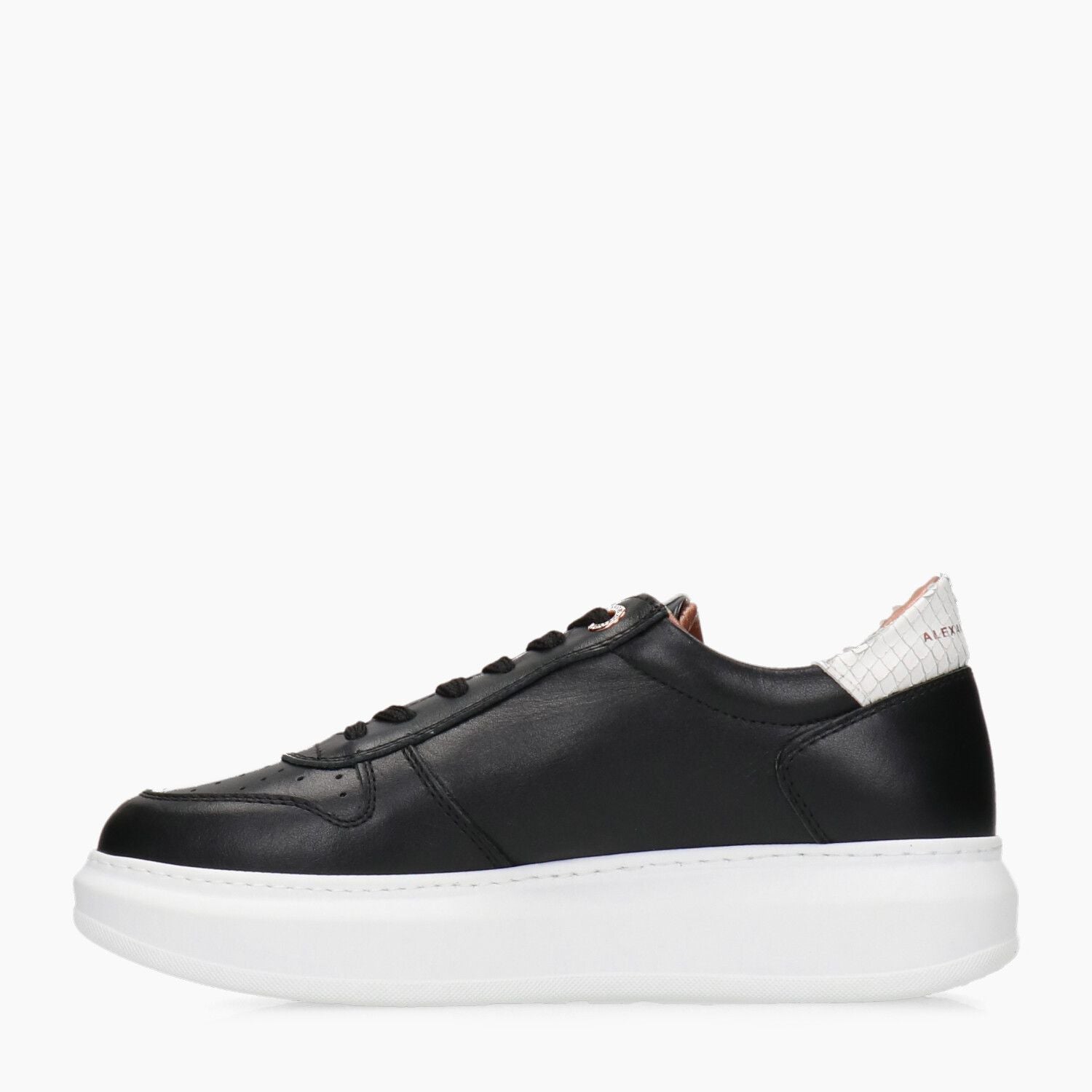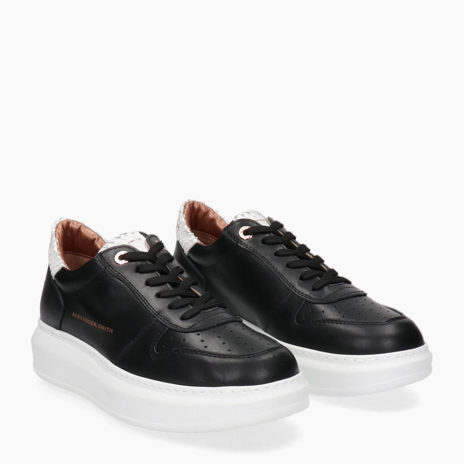 Schwarze Ledersneaker mit perforiertem Vorderblatt, weißer Ferse aus Leder mit Reptilienmuster und Gummisohle.