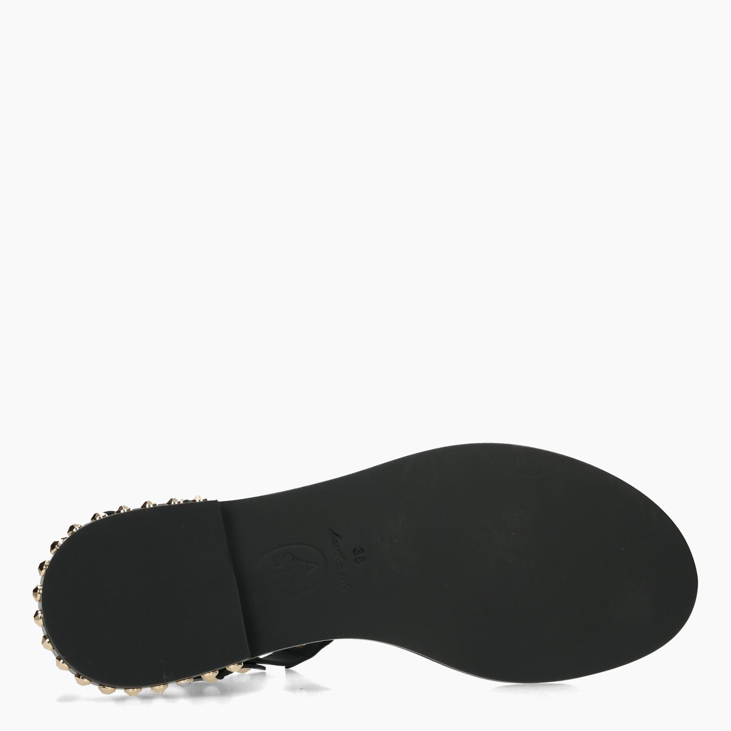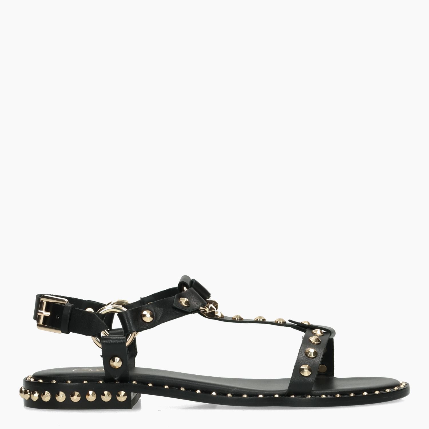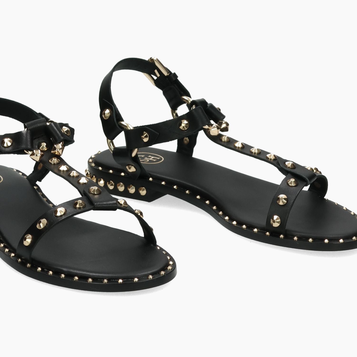 Sandalen von Ash mit schwarzem Leder-Obermaterial und goldenen Nieten. Schnallenverschluss hinten. Lederfutter mit gepolsterter Innensohle. Ledersohle mit 2 cm Absatz. Aus der Damen-Frühjahr/Sommer-Kollektion von Ash.