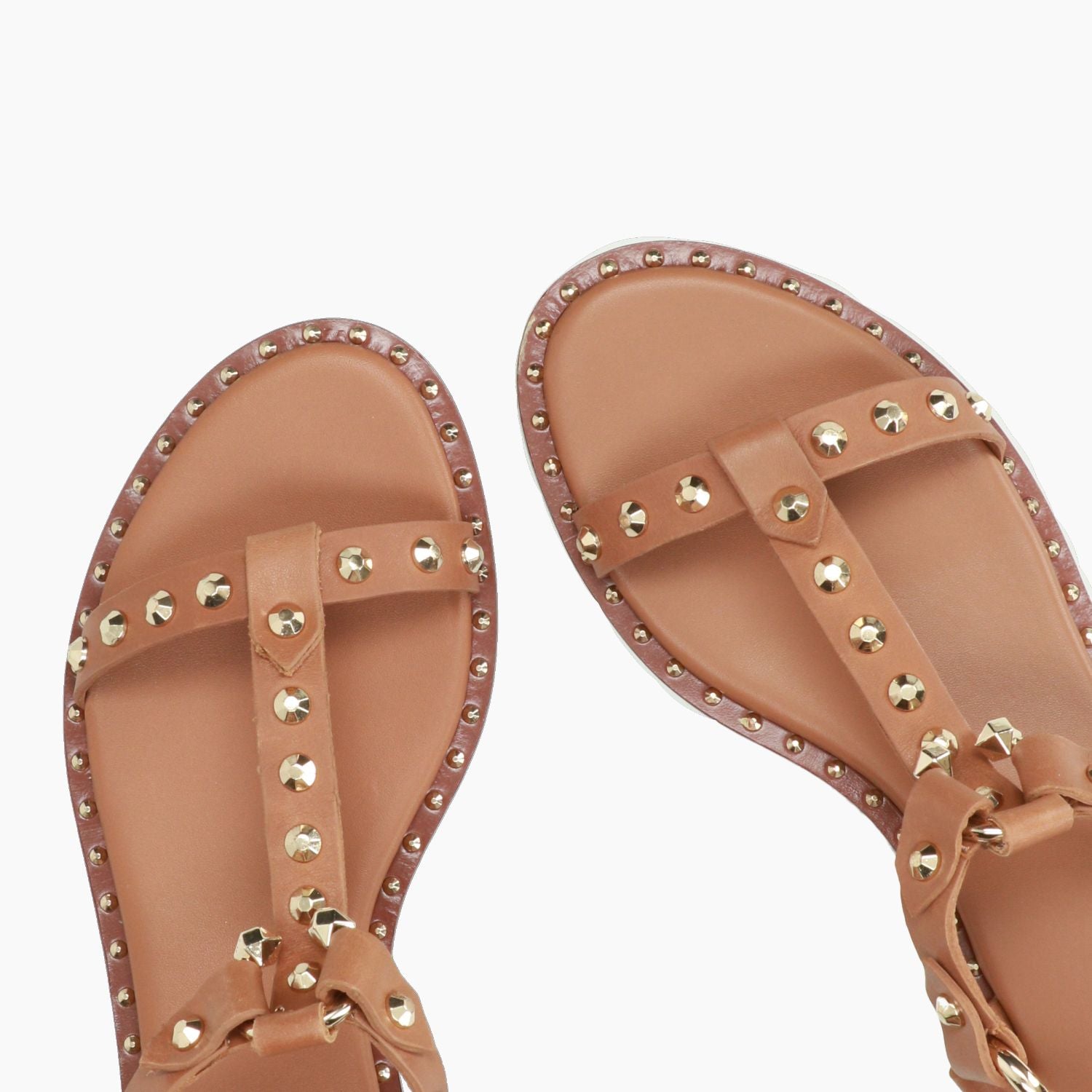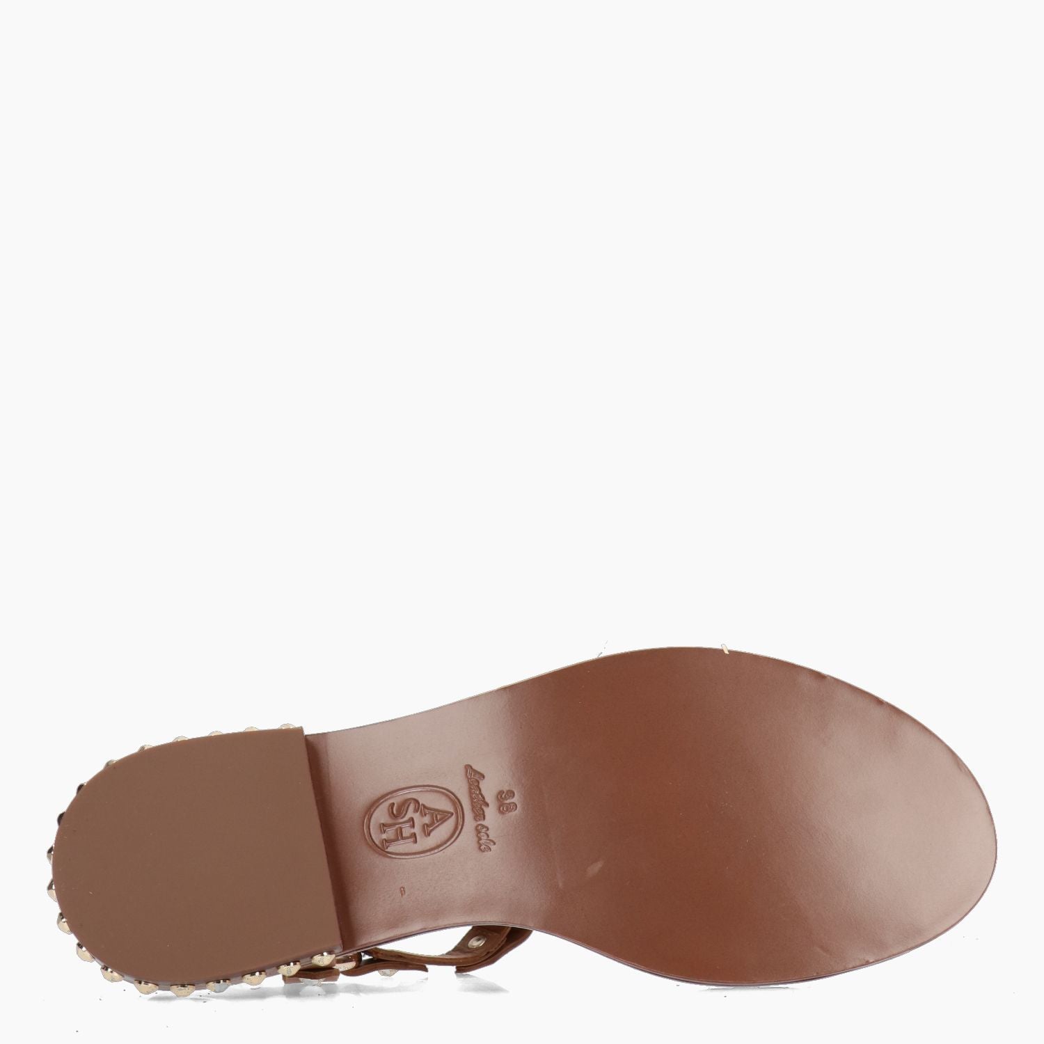 Sandalen von Ash mit hellbraunem Leder-Obermaterial und goldenen Nieten. Schnallenverschluss hinten. Lederfutter mit gepolsterter Innensohle. Ledersohle mit 2 cm Absatz. Aus der Damen-Frühjahr/Sommer-Kollektion von Ash.