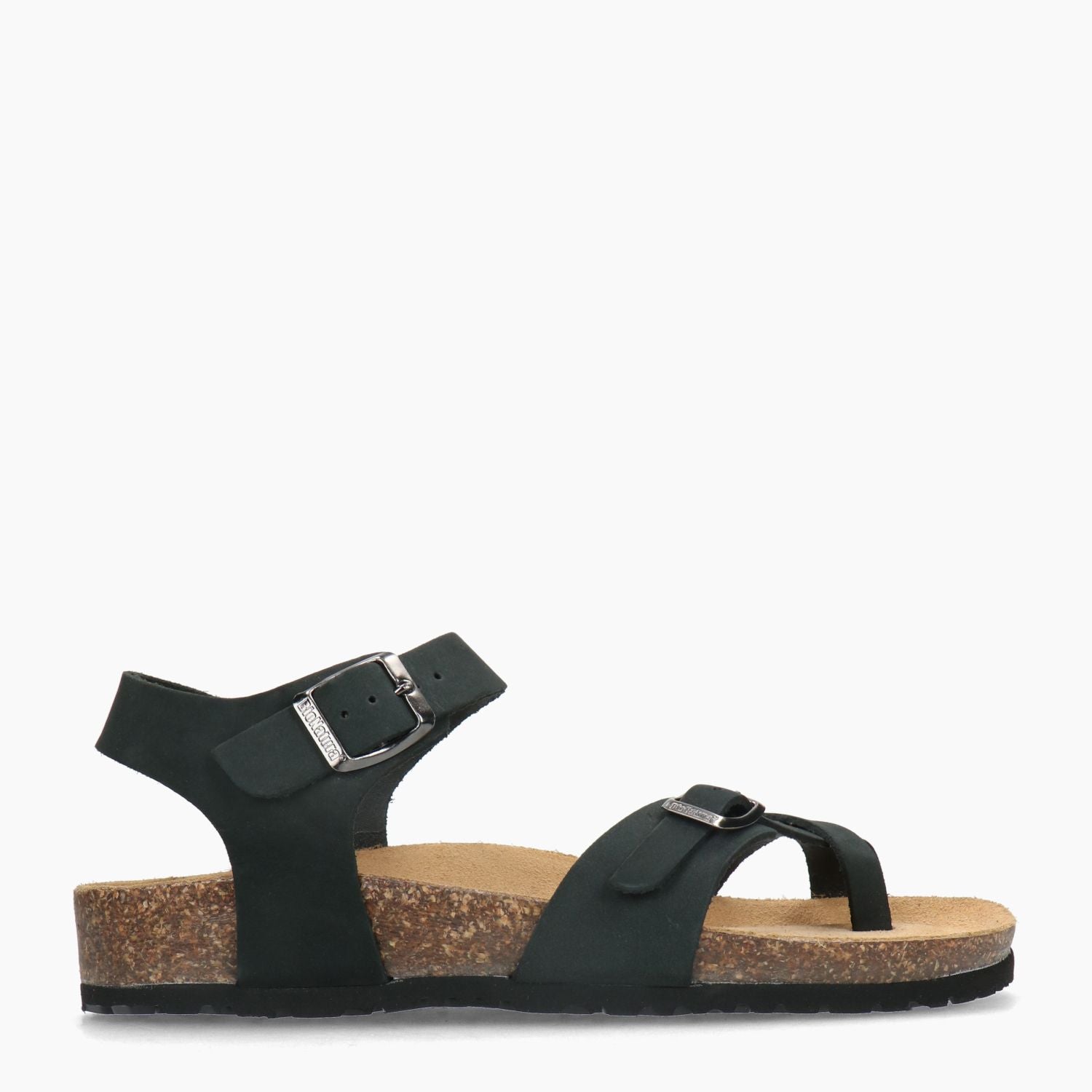 Bionatura Flip-Flop mit schwarzem Nubukleder-Obermaterial. Verstellbarer Schnallenverschluss. Lederfutter mit gepolsterter Innensohle. Gummisohle mit 2 cm hohem Keilabsatz. Bionatura Damen-Frühjahr/Sommer-Kollektion.