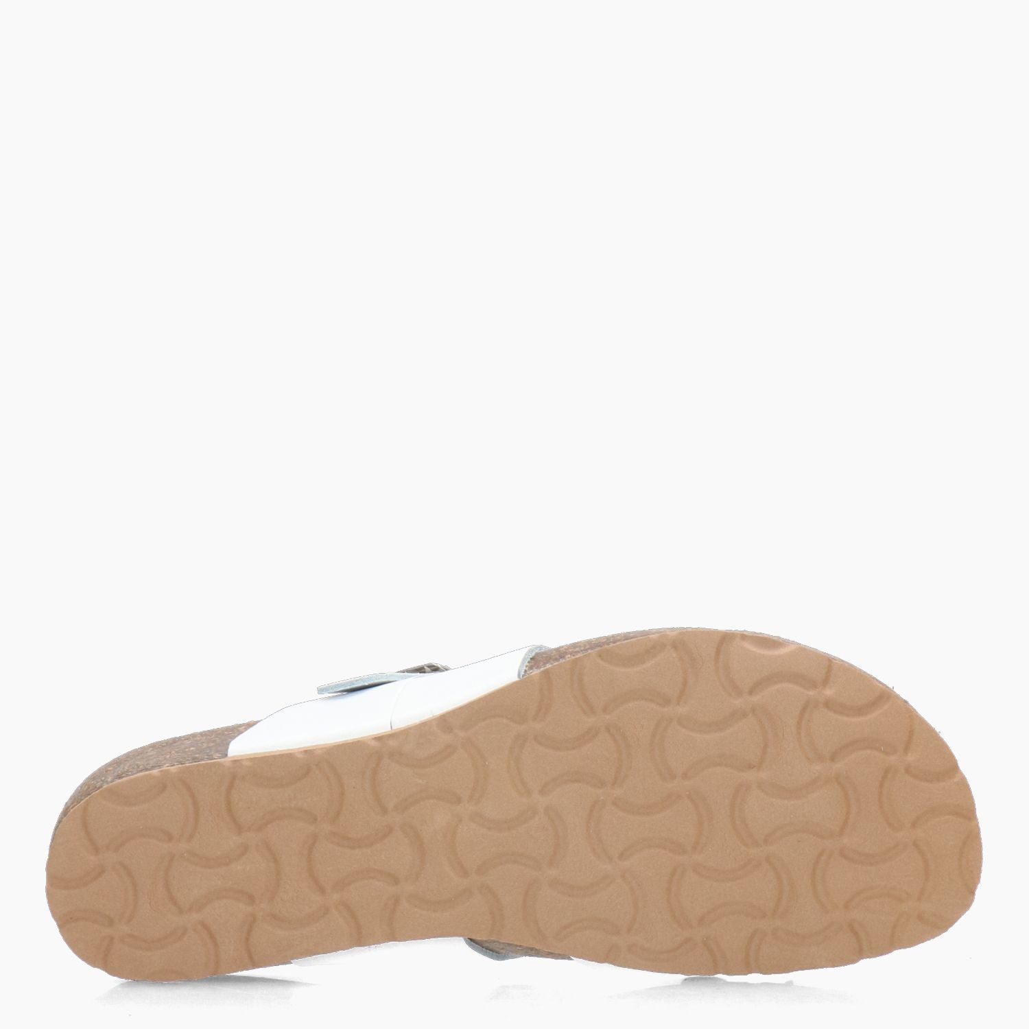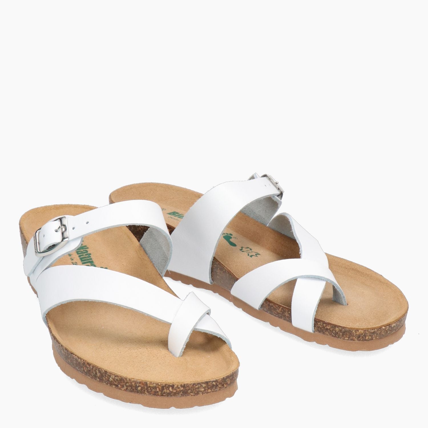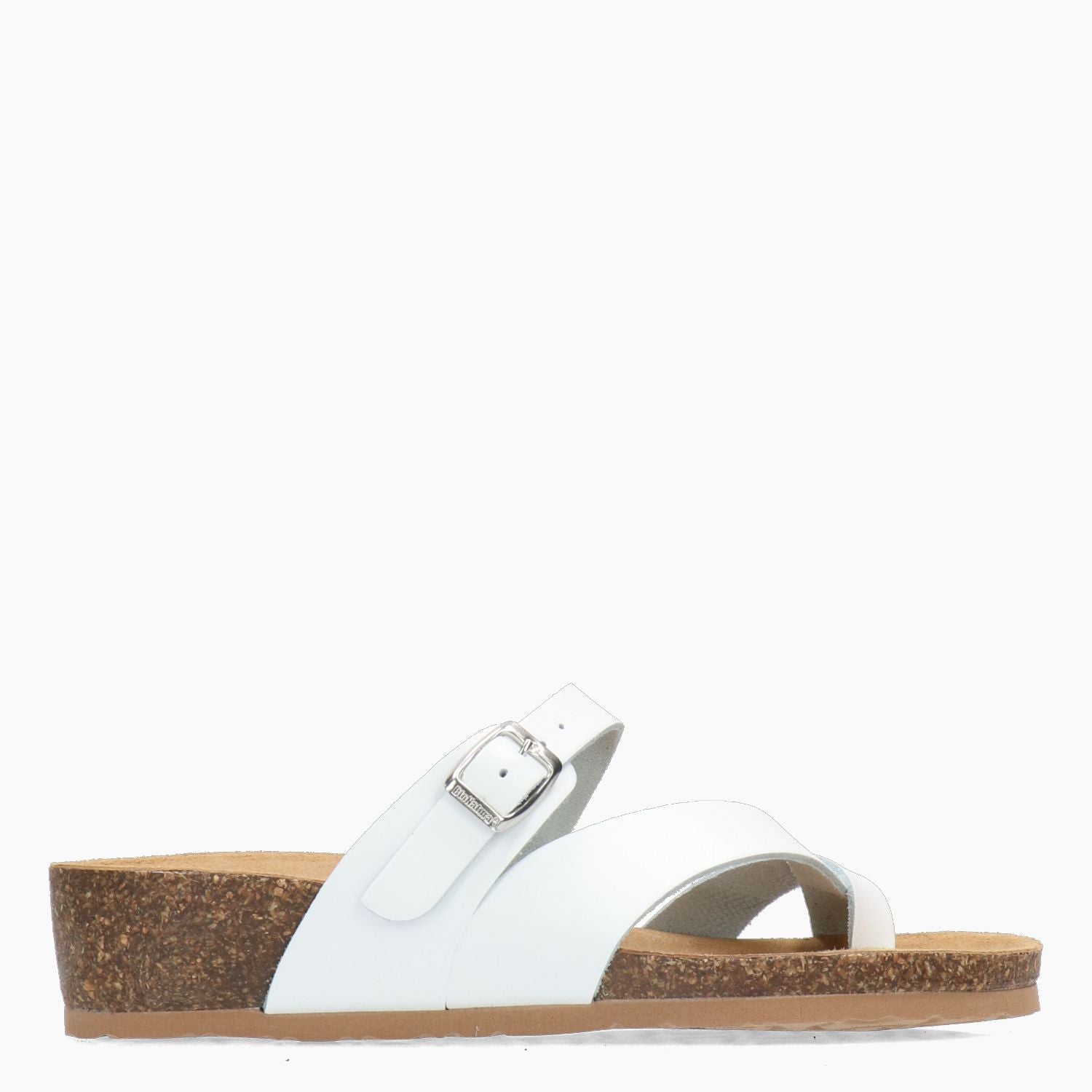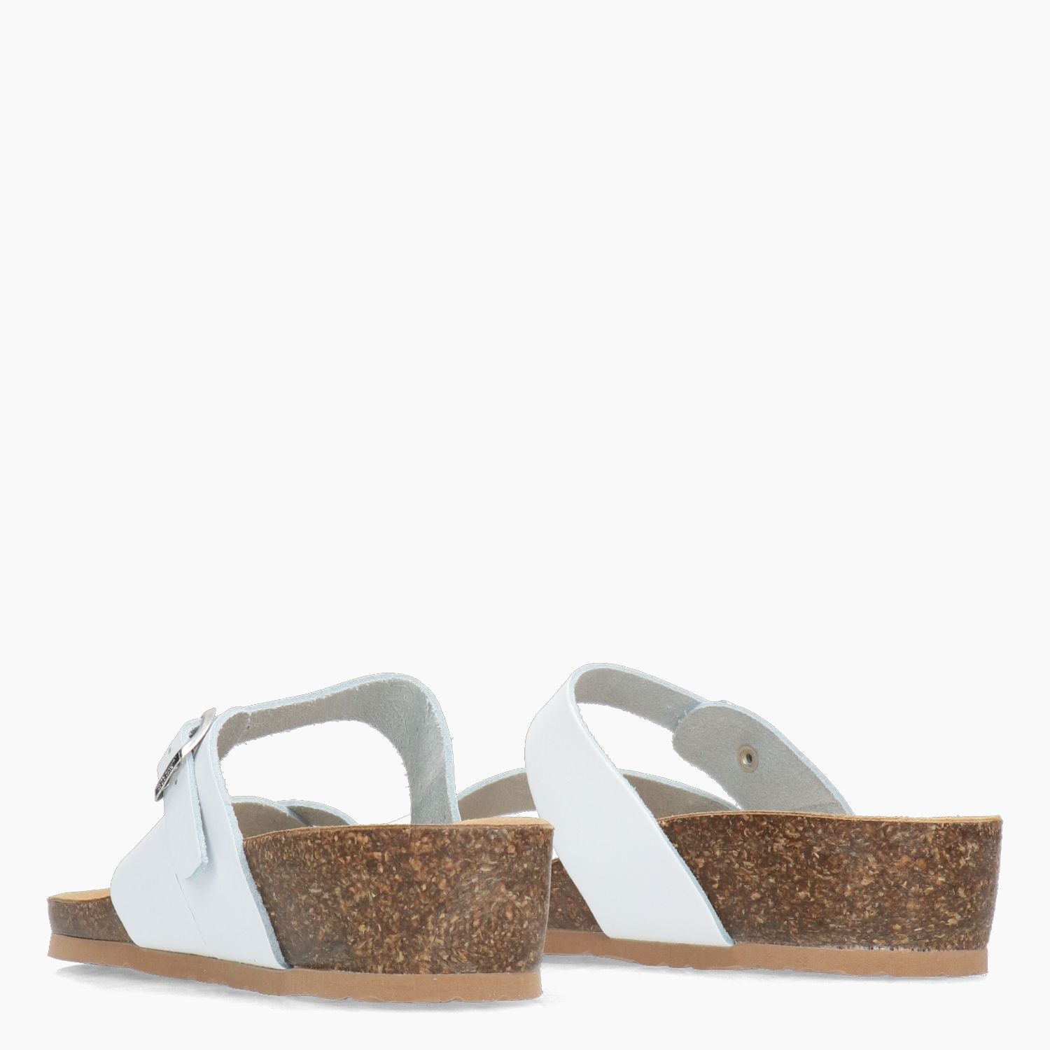 Bionatura-Slipper mit weißem Leder-Obermaterial. Metallschnallenverschluss. Lederfutter mit gepolsterter Innensohle. Gummisohle mit 4 cm hohem Keilabsatz. Bionatura Damen-Frühjahr/Sommer-Kollektion.