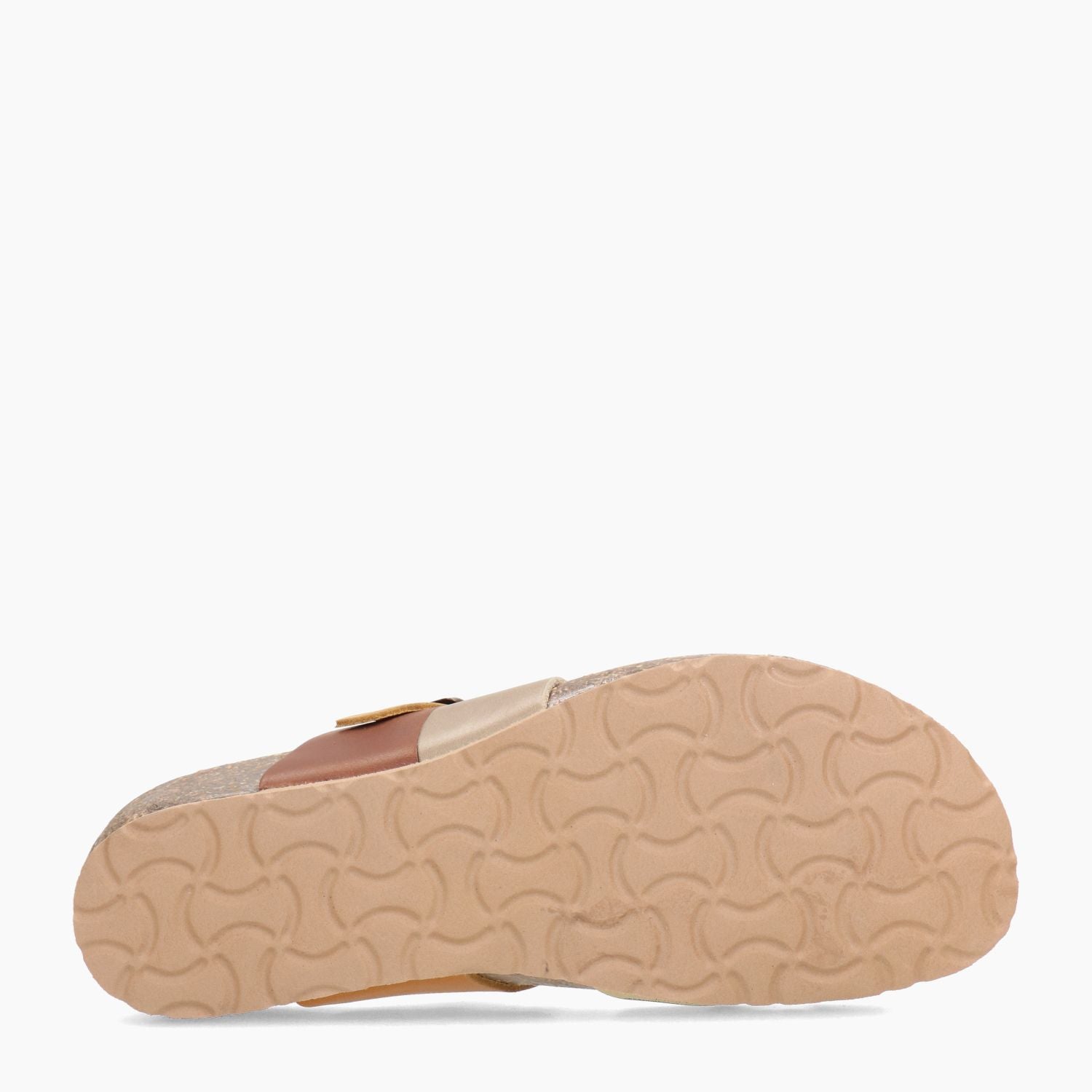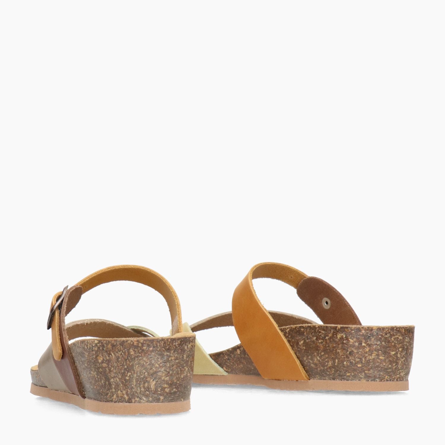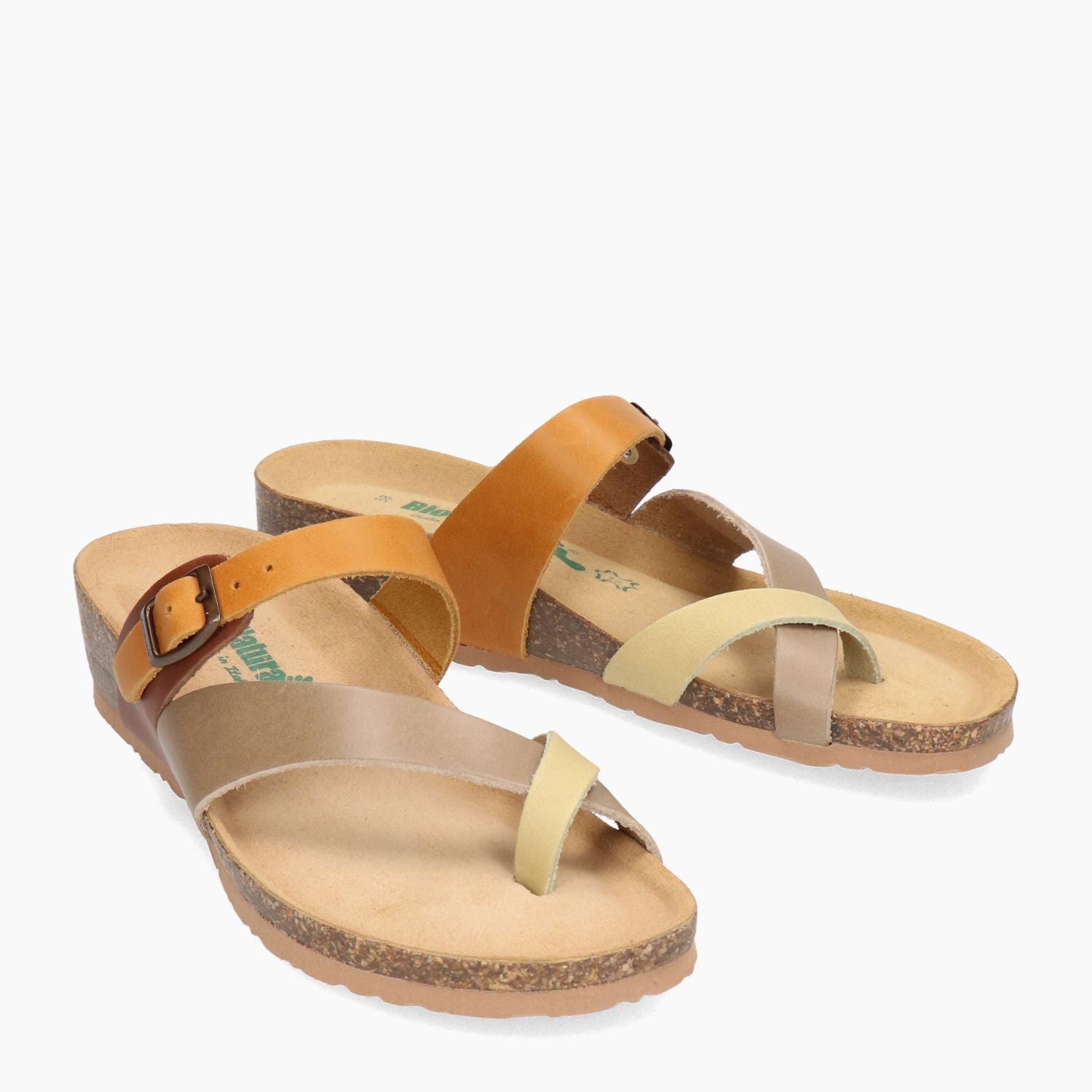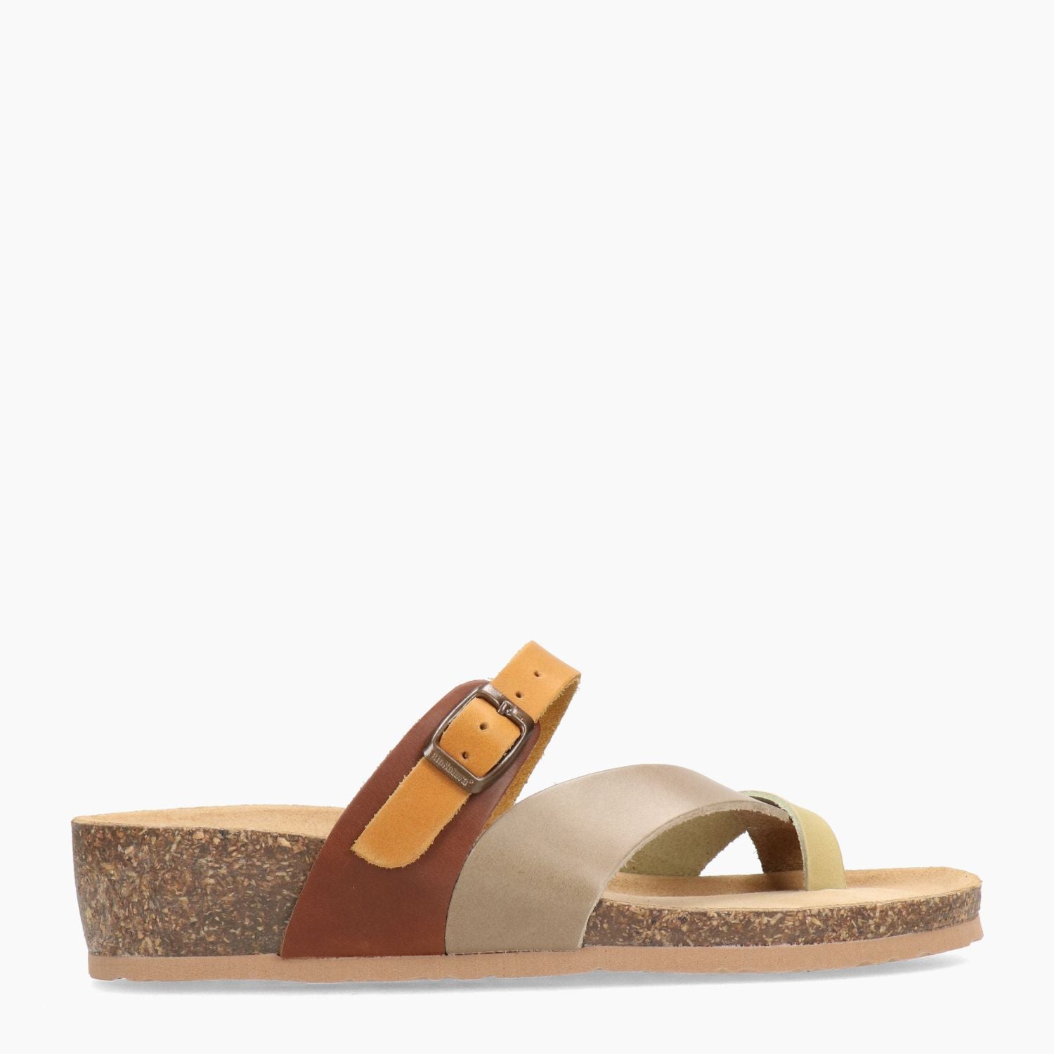 Bionatura Flip-Flop mit Obermaterial aus braunem, beigem und hellbraunem Leder. Riemen- und Schnallenverschluss. Lederfutter mit gepolsterter Innensohle. Gummisohle mit 3 cm hohem Keilabsatz. Bionatura Damen-Frühjahr/Sommer-Kollektion.