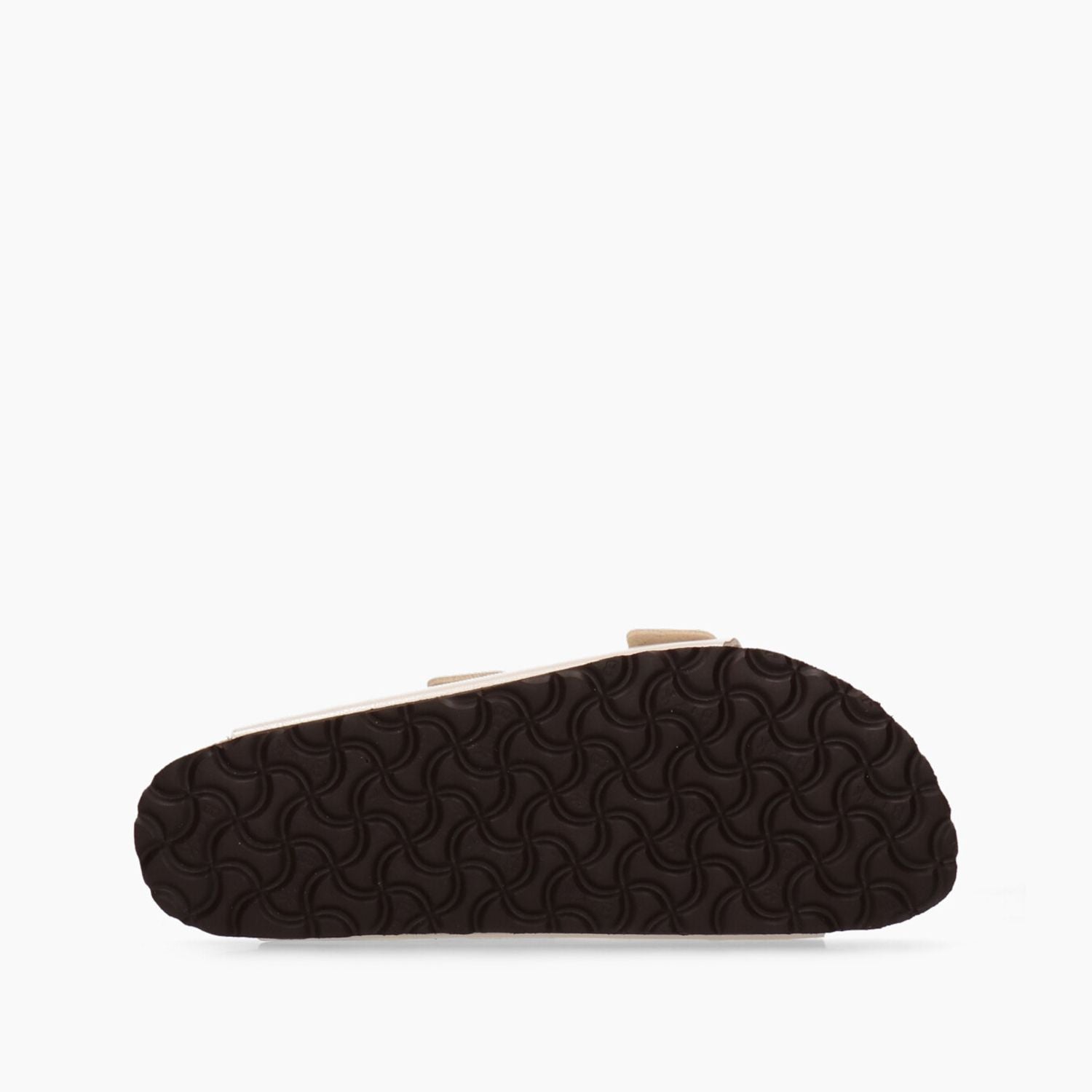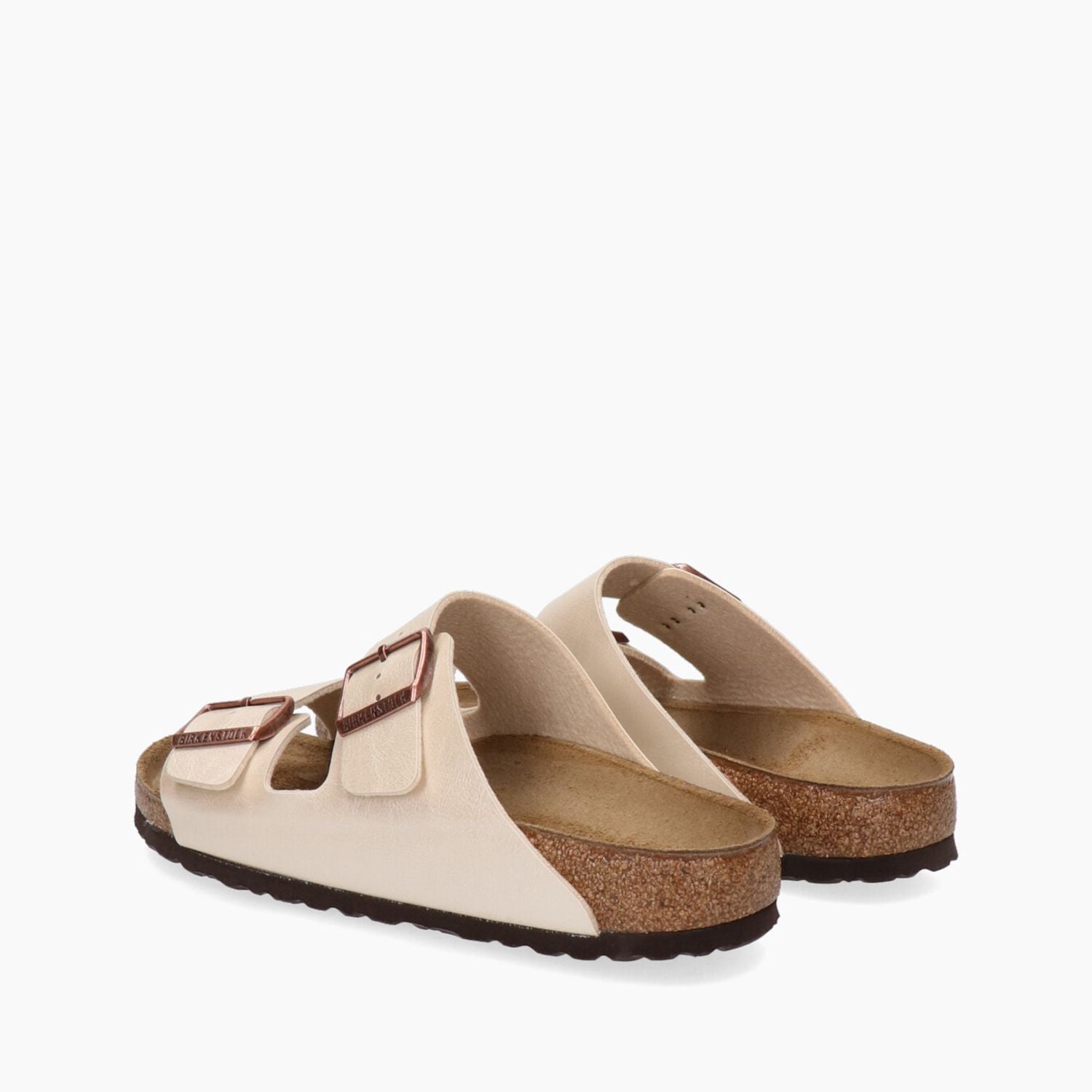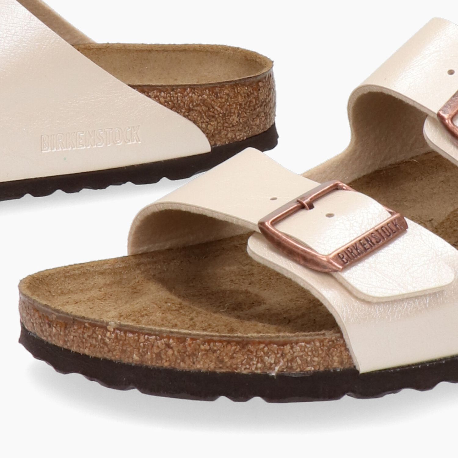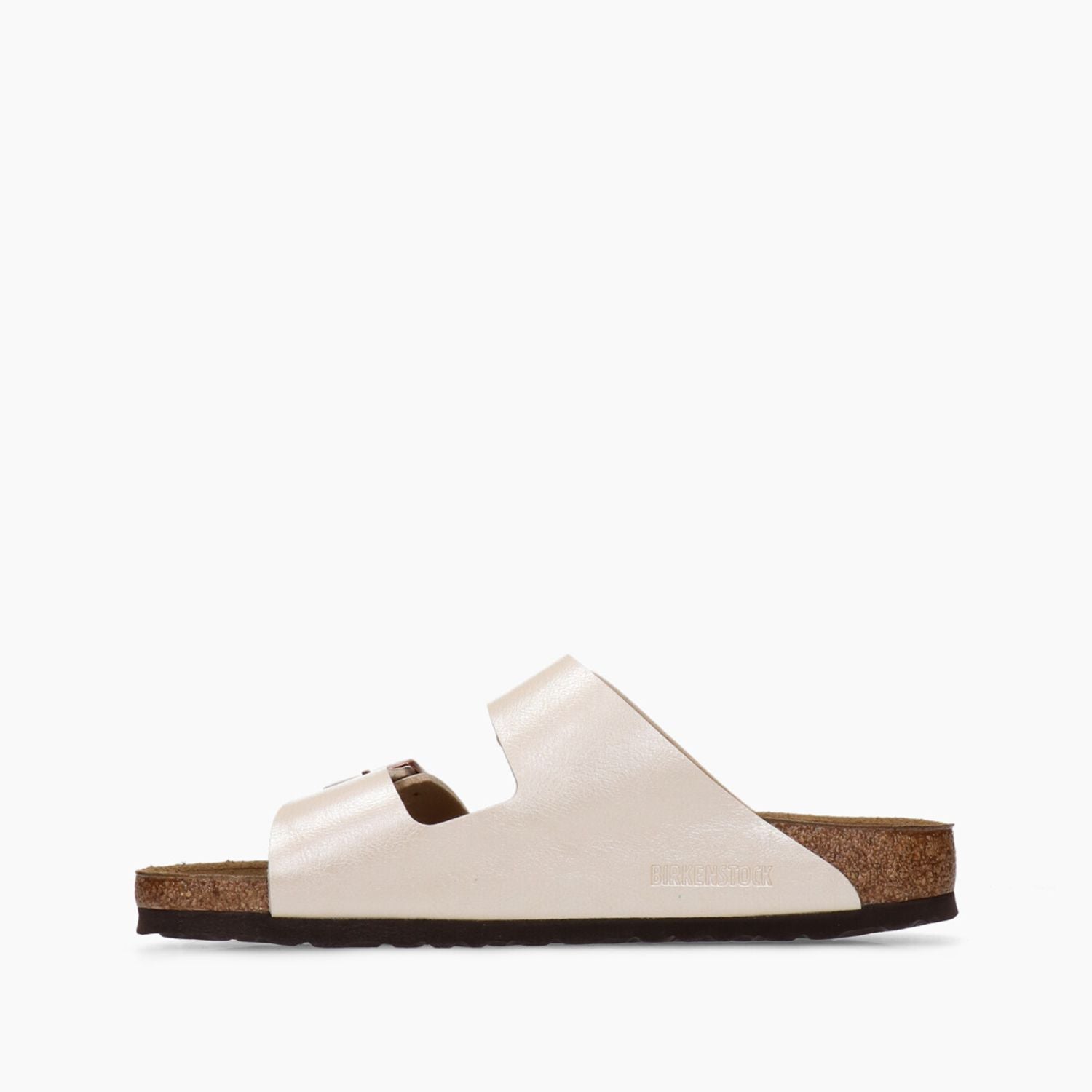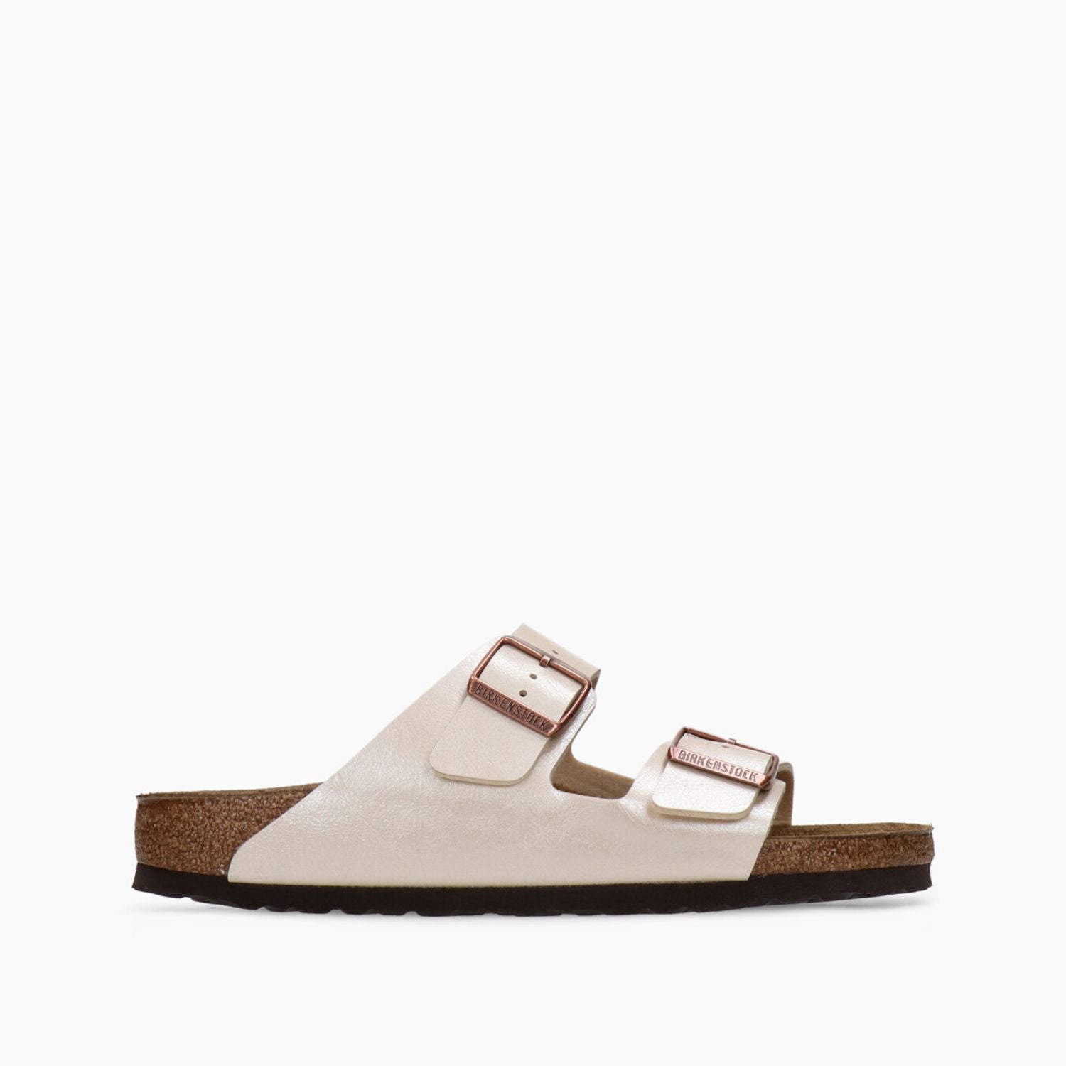 Arizona Hausschuh. Elegantes, perlmuttweißes Birko-Flor-Obermaterial. Verstellbare bronzefarbene Doppelschnalle mit Logo. Futter aus Leder und Textil. 2 cm hohe Gummisohle. Schmale Passform. Birkenstock Damenkollektion.
