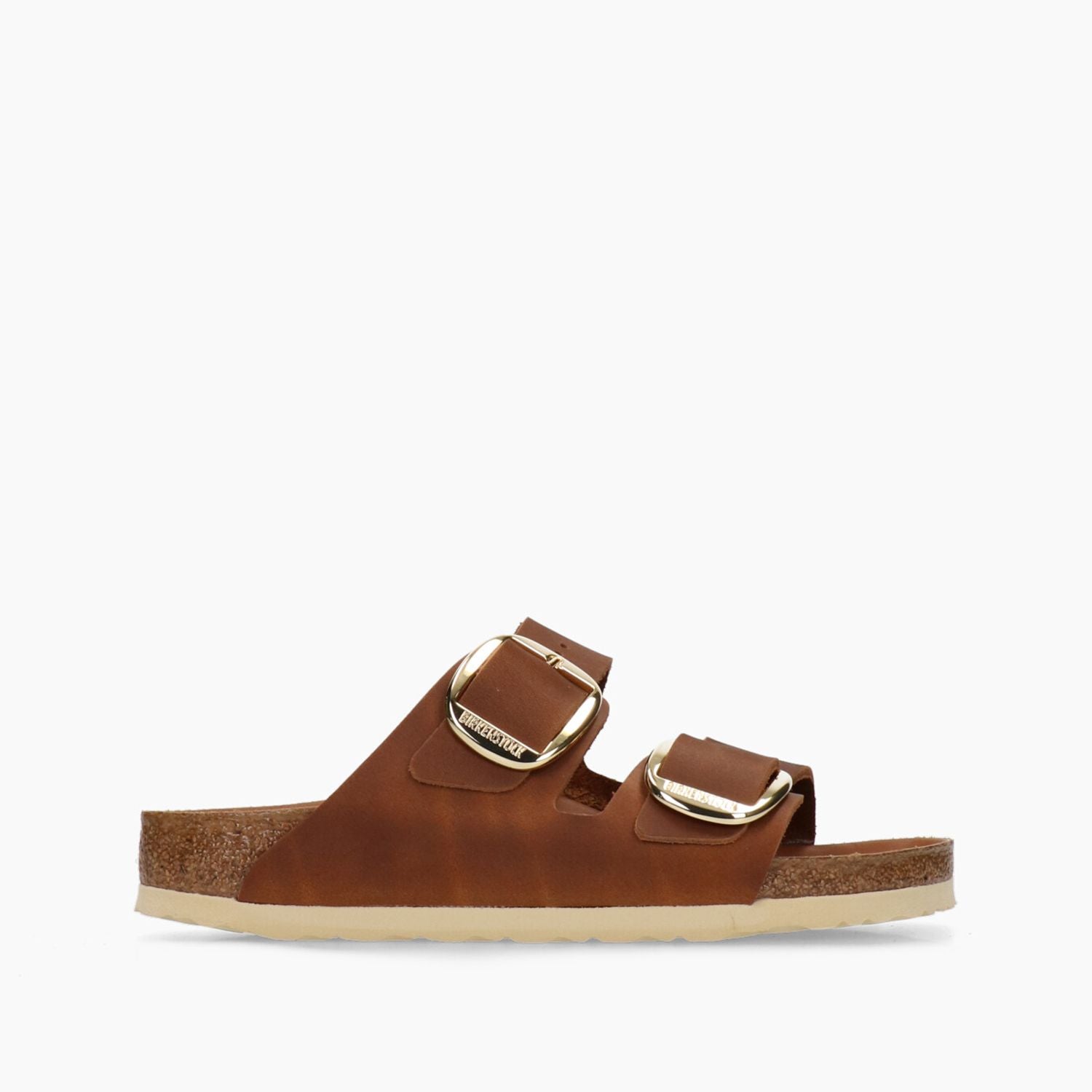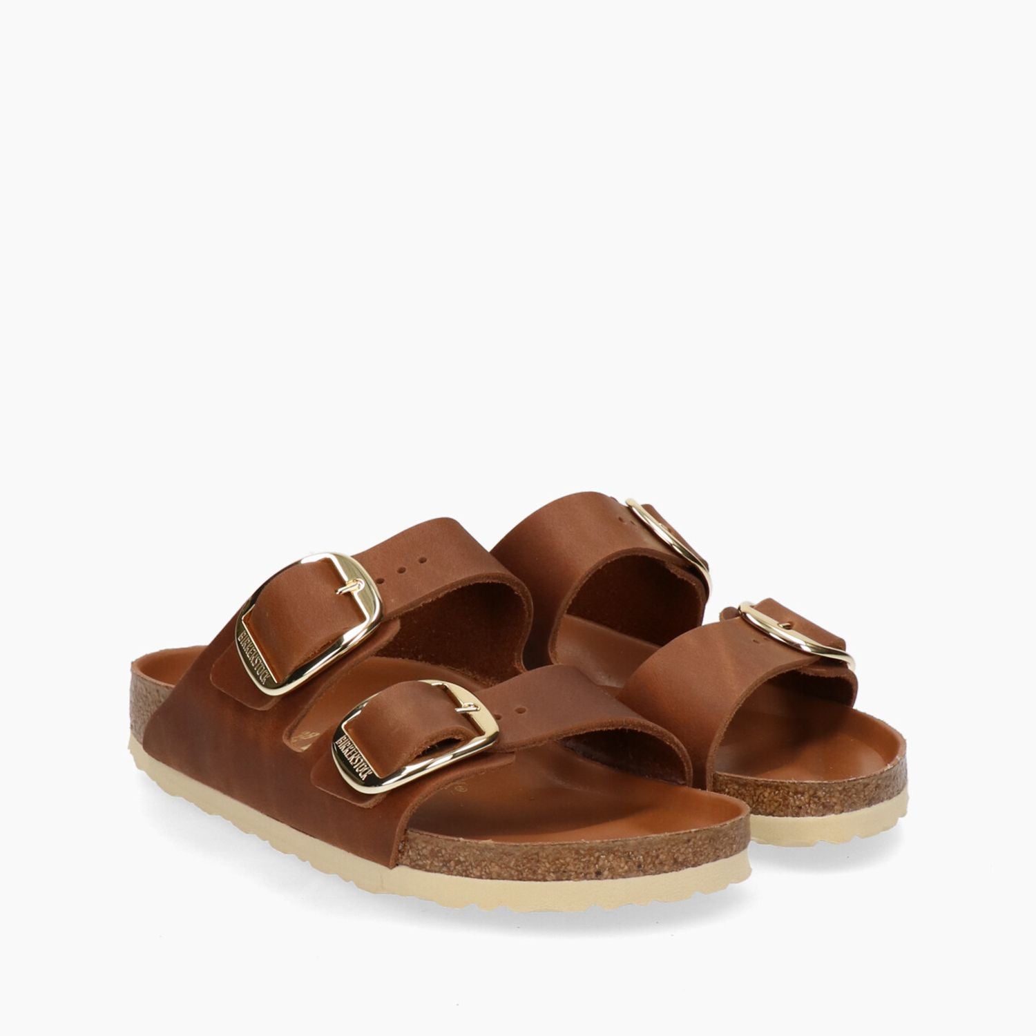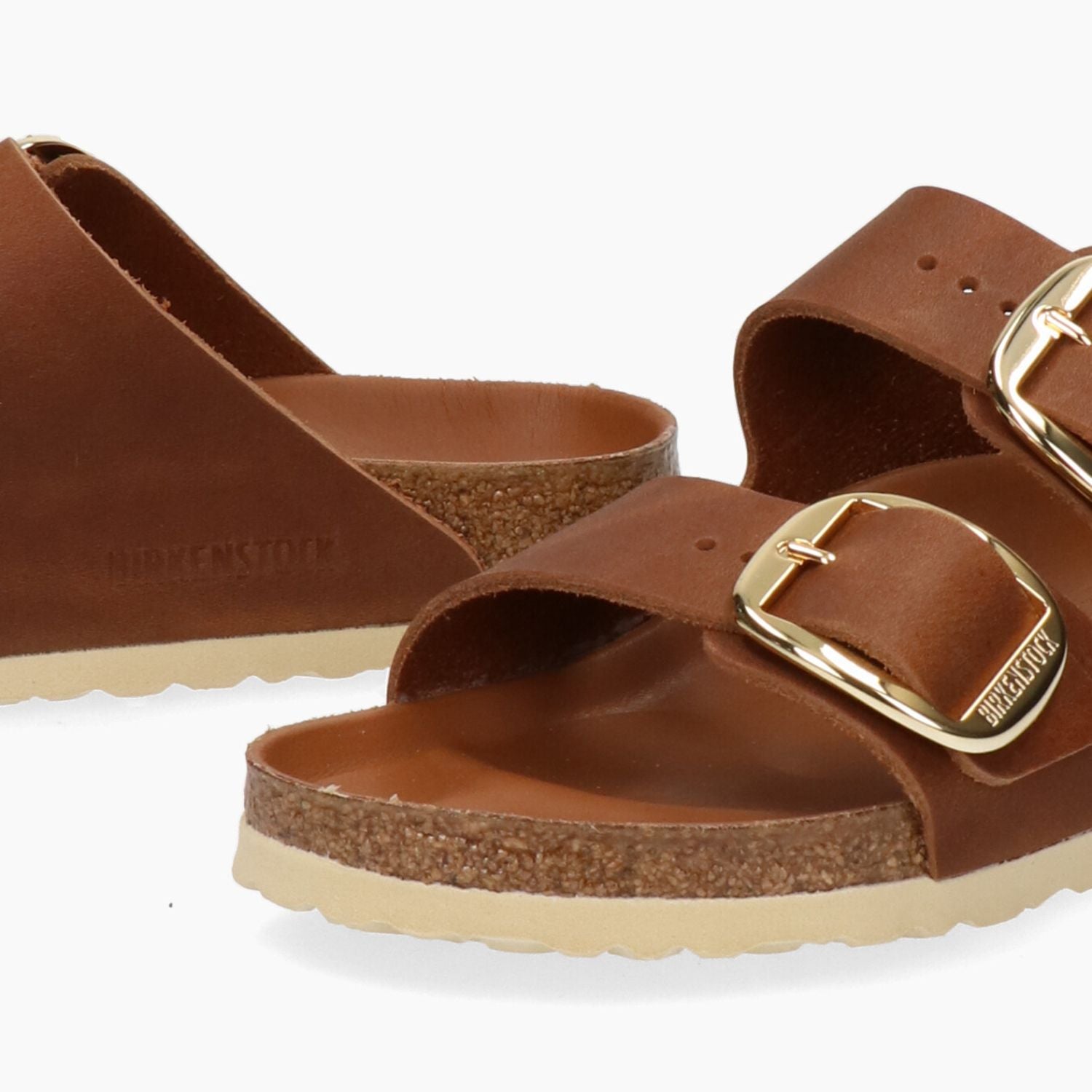 Arizona Big Buckle Lederpantoffeln. Cognacbraun. Runde Zehenpartie. Riemenverschluss mit Metallschnalle. Schmale Passform. Lederfutter. Gummisohle. Birkenstock Damenkollektion.