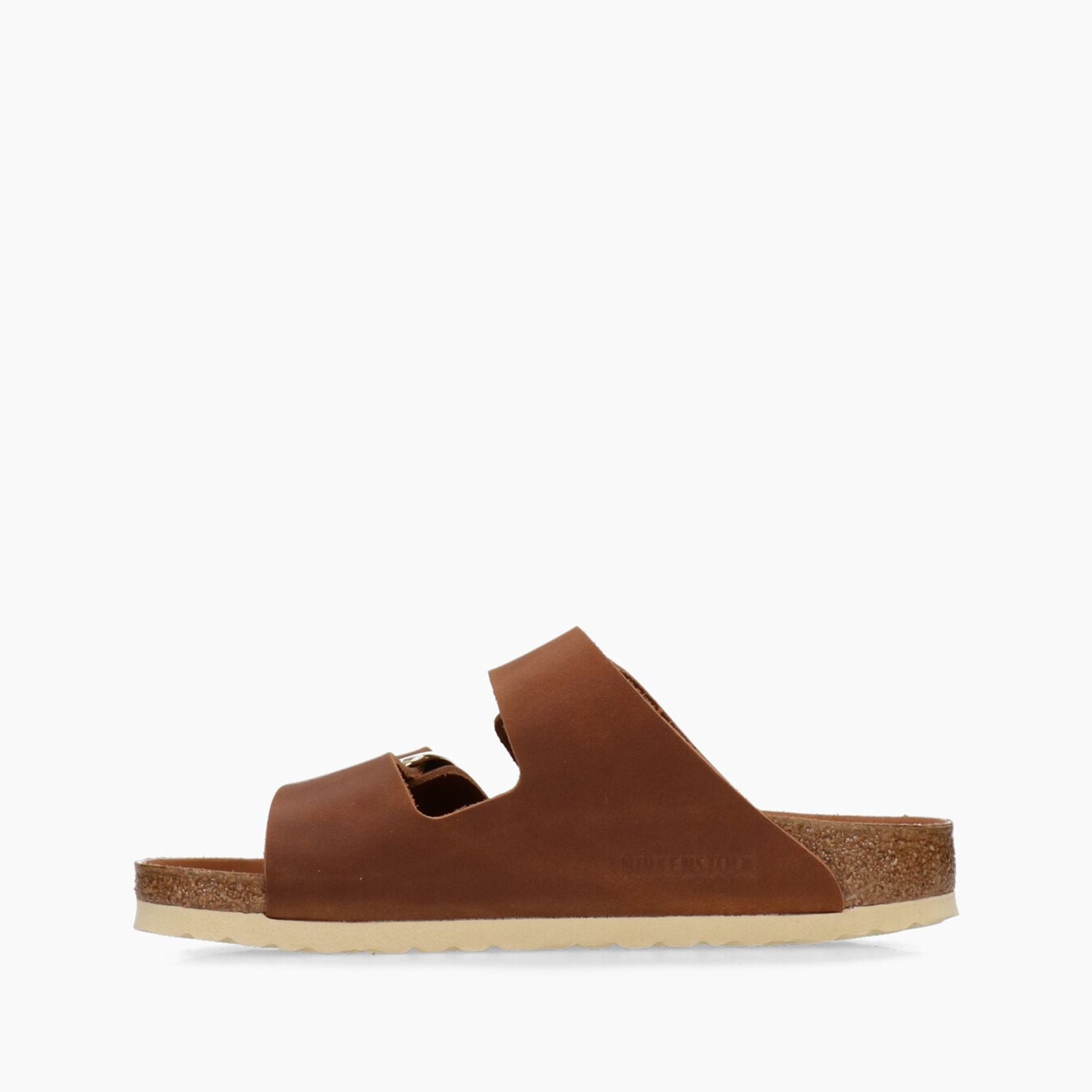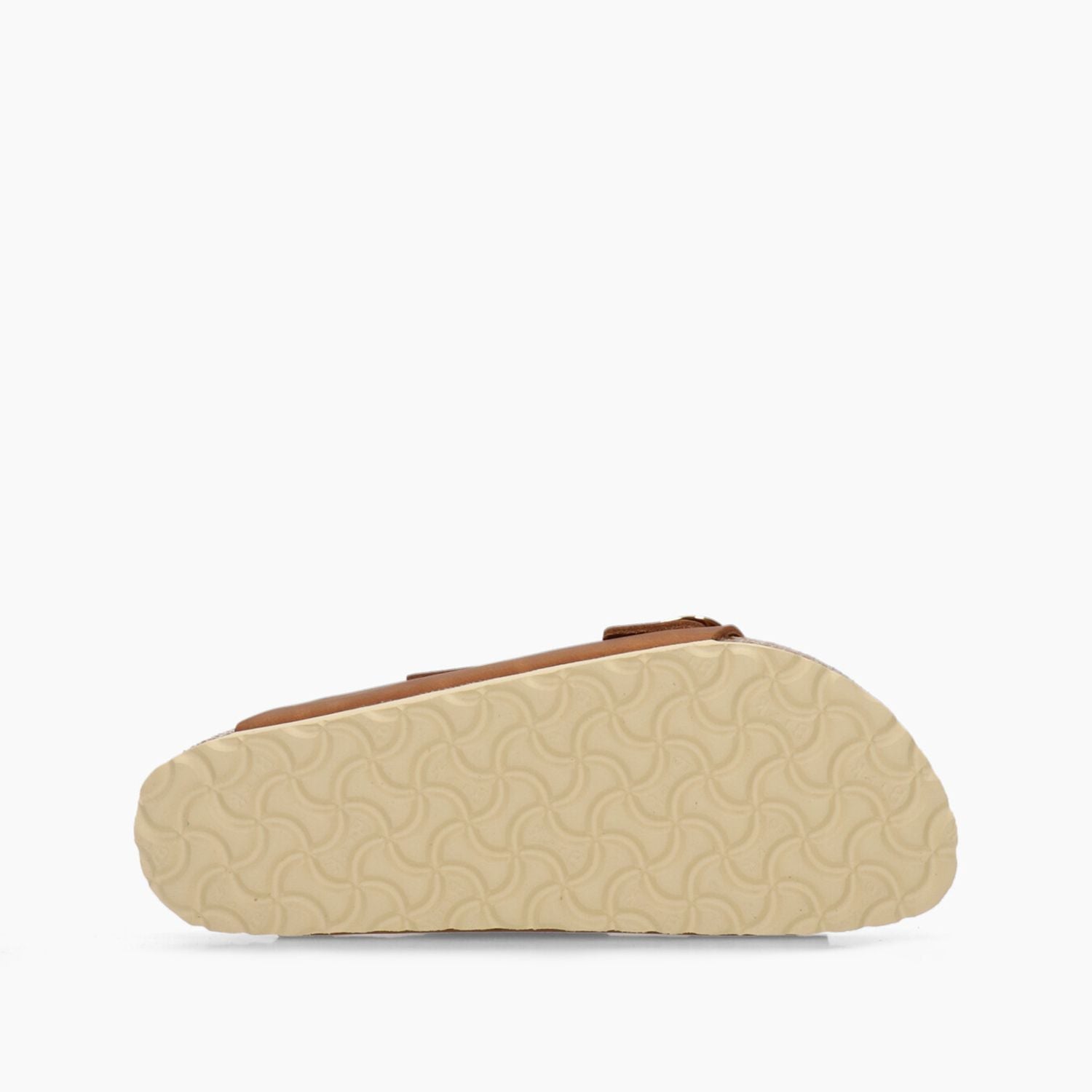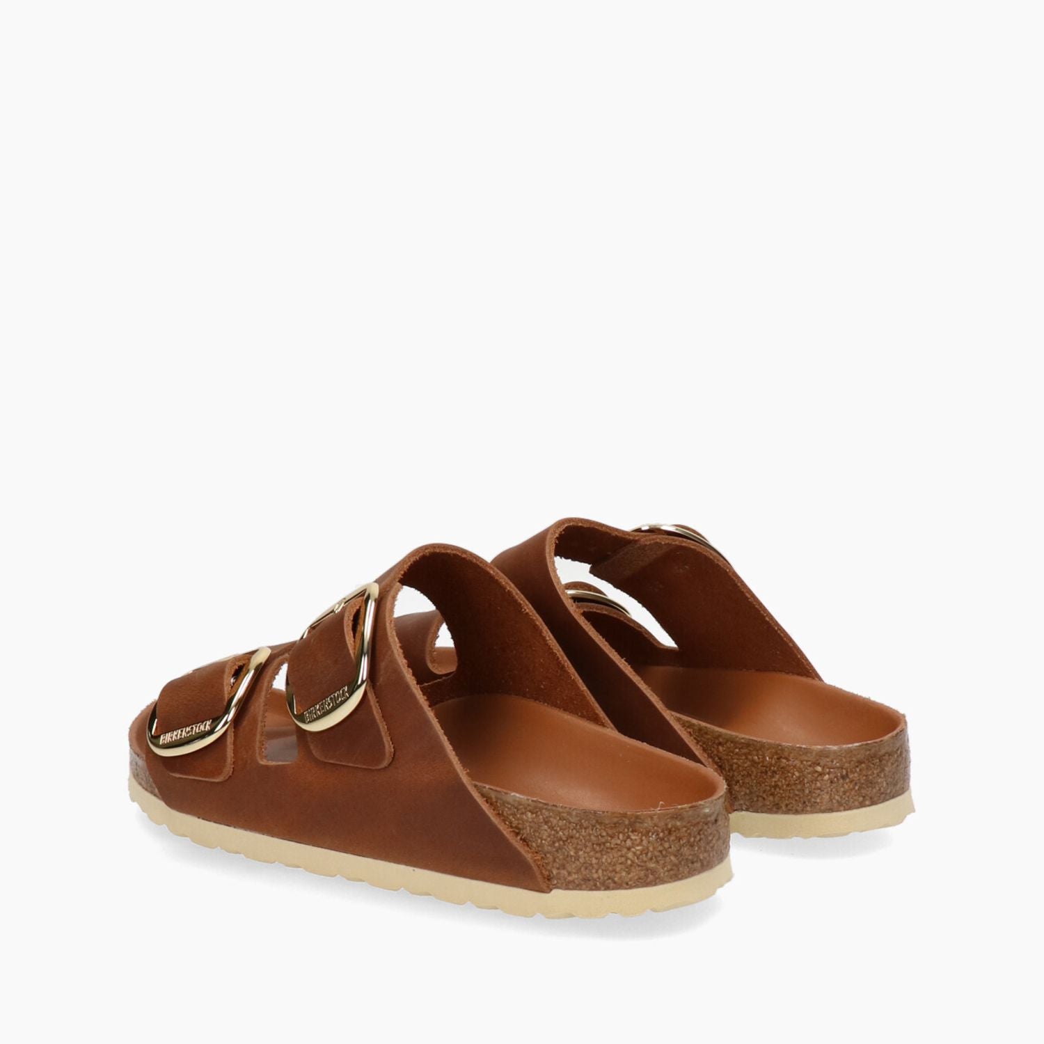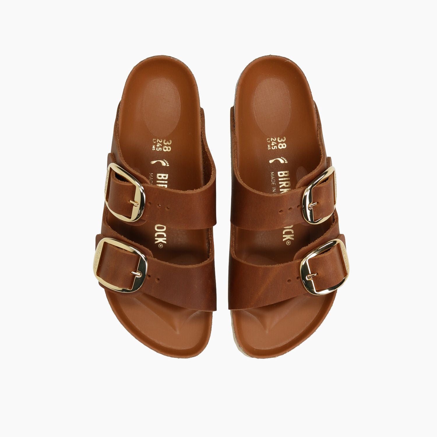 Arizona Big Buckle Lederpantoffeln. Cognacbraun. Runde Zehenpartie. Riemenverschluss mit Metallschnalle. Schmale Passform. Lederfutter. Gummisohle. Birkenstock Damenkollektion.