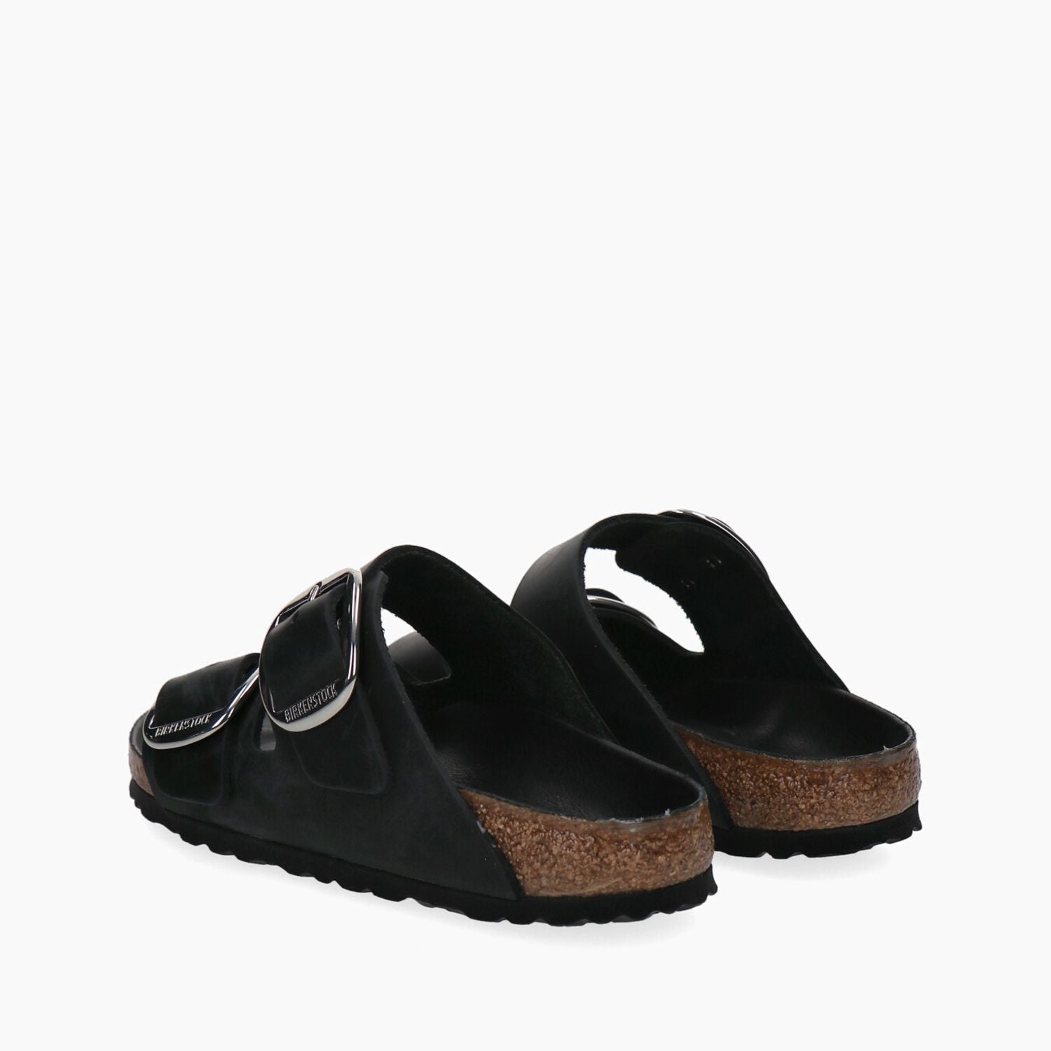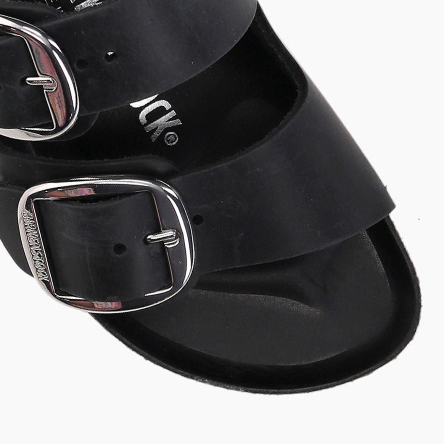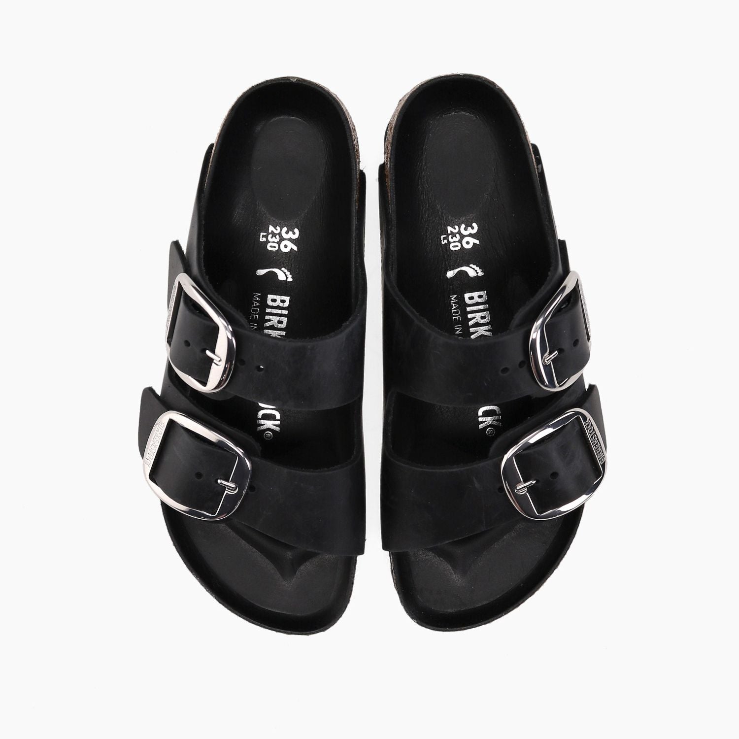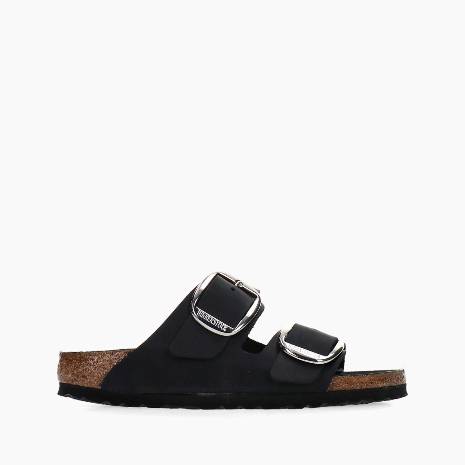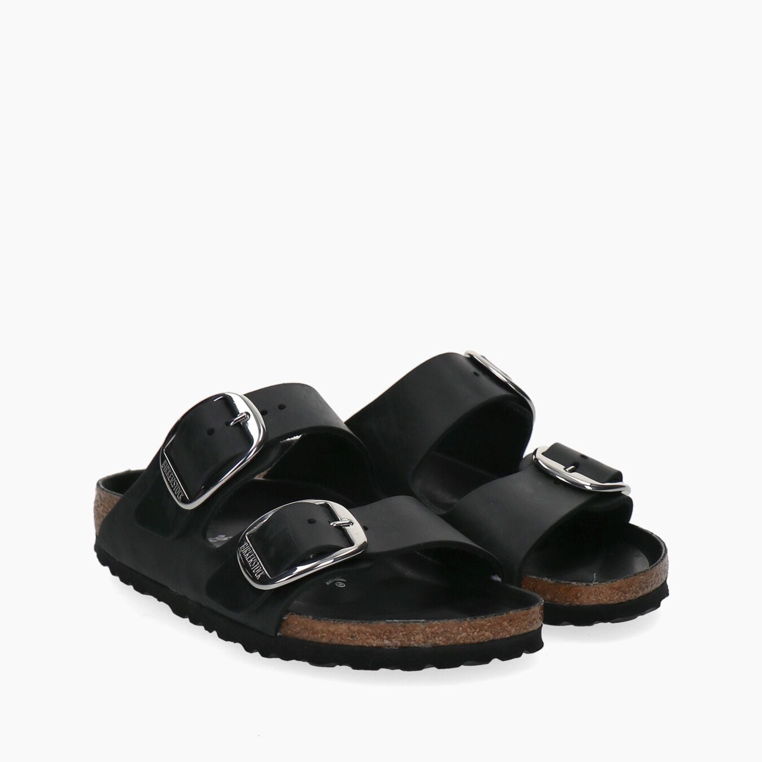 Schwarze Lederpantoffeln mit doppelter silberner Maxi-Schnalle, Fußbett mit schwarzem Leder bezogen, Gummisohle.