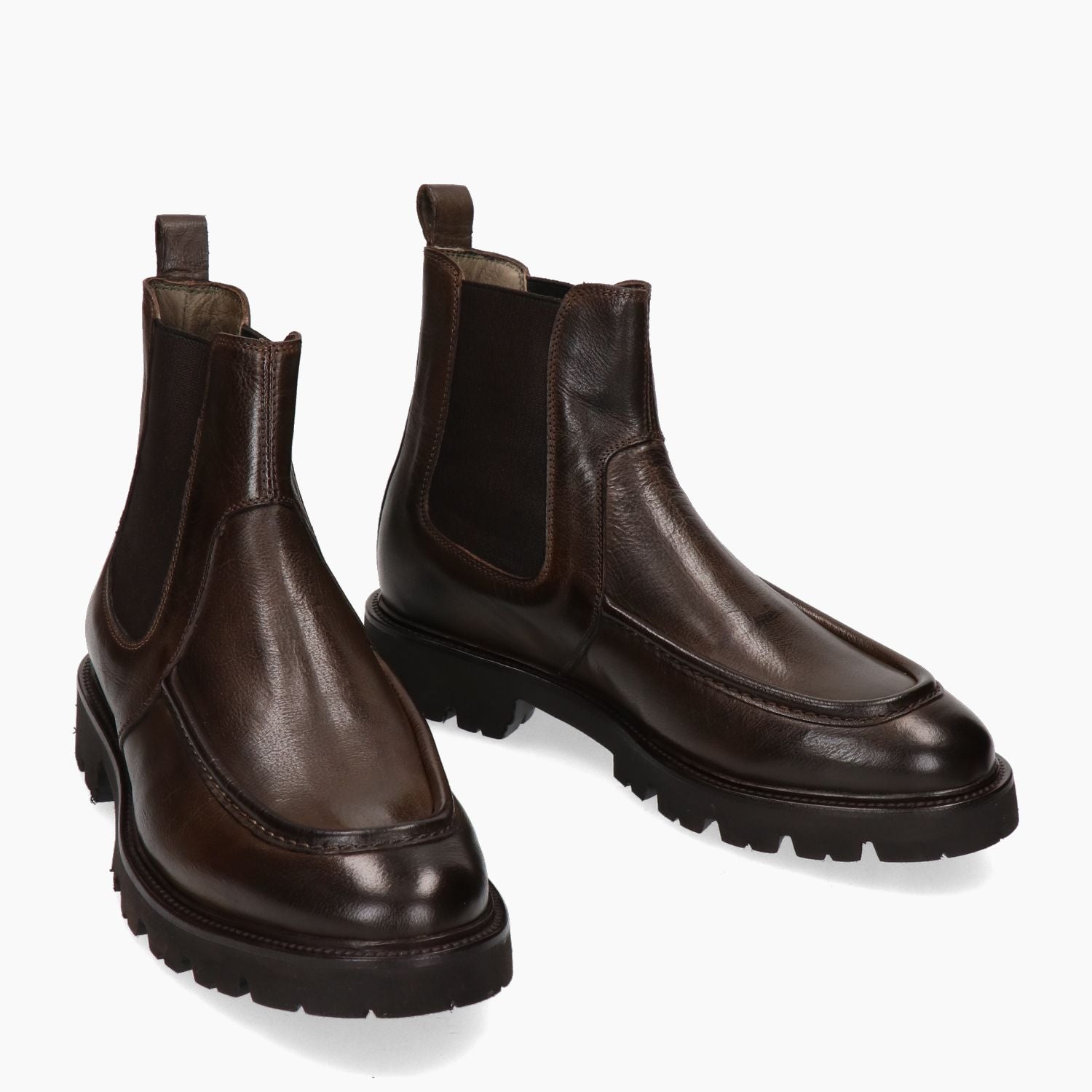 Beatles-Sneaker aus braunem, abgenutztem Leder mit schwarzen elastischen Seiten. Lederfutter. XL-Gummisohle mit Mikroporenprofil und griffiger Sohle. 3 cm Absatz. Brecos Herren-Herbst-/Winterkollektion.