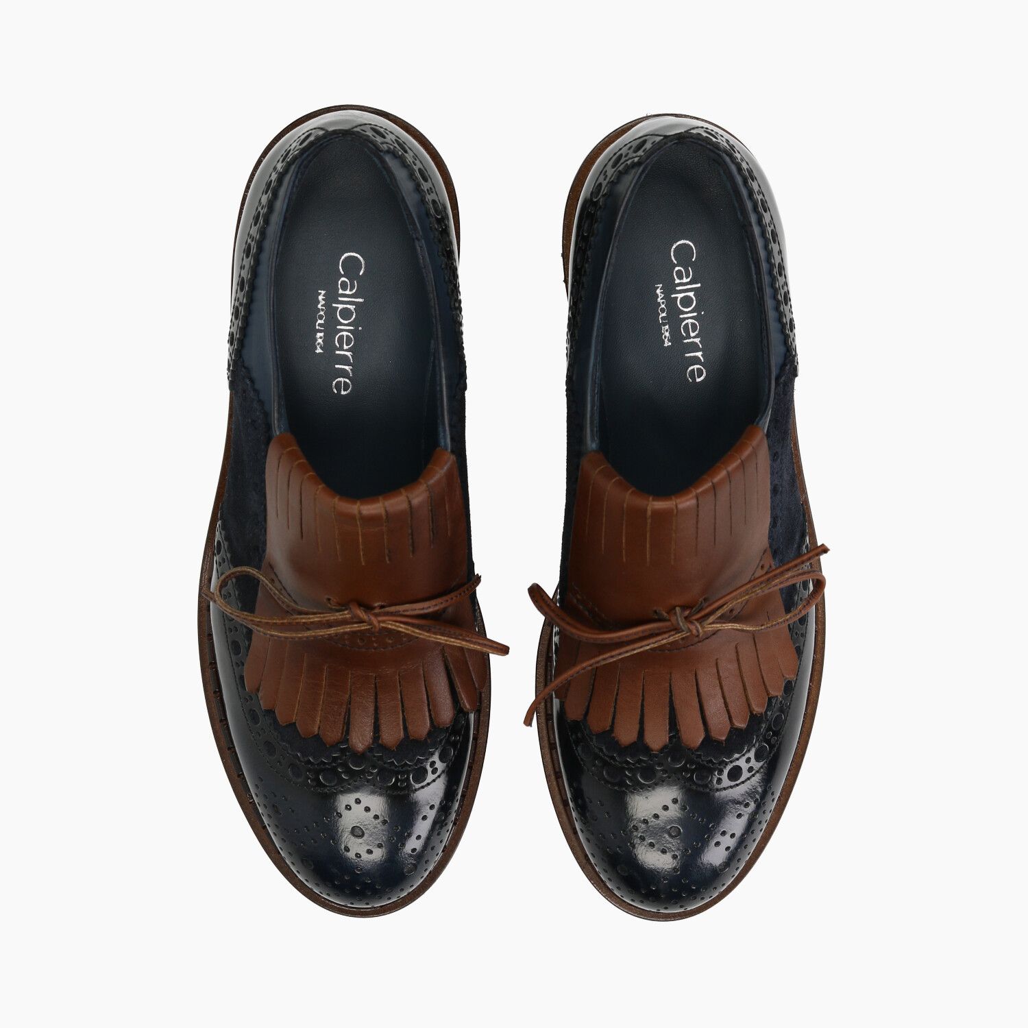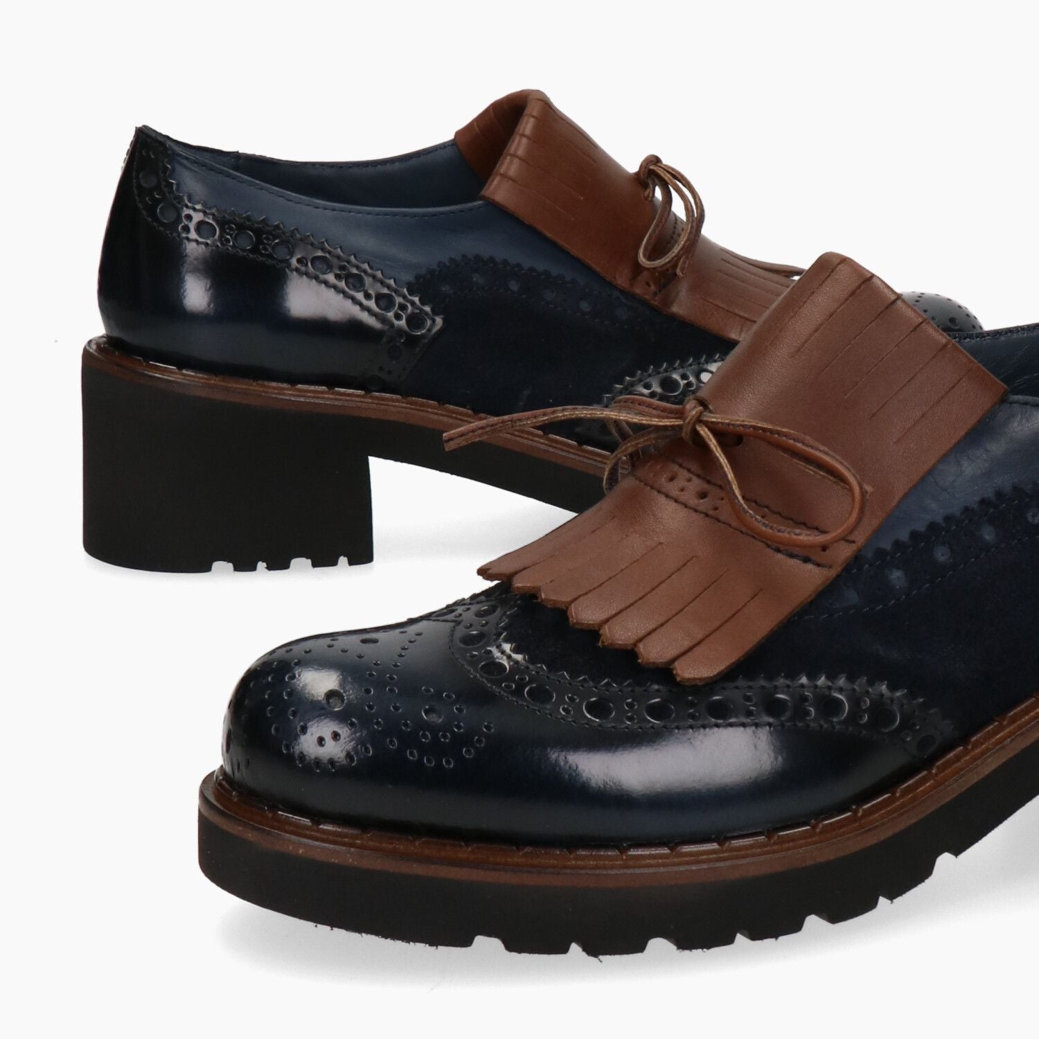 Blaue Lederstiefelette mit englischem Schwalbenschwanzverschluss, braunen Lederfransen und Schnürung, Gummisohle.